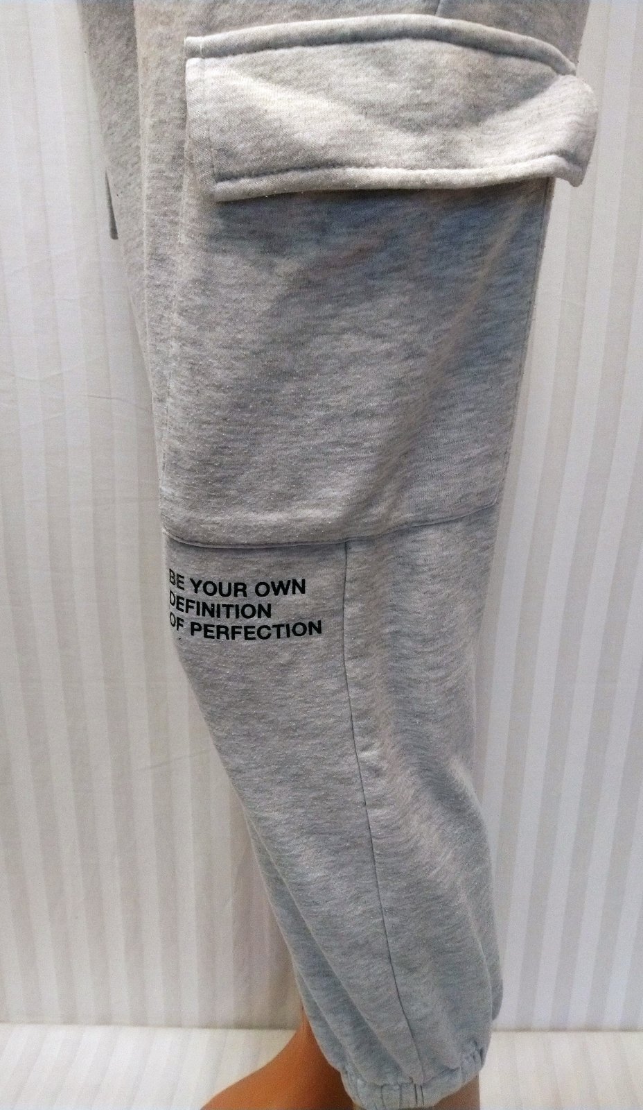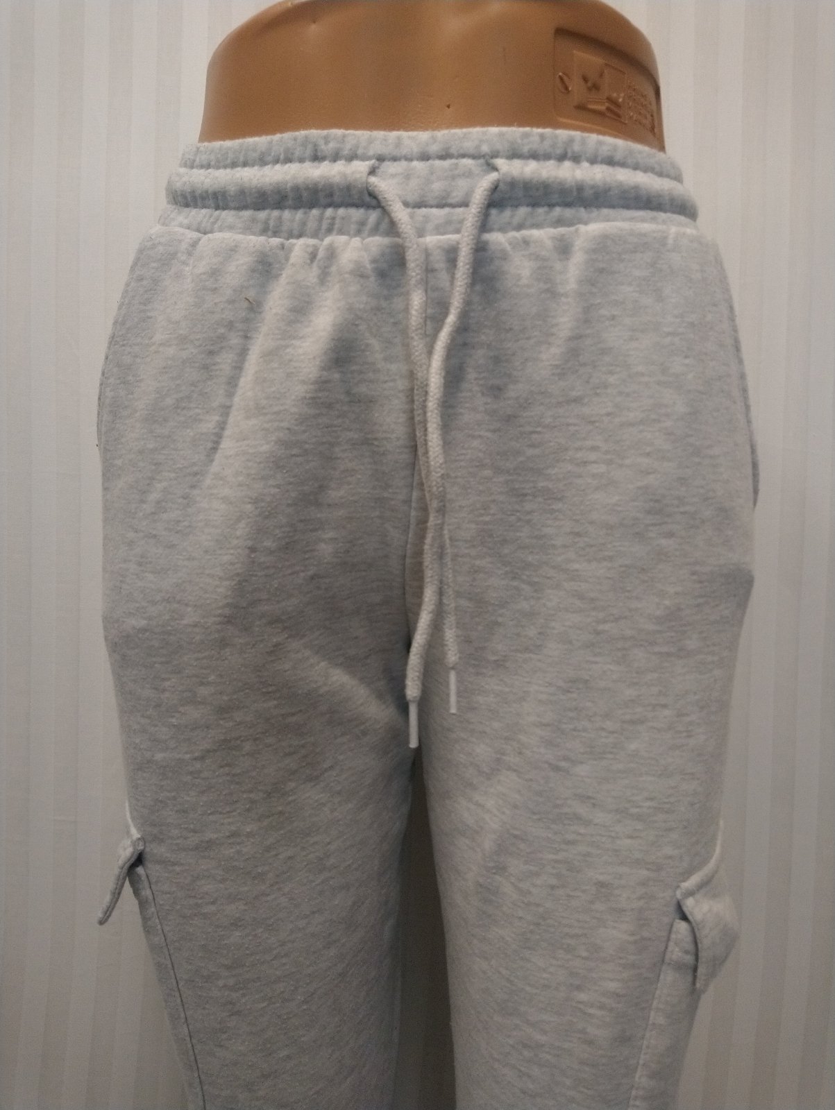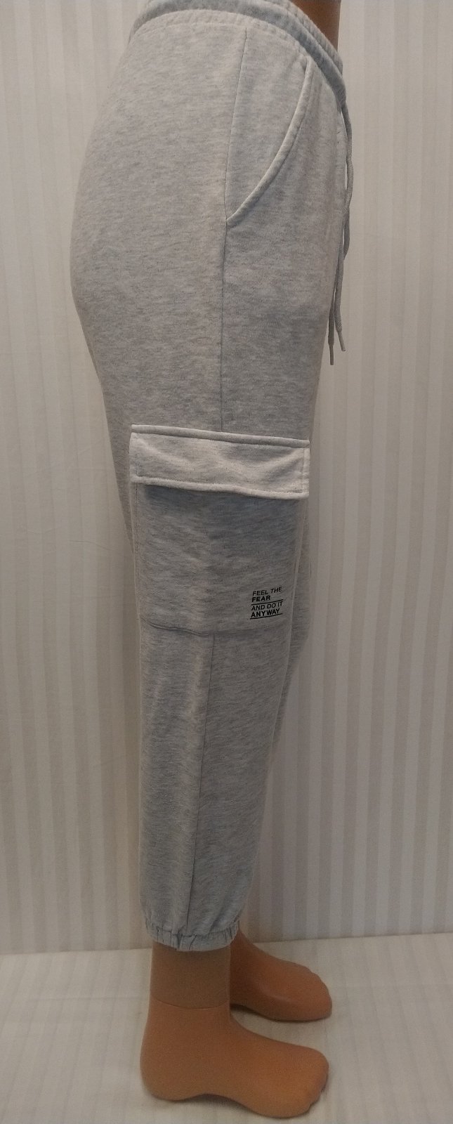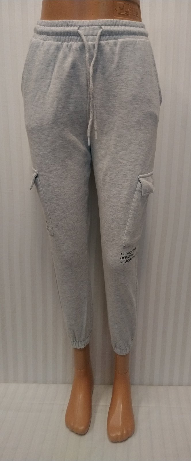 dámske svetlo sivé tepláky v páse guma + šnúrka na zaviazanie, nohavice zakončené dole do gumičky, vrecká hore, vrecká na bokoch nohavíc, nápis,