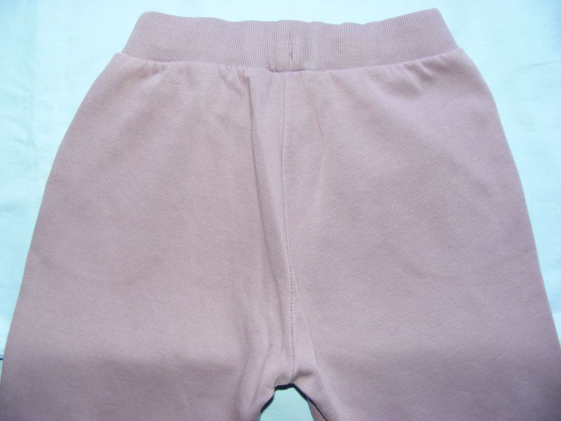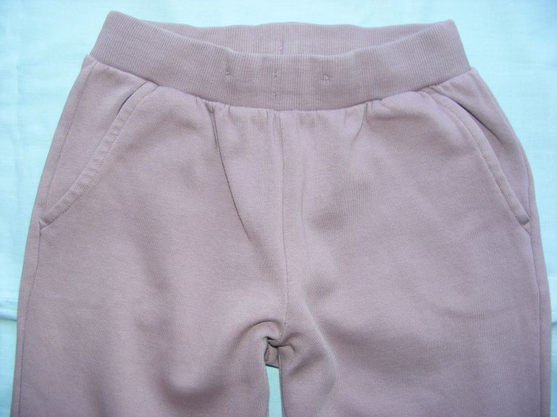 Tepláky zn. Lindex, pružný pás, v páse regulovateľná guma, bočné funkčné vrecká, dolu ukončené do pružného patentu. Farba staroružová. Materiál 78% bavlna, 22% polyester.