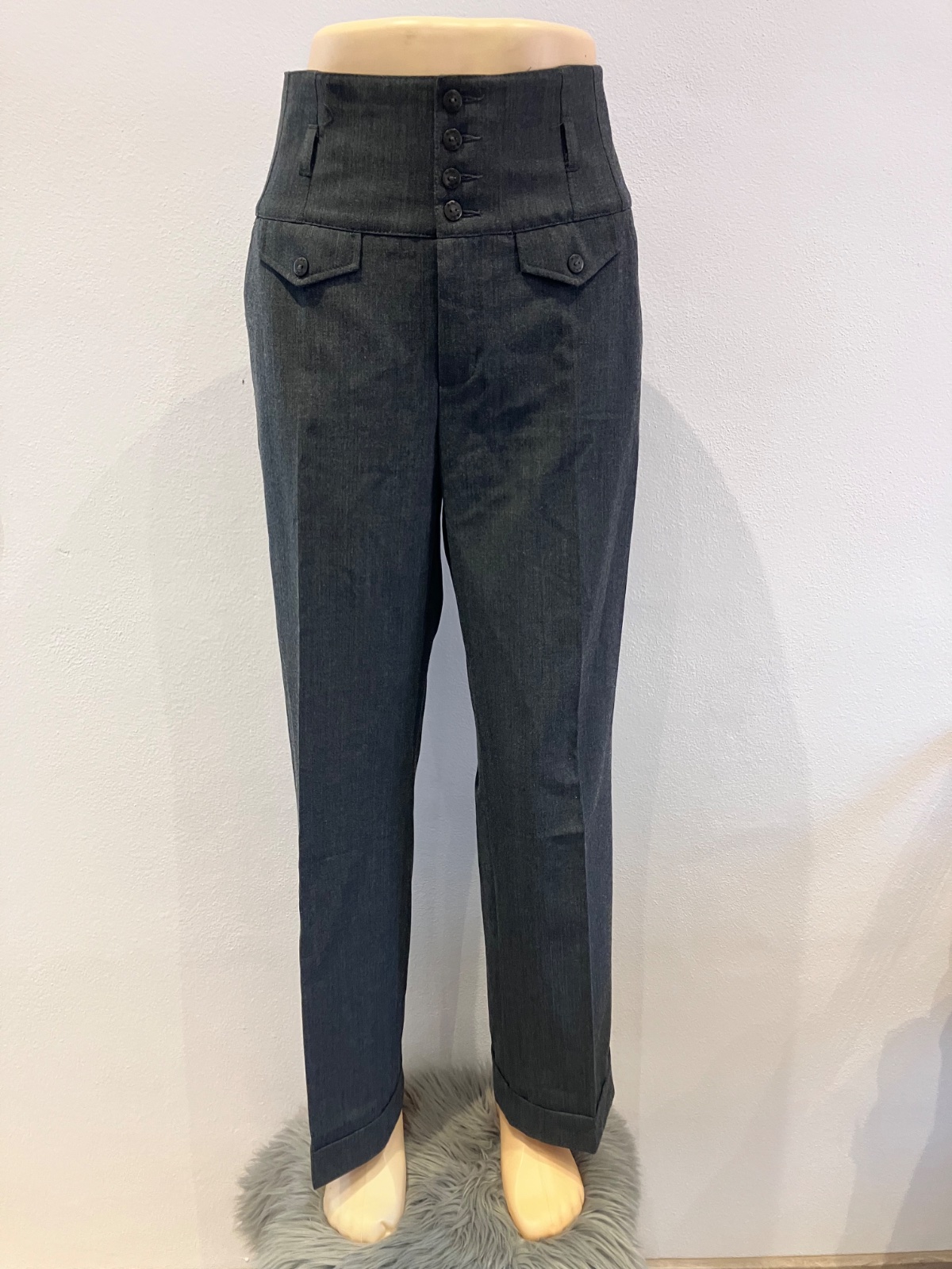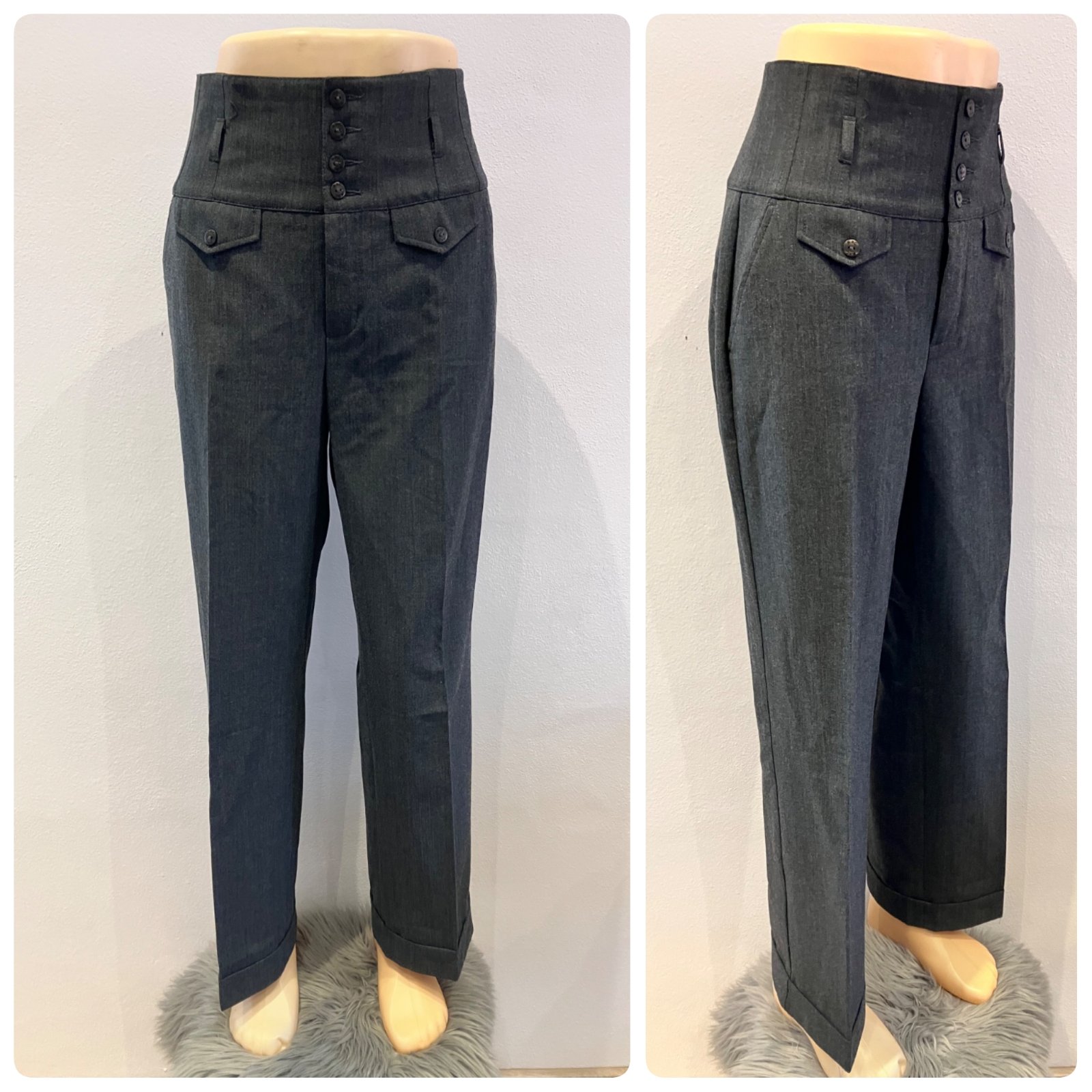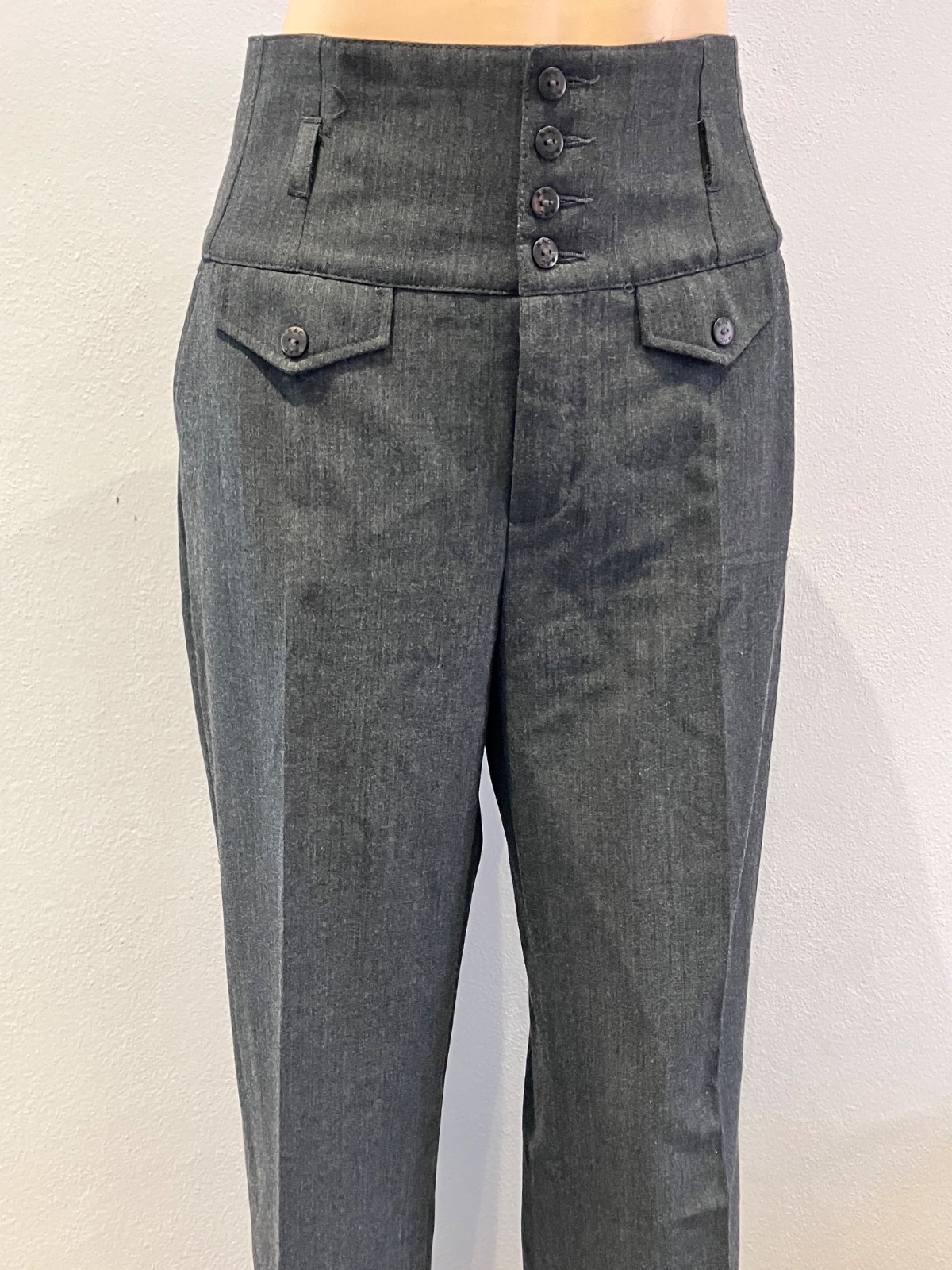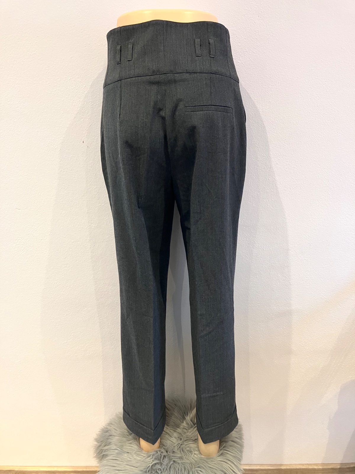 Dámske elegantné sivé nohavice s vysokým pásom, jemne elastické, zapínanie na zips a na 4 gombíky, pútka na opasok, dve bočné vrecká a jedno zašité vrecko vzadu, materiál 63%polyester 33%viskóza 4%elastan.