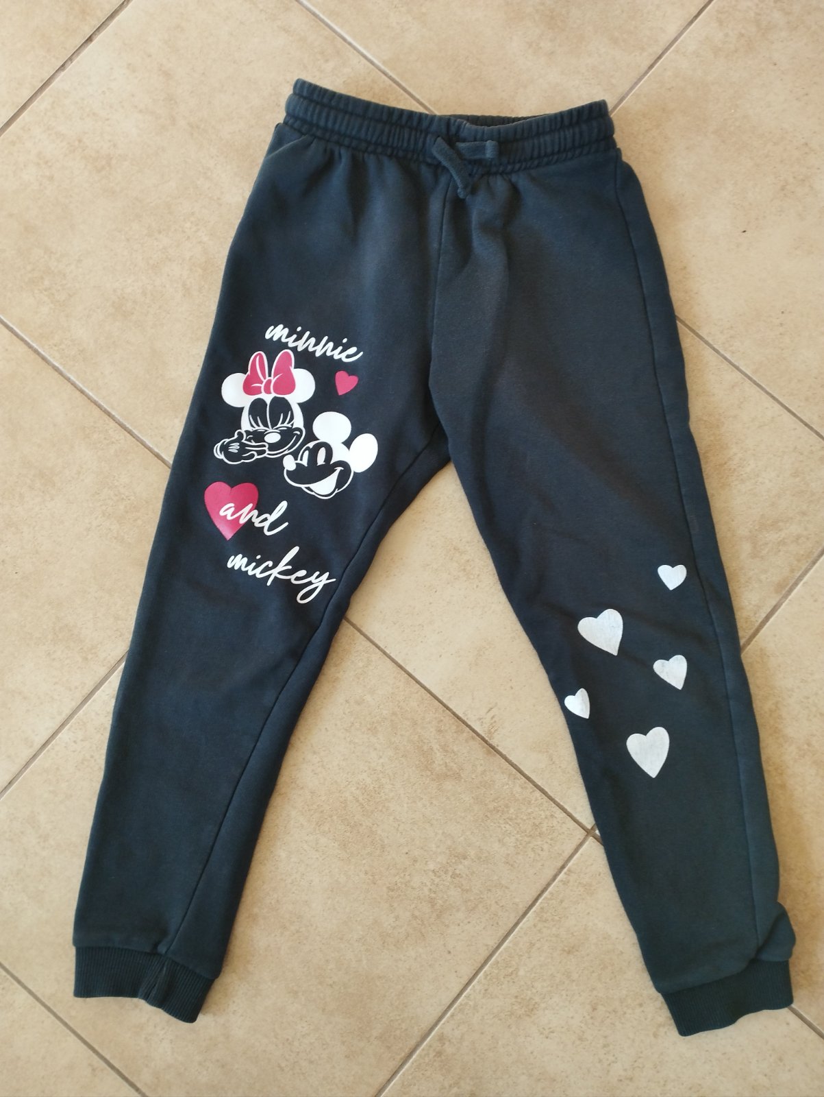 Teplaky sú mäkučke, sú v dobrom stave,na kolene je vyšitá Minnie s mašlou,na druhom kolene nápis.V páse na gumu aj šnurku.