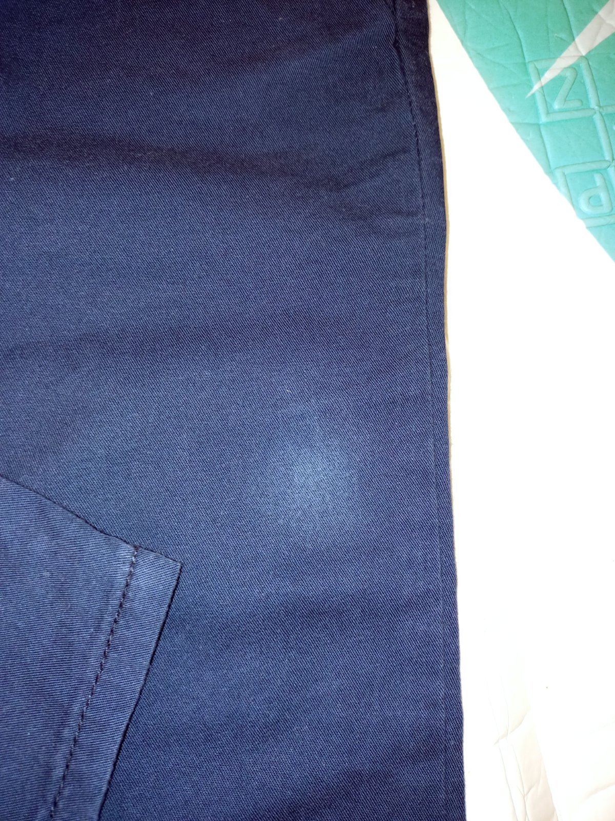 Spoločenské nohavice, tenkého materiálu s reguláciou v páse (dá sa gumičkou nastaviť užší pás). Na ľavej nohe pri kolene vyšúchané miesto (viď foto). V skutočnosti menej viditeľné, blesk to zvýraznil.
