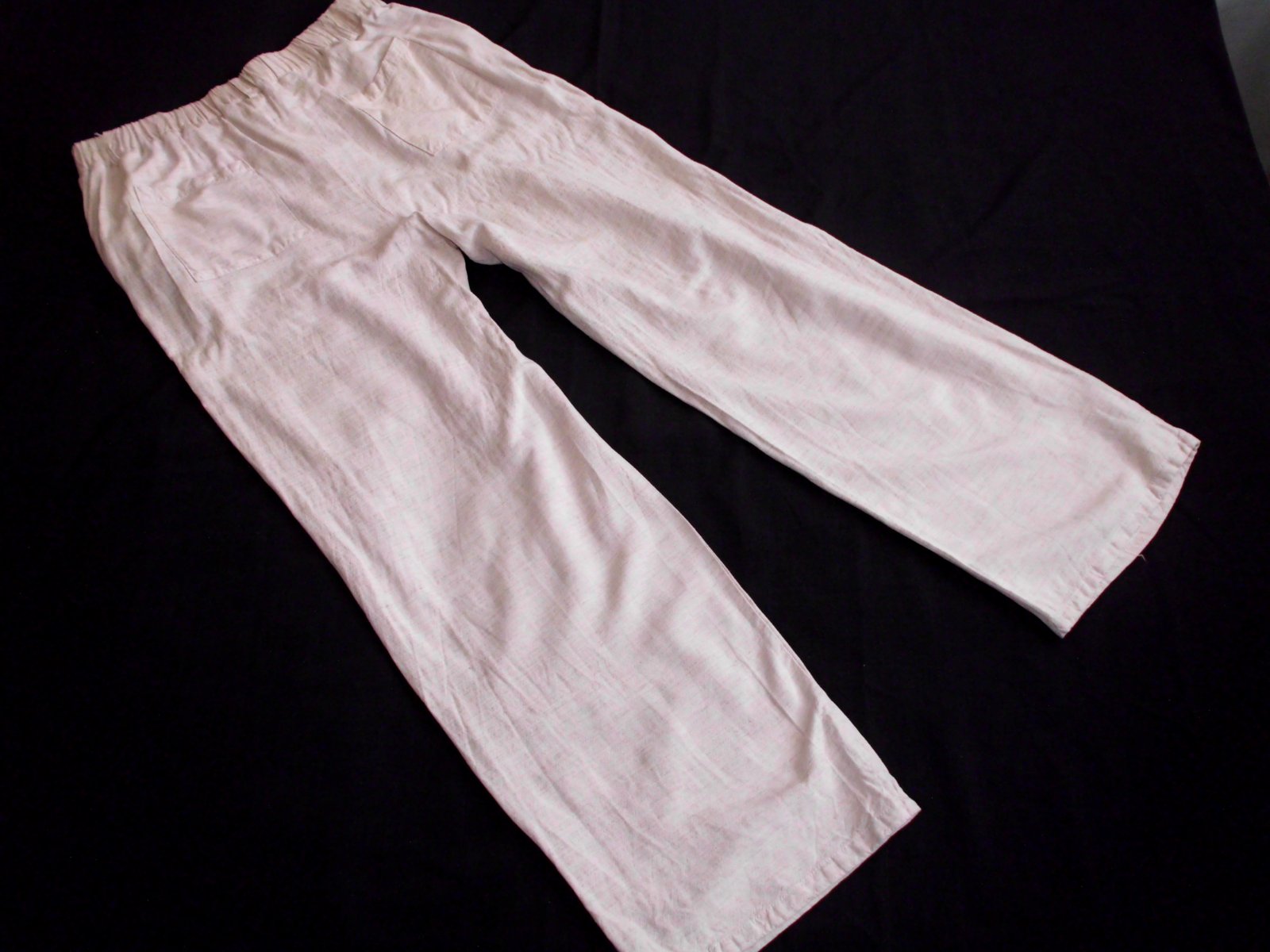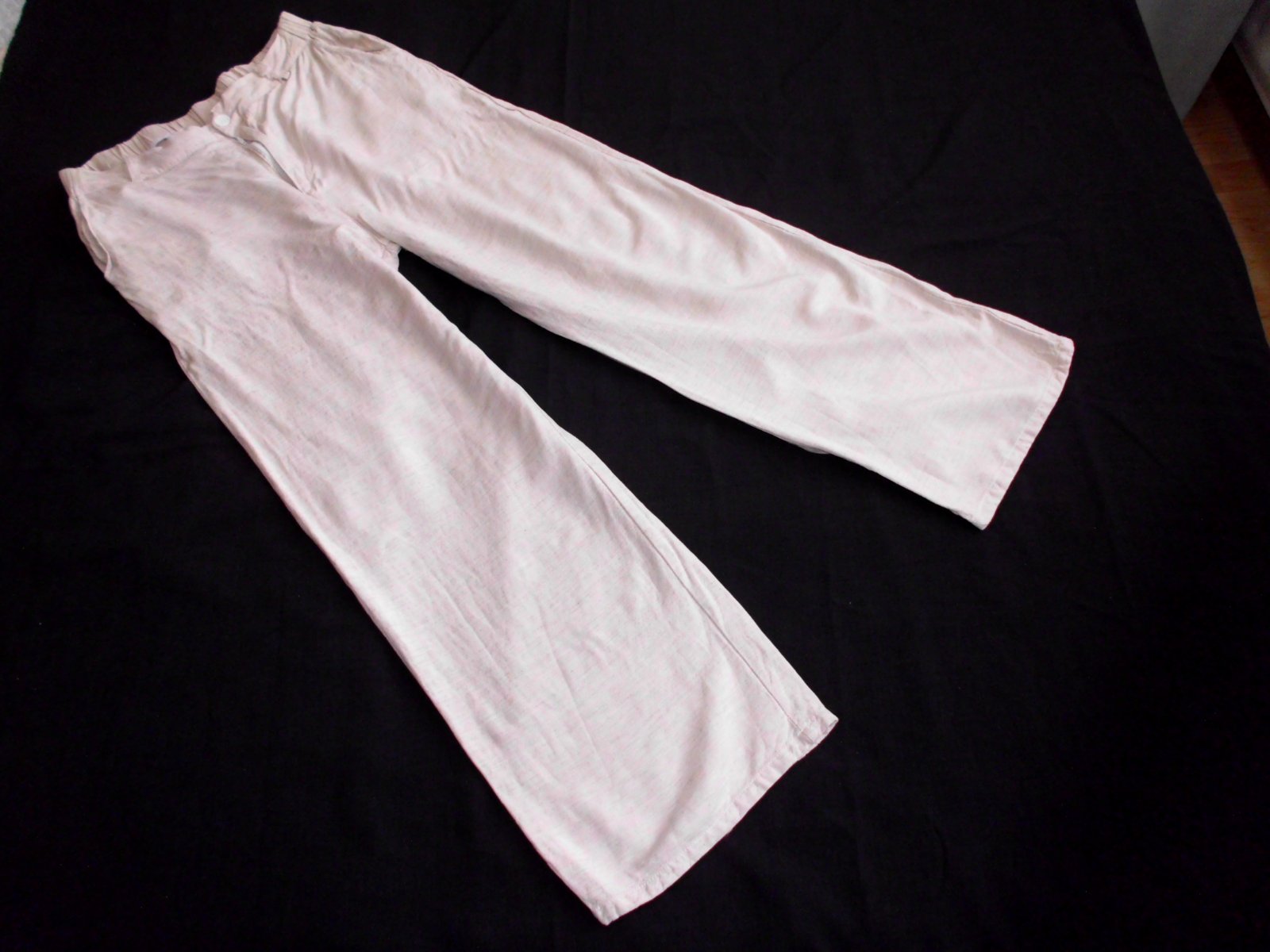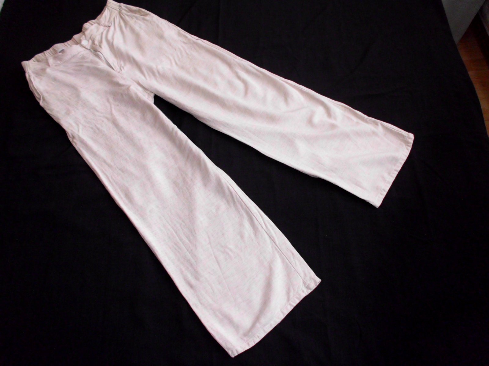 Predám dámske širšie letné nohavice , velkosť L ale skôr na M, pás širka 39 cm vzadu guma , bočná dlžka 100 cm , výška predného sedu 32 cm ,zadný sed 40 cm, spodok š. 25 cm, stehno 29,5 cm, 4 vrecká , veľmi príjemná padavá látka 30% ľan, béžová farba , raz prané, top 100% stav