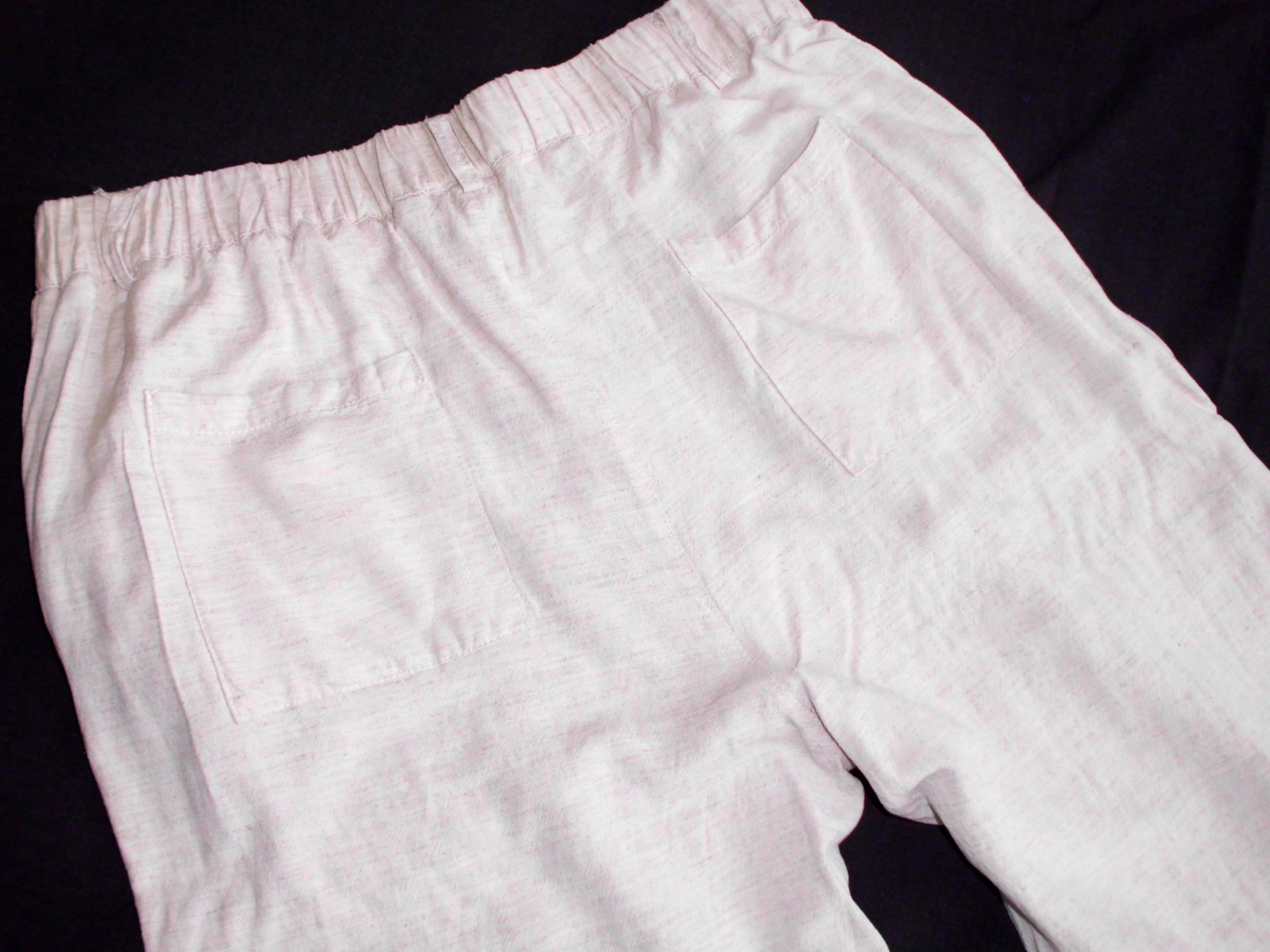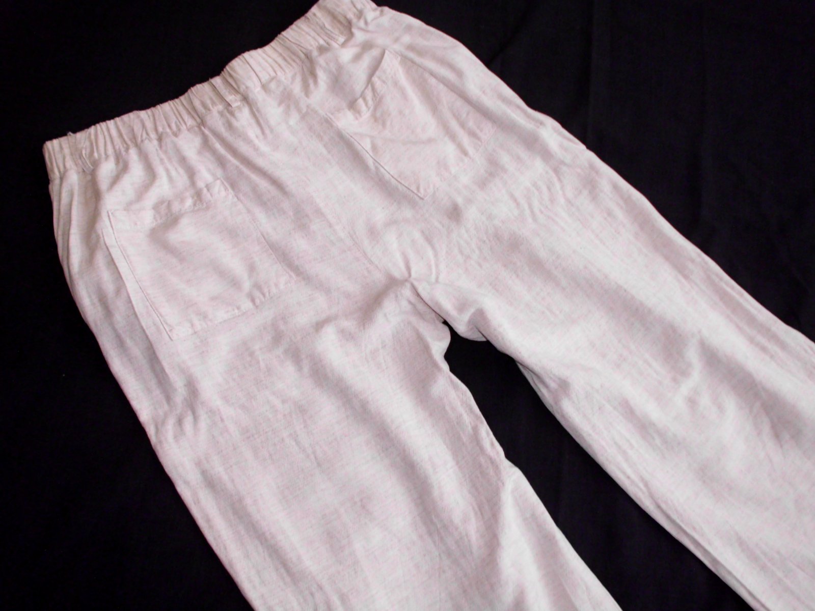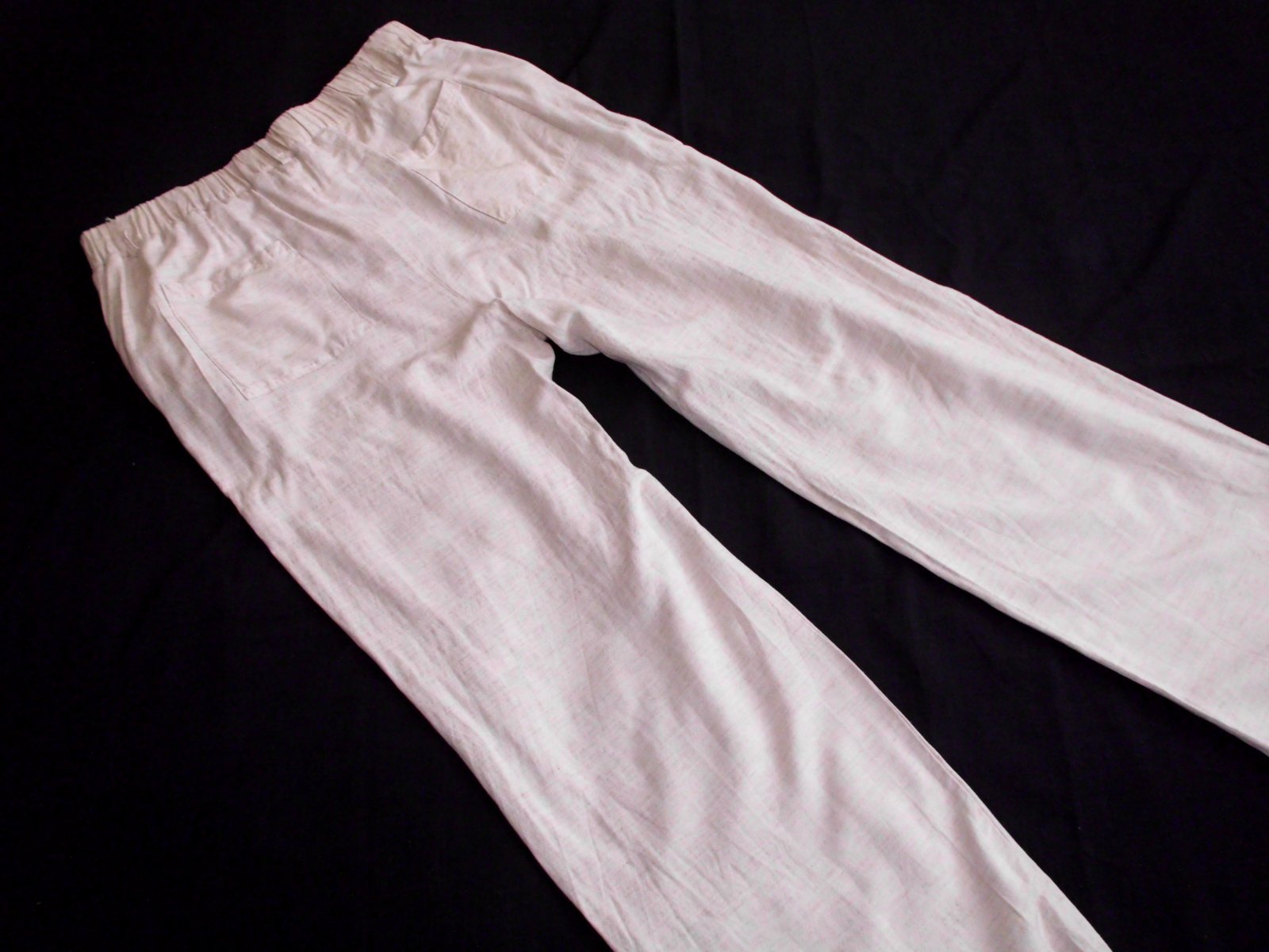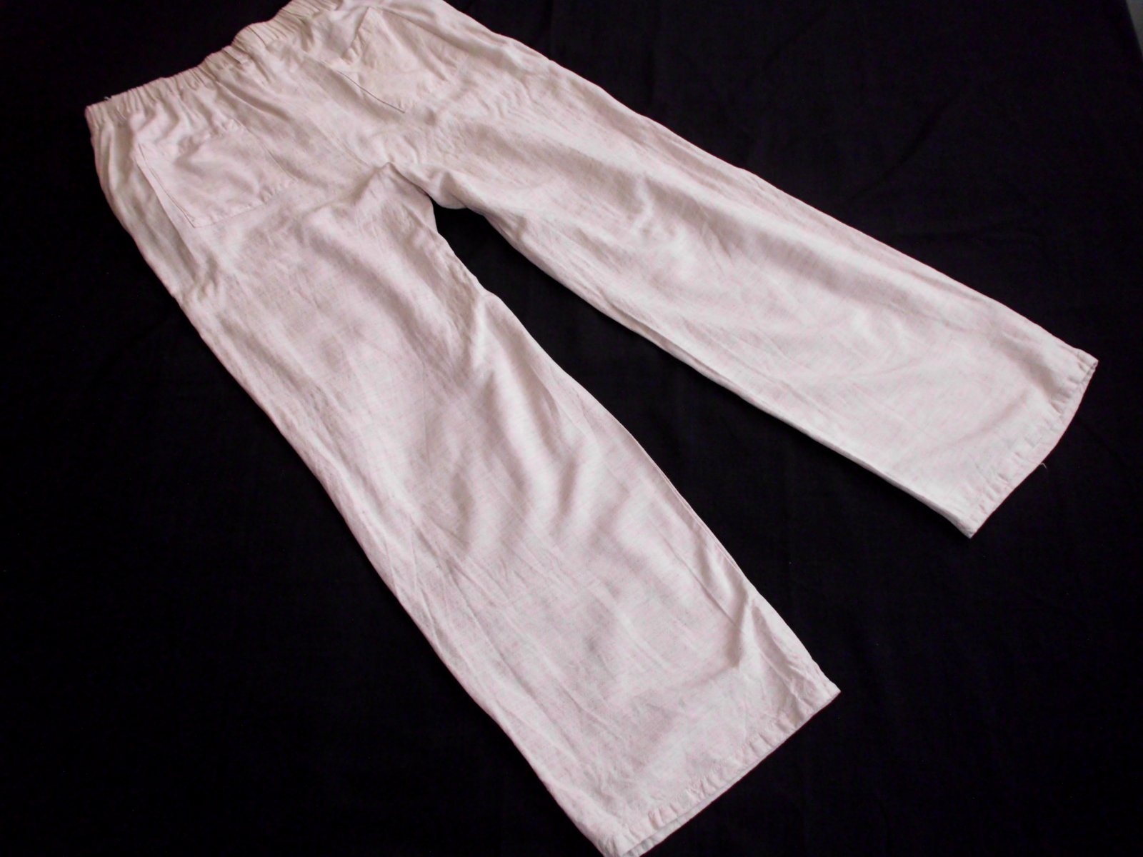 Predám dámske širšie letné nohavice , velkosť L ale skôr na M, pás širka 39 cm vzadu guma , bočná dlžka 100 cm , výška predného sedu 32 cm ,zadný sed 40 cm, spodok š. 25 cm, stehno 29,5 cm, 4 vrecká , veľmi príjemná padavá látka 30% ľan, béžová farba , raz prané, top 100% stav