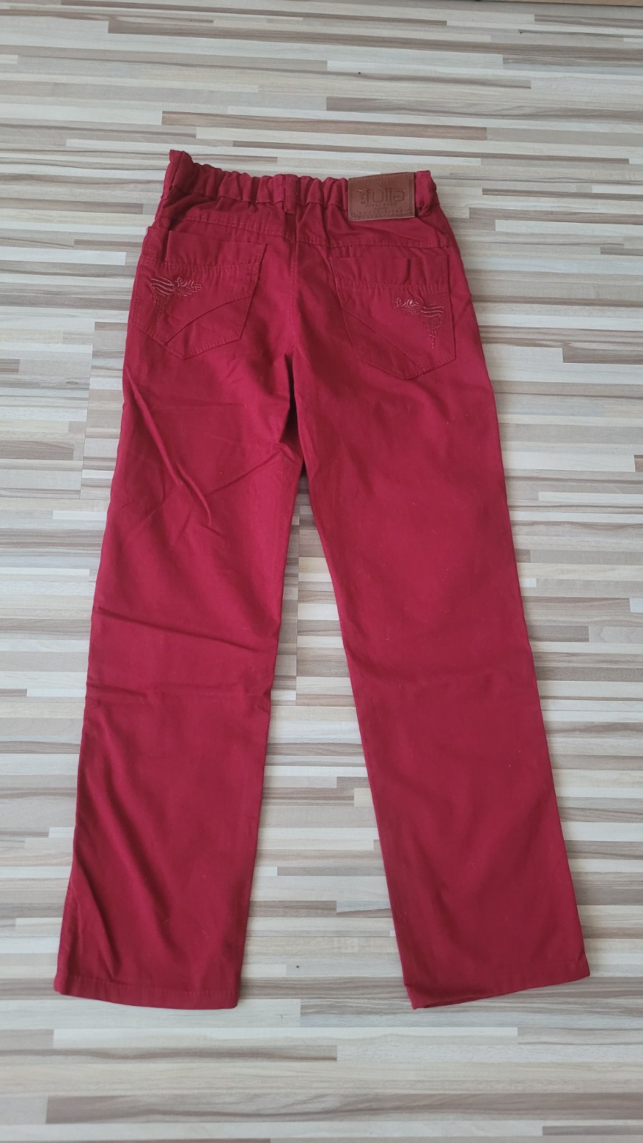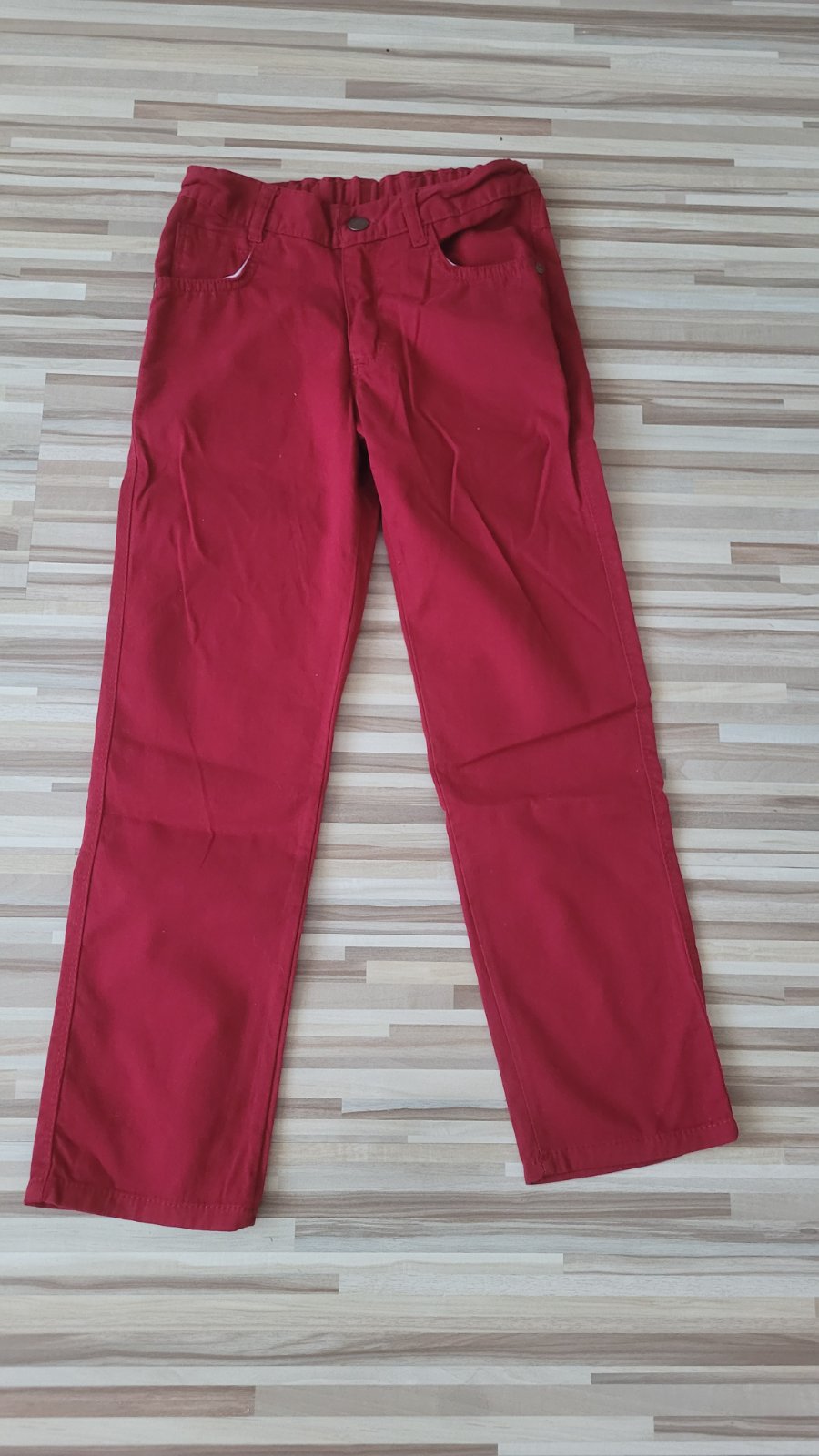 Tensie nohavice. Velkost odhadom 134/140. V pripade zaujmu premeriam. V pase stahovacia guma. Na fotkach je farba cervena, no v skutocnosti je taka tmavsia, do bordova