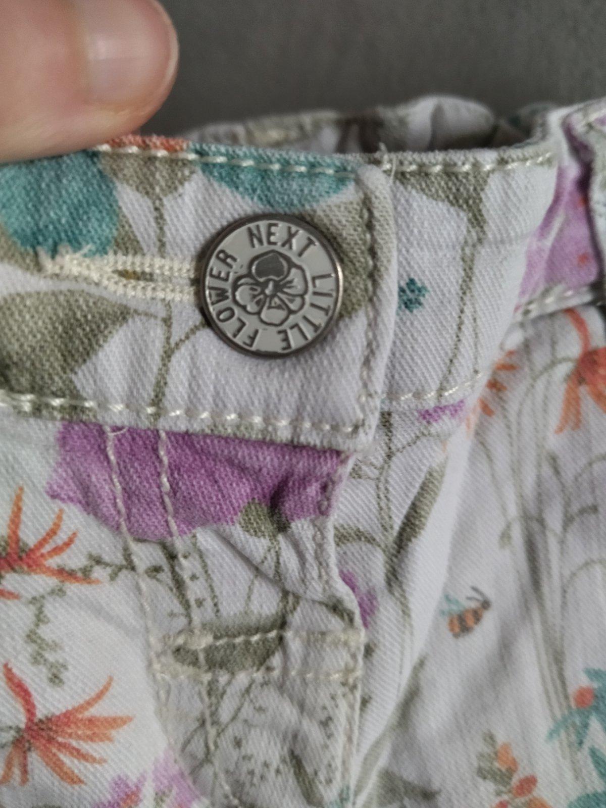 Riflove nohavice biele s potlacou fialkovych kvetiniek a jemnych zelenych listkov, rovny strih, moznost regulovat v pase, veľkosť 1.5 -2 roky, top stav.