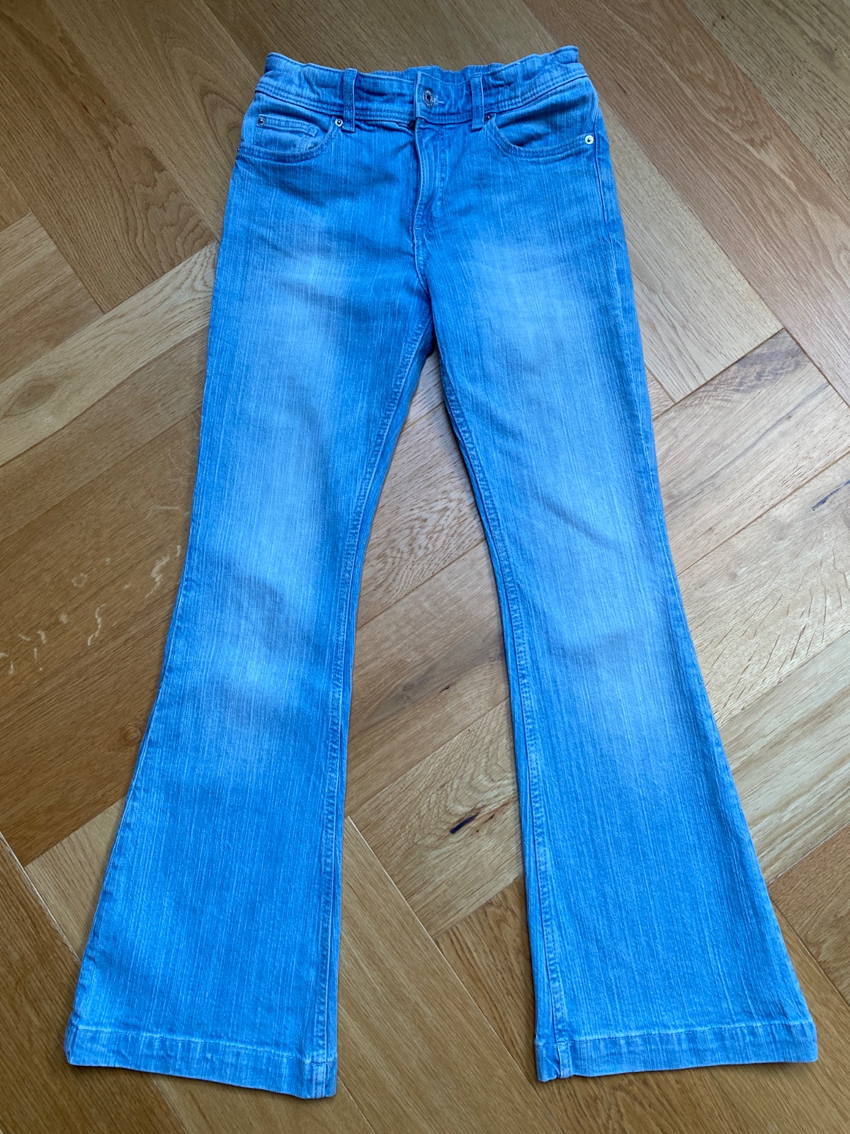 Veľkosť 11-12 rokov, mäkké džínsy z pružného bavlneného denimu s úzkym strihom v oblasti bokov a stehien, zvonový strih na zvyšku nôh, nastaviteľná guma v páse, top stav, žiadne známky nosenia