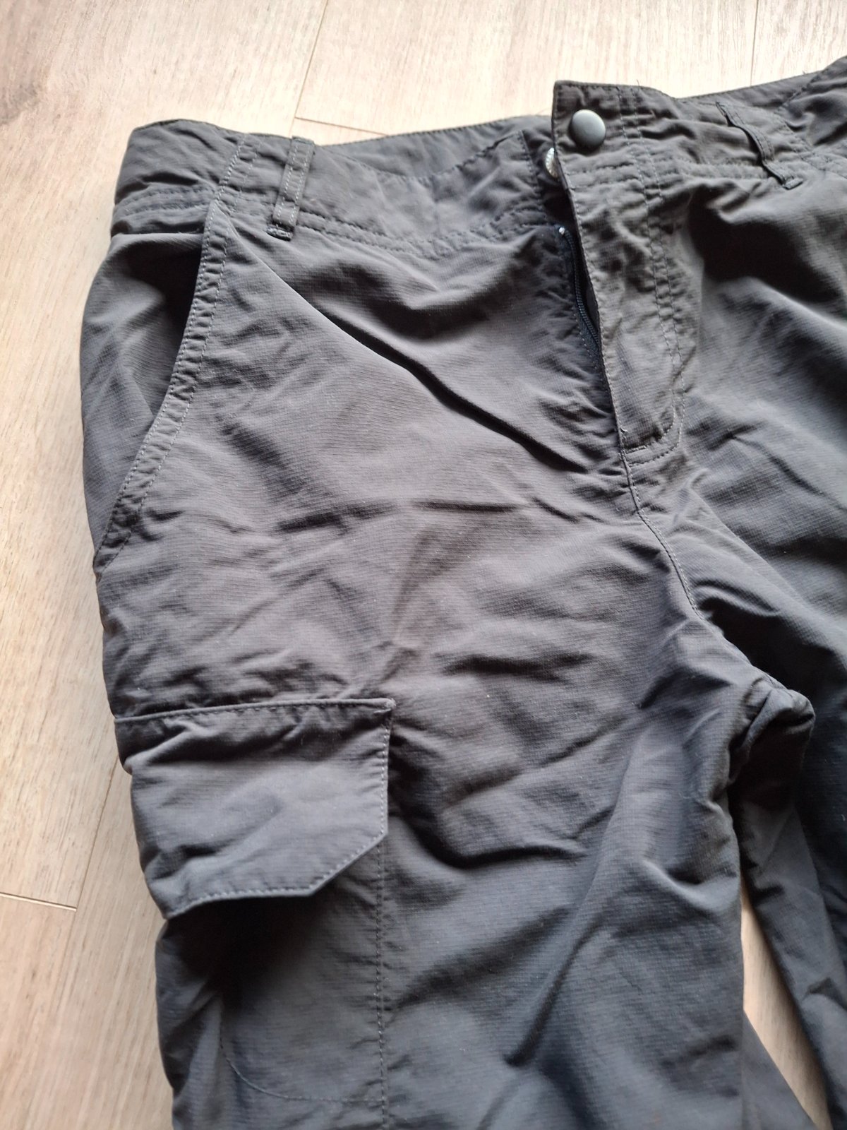 Výborná ľahké, rychloschnuce turistické nohavice, možnosť rýchlo odpisovať na krátke nohavice, dokedy pomocou suchého zipsu možnosť zúžiť pri členku, pas regulovateľný pomocou gumičky. Syn rýchlo vyrástol, boli oblečené len pár krát. Originál veľkosť už na nich nemám, štítok je odstrihnuty. Ale syn mal v čase nosenia veľkosti 146/152. Nemajú žiadne diery ani fľaky. Celková dlzka je 92 cm, vnútorná dĺžka 68 cm, dĺžka kratasov 48 cm. Pas natiahnutý na max 2 x 36,5 cm.