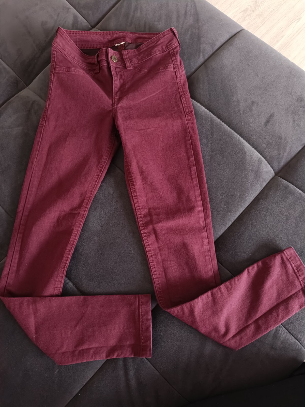 Predám malo nosené dievčenské bordové H&M rifle, super skinny, Denim, veľmi úzky strih - 69%bavlna, 29%polyester, 2%elastan. Rozmery :vonkajšia dĺžka - 87cm, vnútorná dĺžka 67cm, stehna 16cm, spod...
