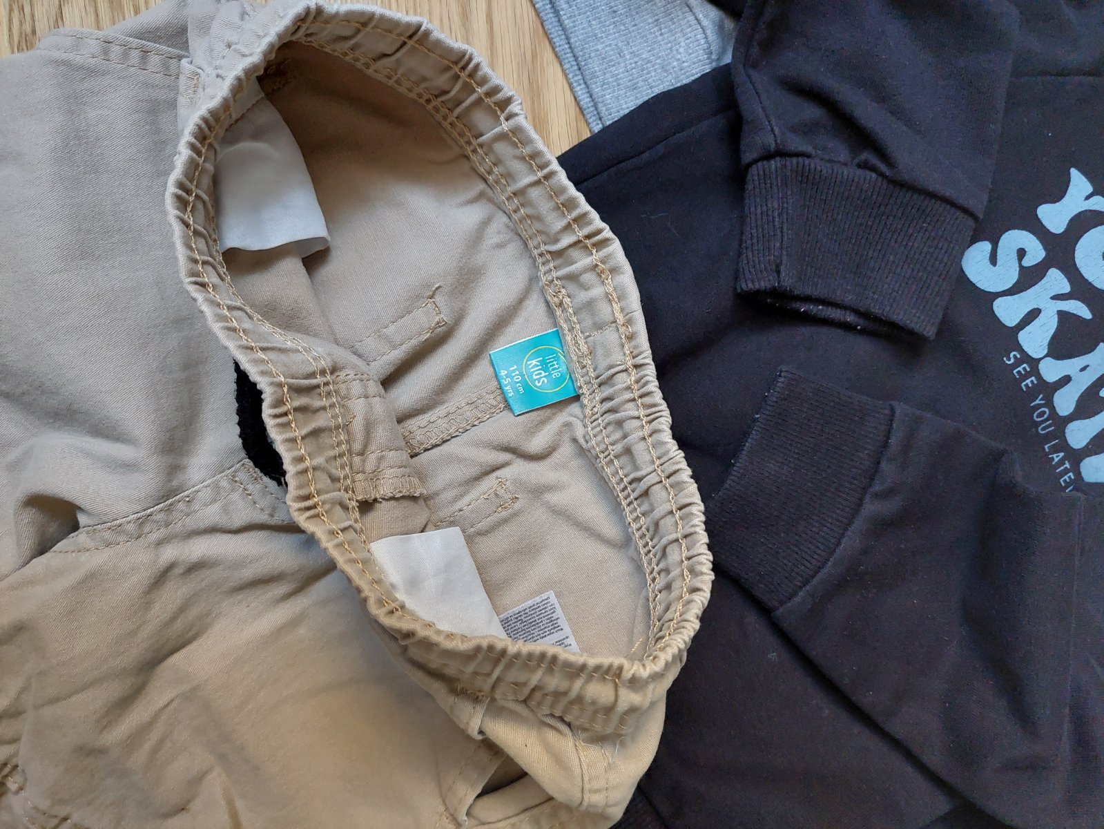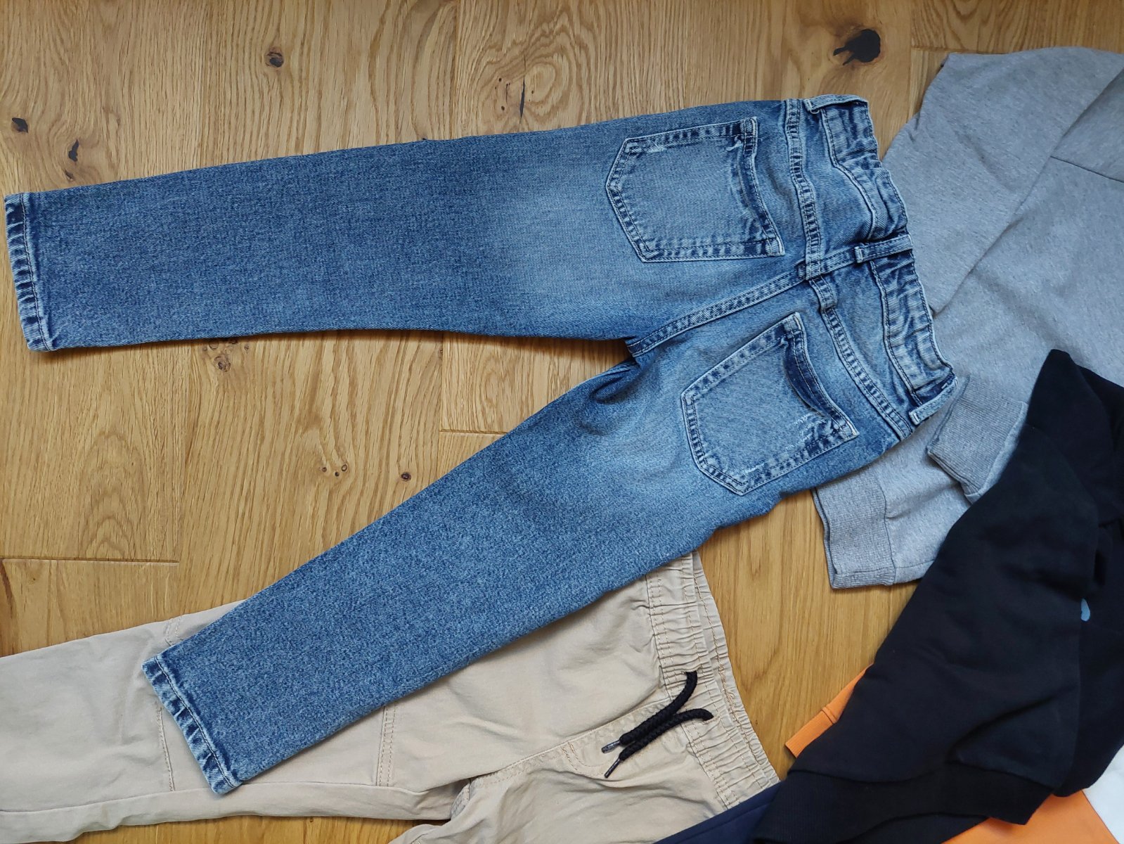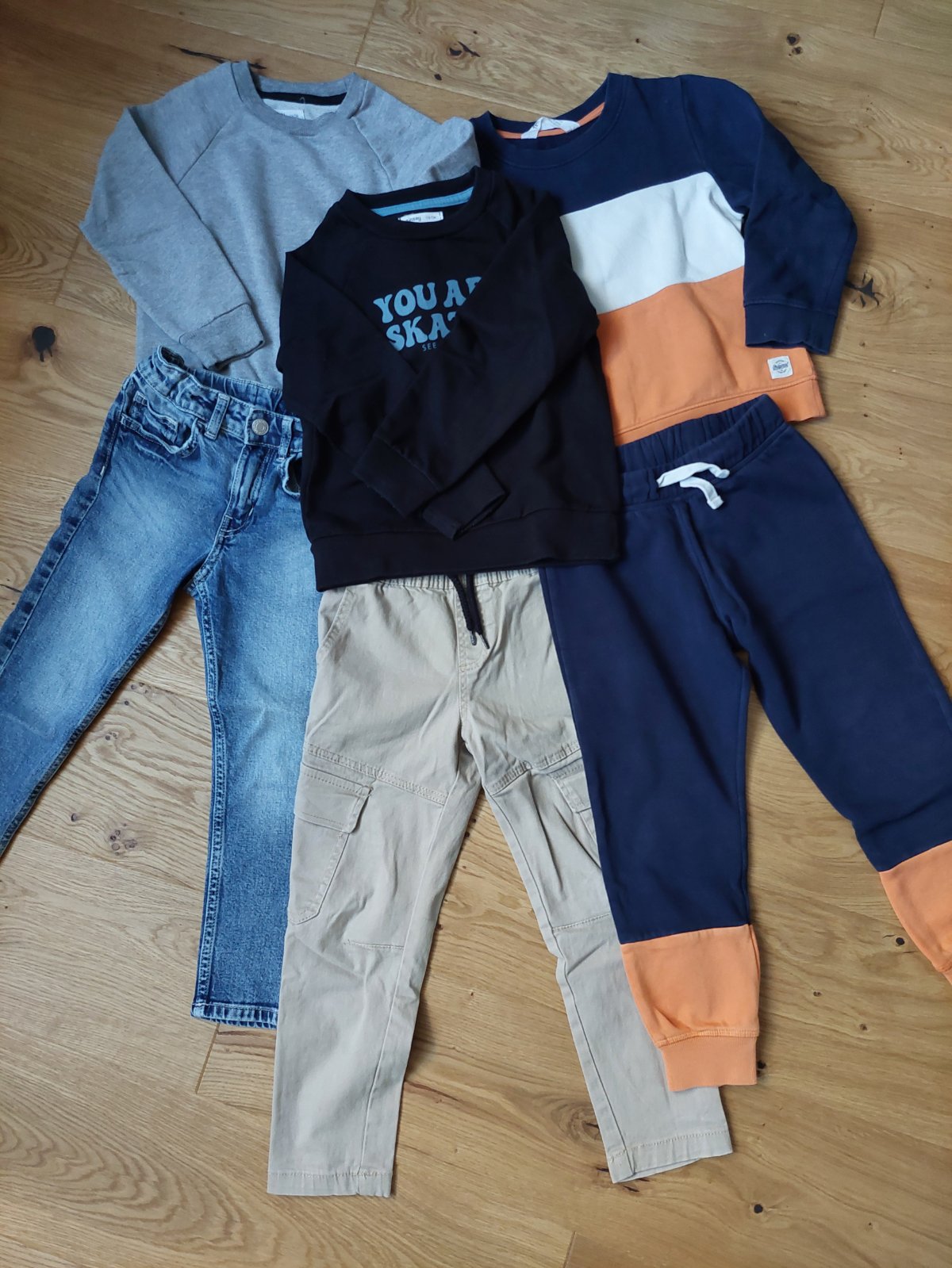 Rifle (H&M) takmer nové - oblečené asi 3x, nohavice (Pepco) to isté. Syn nosí skoro stále tepláky 🤦♀️. Mikiny Sinsay bez poškodení + tepláková súprava (H&M). Veľkosť 110/116