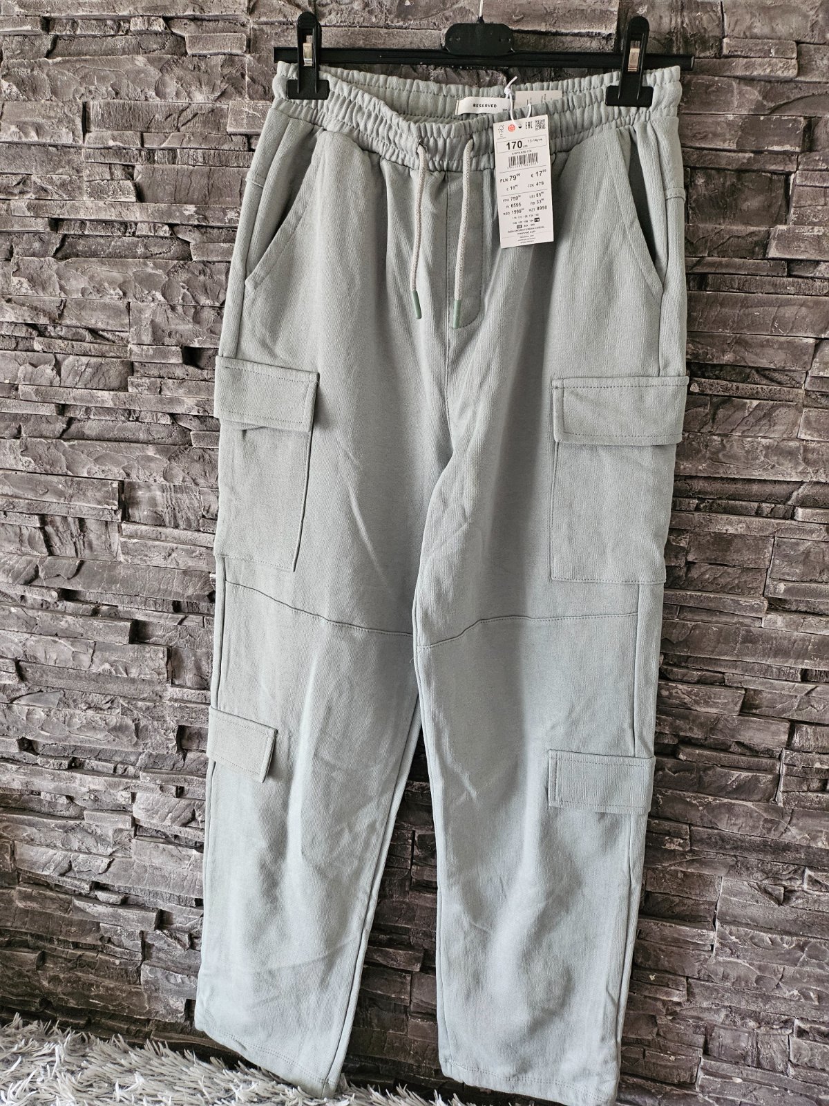 Chino nohavice Reservede zo štruktúrovan ej látky. Zelená farba, predné vrecká, regulovatelný pás. Veľkosť 170. Nové bez štítkov, syn ich nemal ani raz. Dĺžka 101 cm, boky 2*47 cm, pás 2*32 cm me...