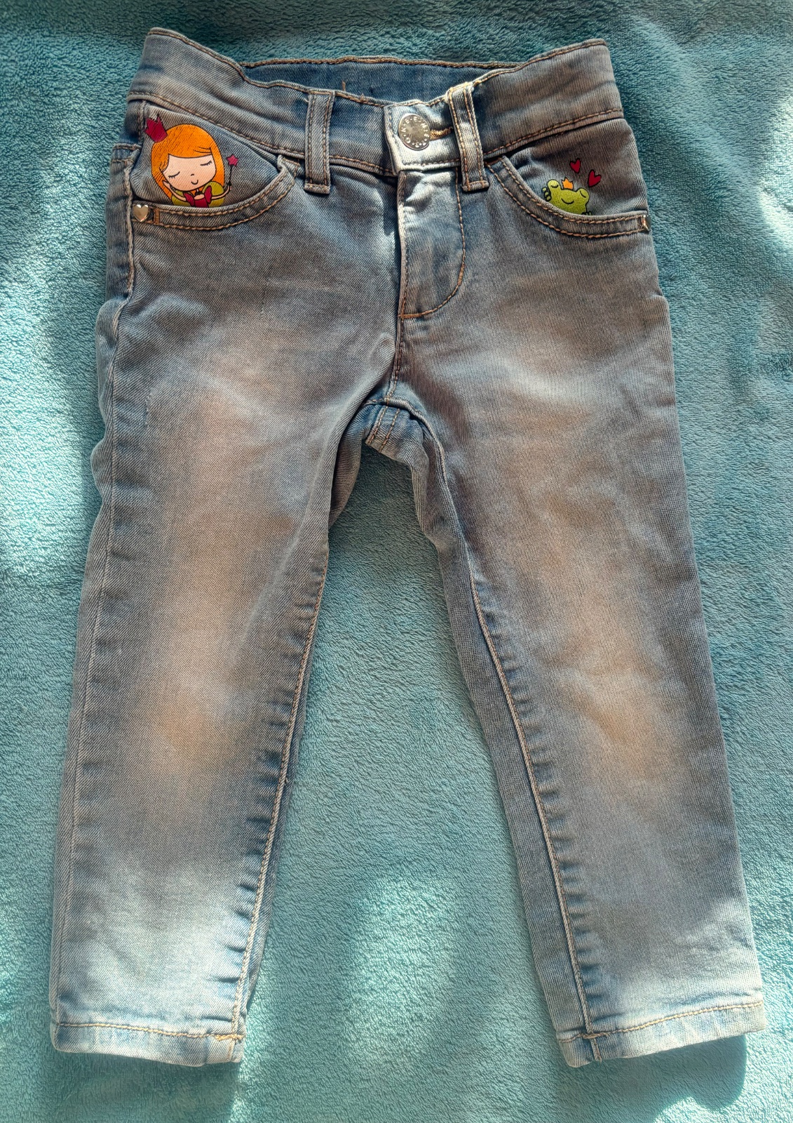 predam krásne rifle s milou aplikáciou vo vreckách (málinko vidieť pranie, viď foto), inak bez poškodenia, pekný rovný strih, úzke. vnútri je aj gumka na nastavenie pásu. krásna farba, riflovina príjemná na dotyk. kvalitný kúsok. nechávala som pre druhé bábo ale bude to chlapec tak musím posunúť ďalej. veľ uvedená 2y, zn benetton