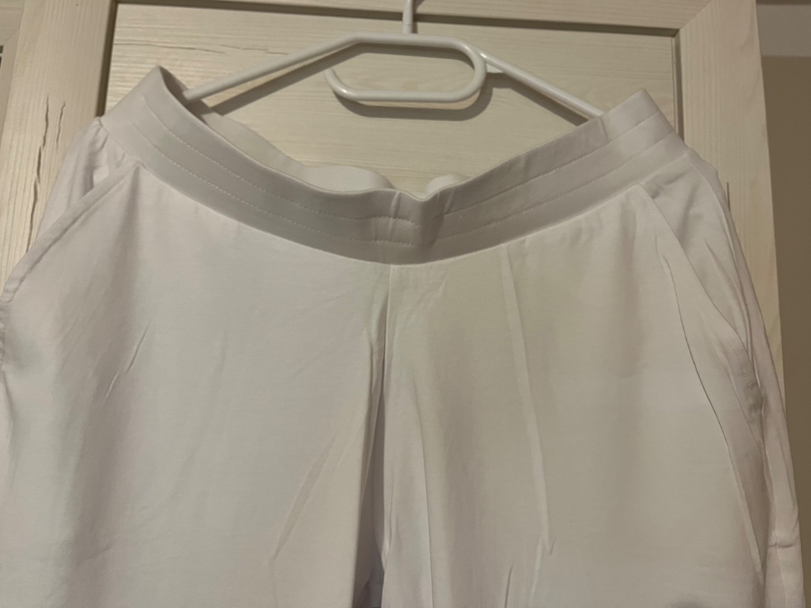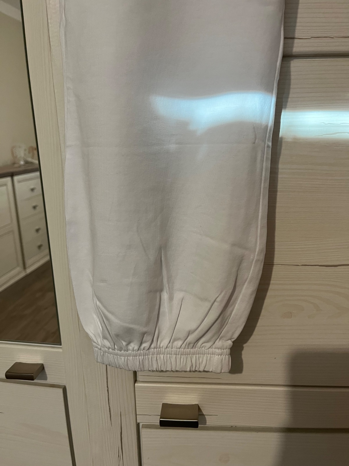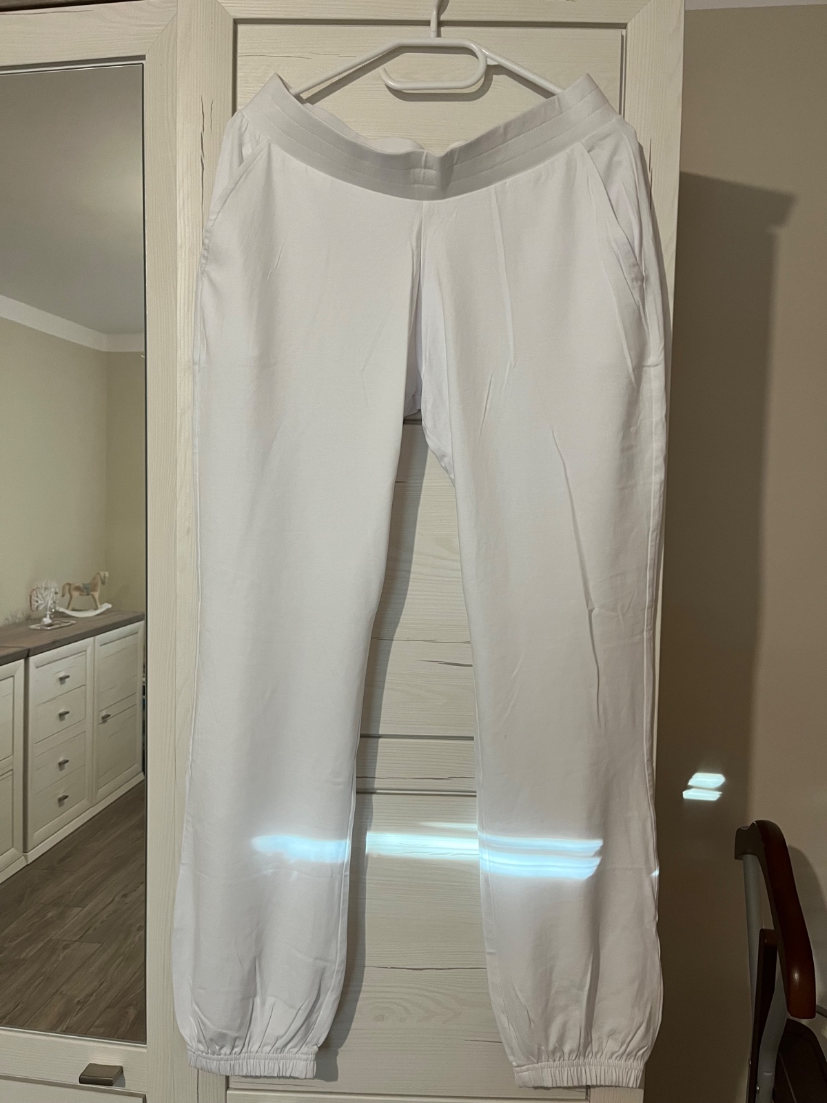 Tenké elastické, dole guma, v páse široká guma, majú vačky po bokoch, vzadu nie. Veľkosť písaná M, ale sú väčšie.