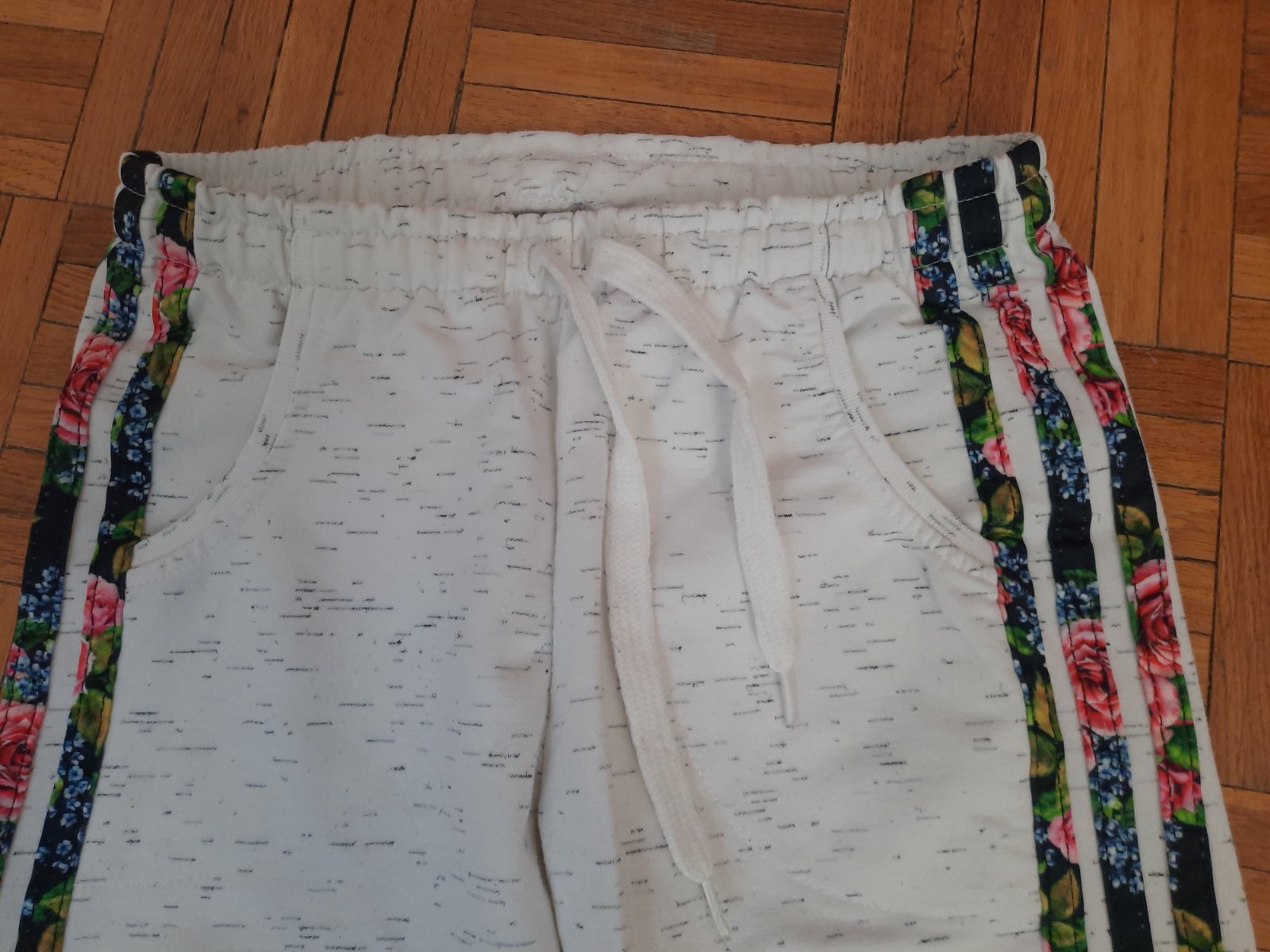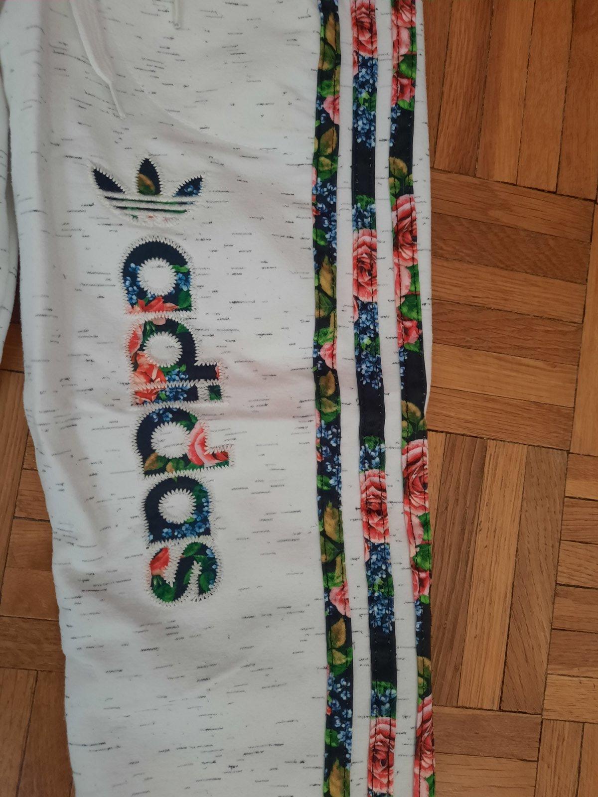 Krásne melírované Adidas tepláky. Vpredu vačky, na boku sáry farebné pásiky. Výborný stav.