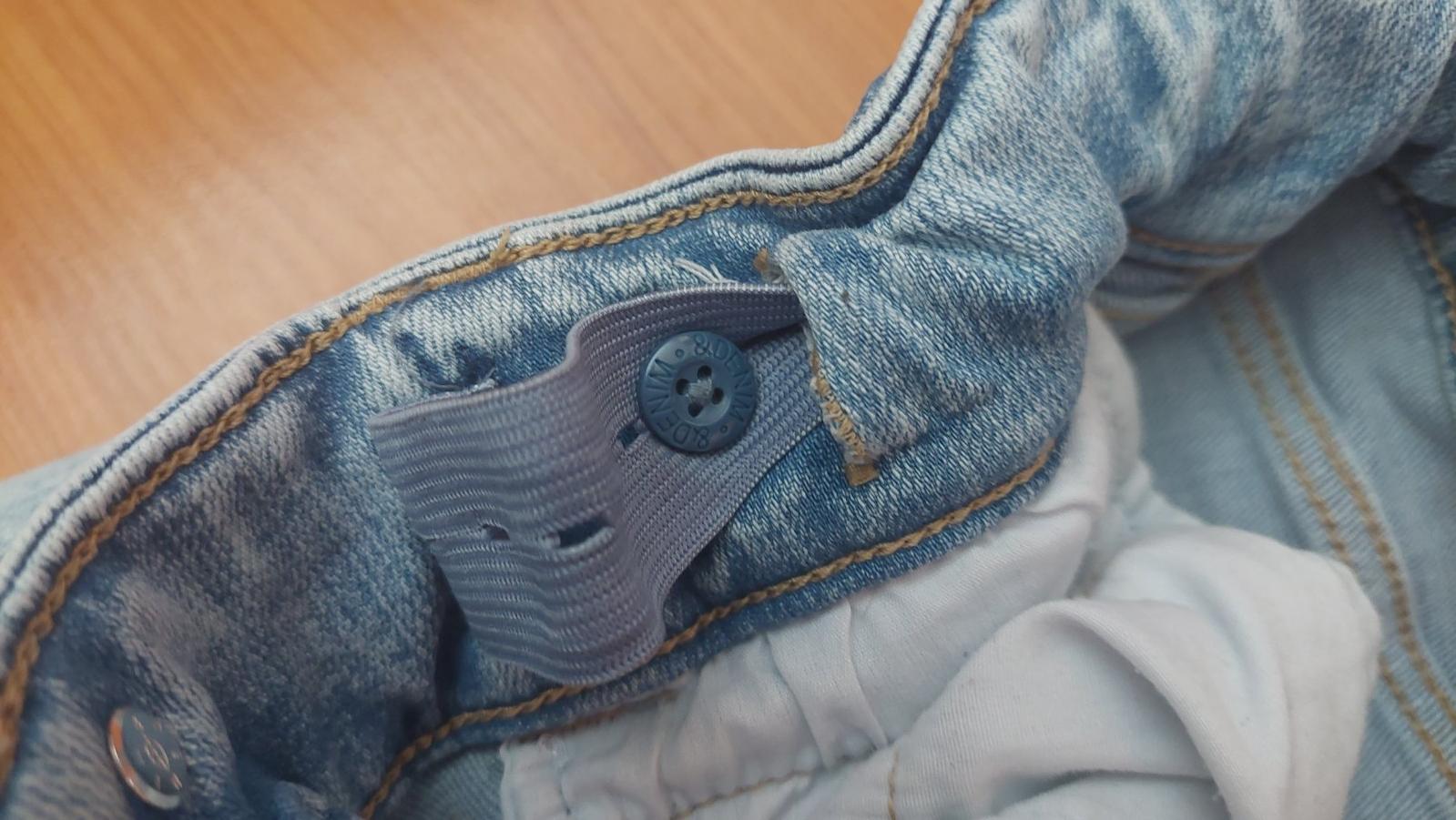 NOVE, bez visacky, makka, elasticka riflovina, pas na gumu, vpredu vrecka falosne, pas v klude 27, bocna dlzka 85.