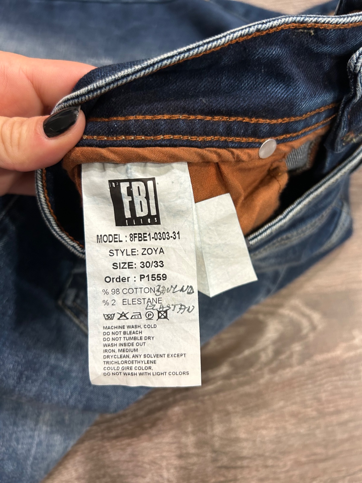 FBI Denim nove panske tmavomodre rifle ,komplet s etiketou,PC 55 eur, material bavlna a elastan,velkost W30 L33,dlzka je 103cm,sirka v pase je cca 39x2cm,predny sed je 26cm a zadny je 35cm