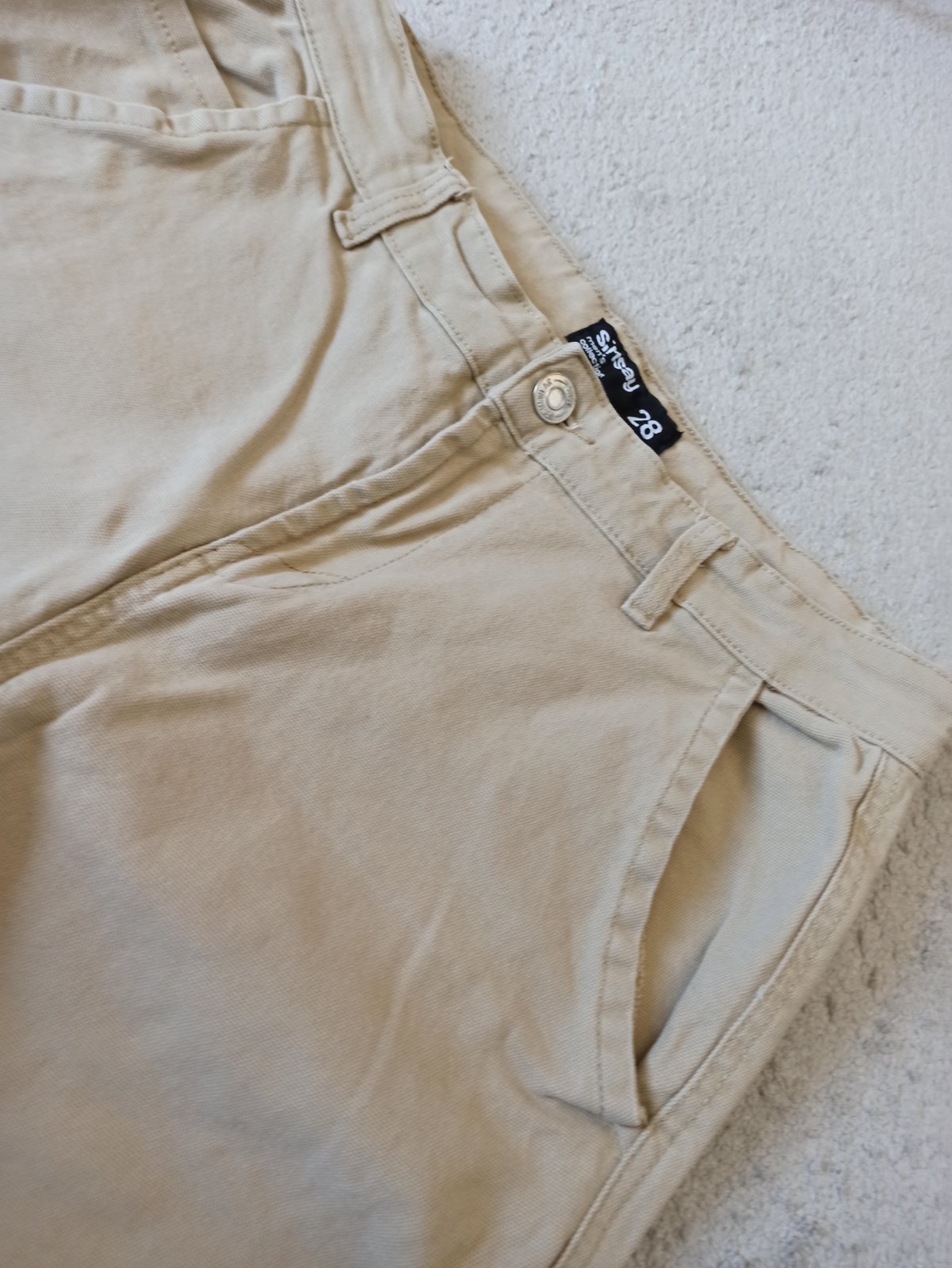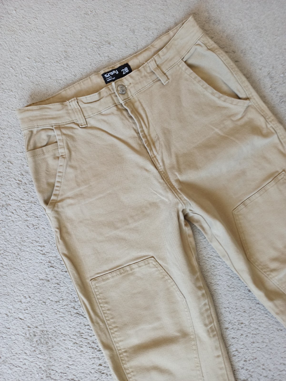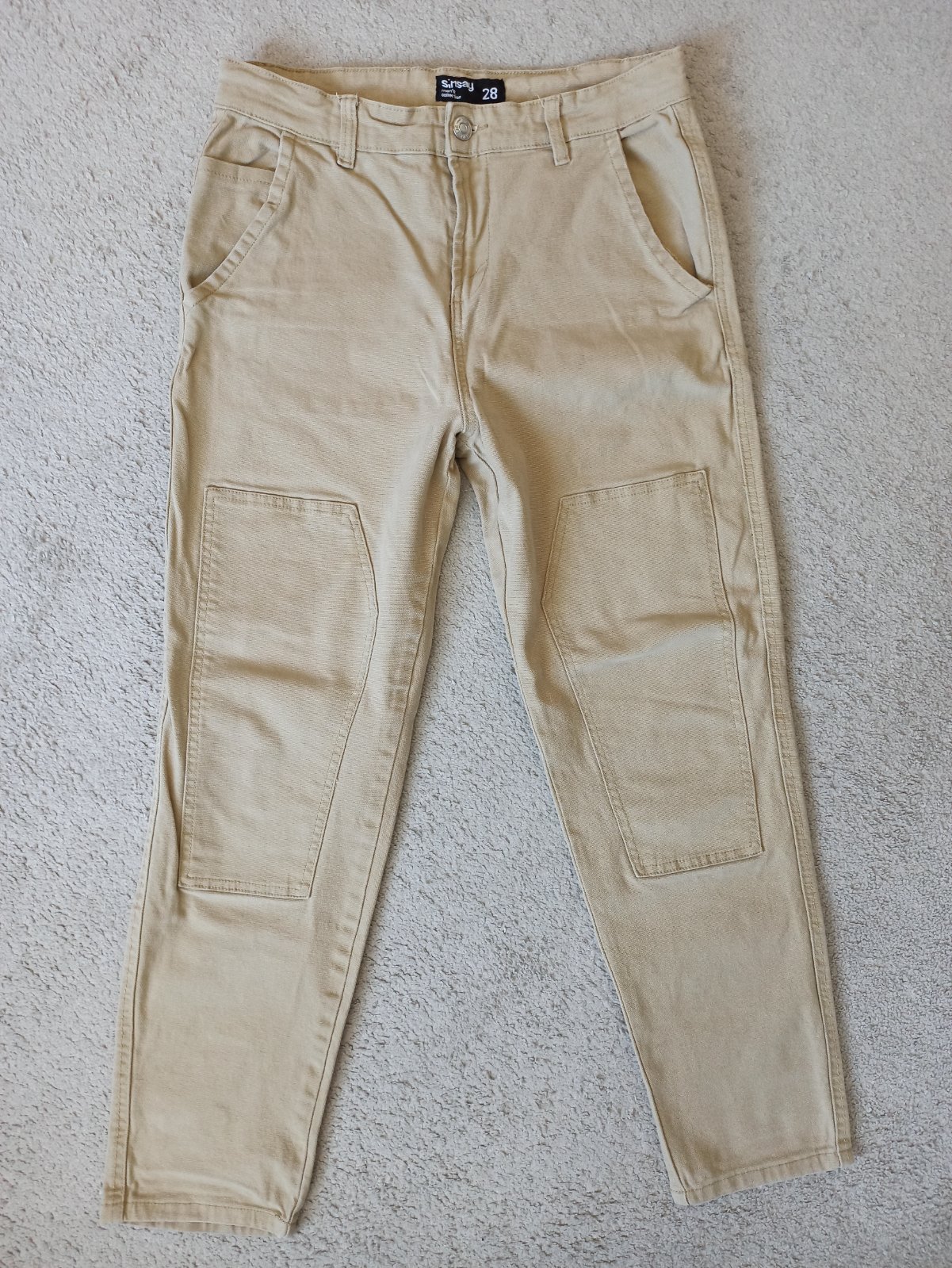 Cropp_slim. Veľkosť 28. Nosené bez poŝkodení. V páse šnúrka na stiahnutie, uknončené gumou. Materiál: 80% bavlna, 16% polyester, 4% elastan Dĺžka: 98 cm, od rozkroku 71 cm Pás: 2x 39 cm Boky: 2x 45 cm
