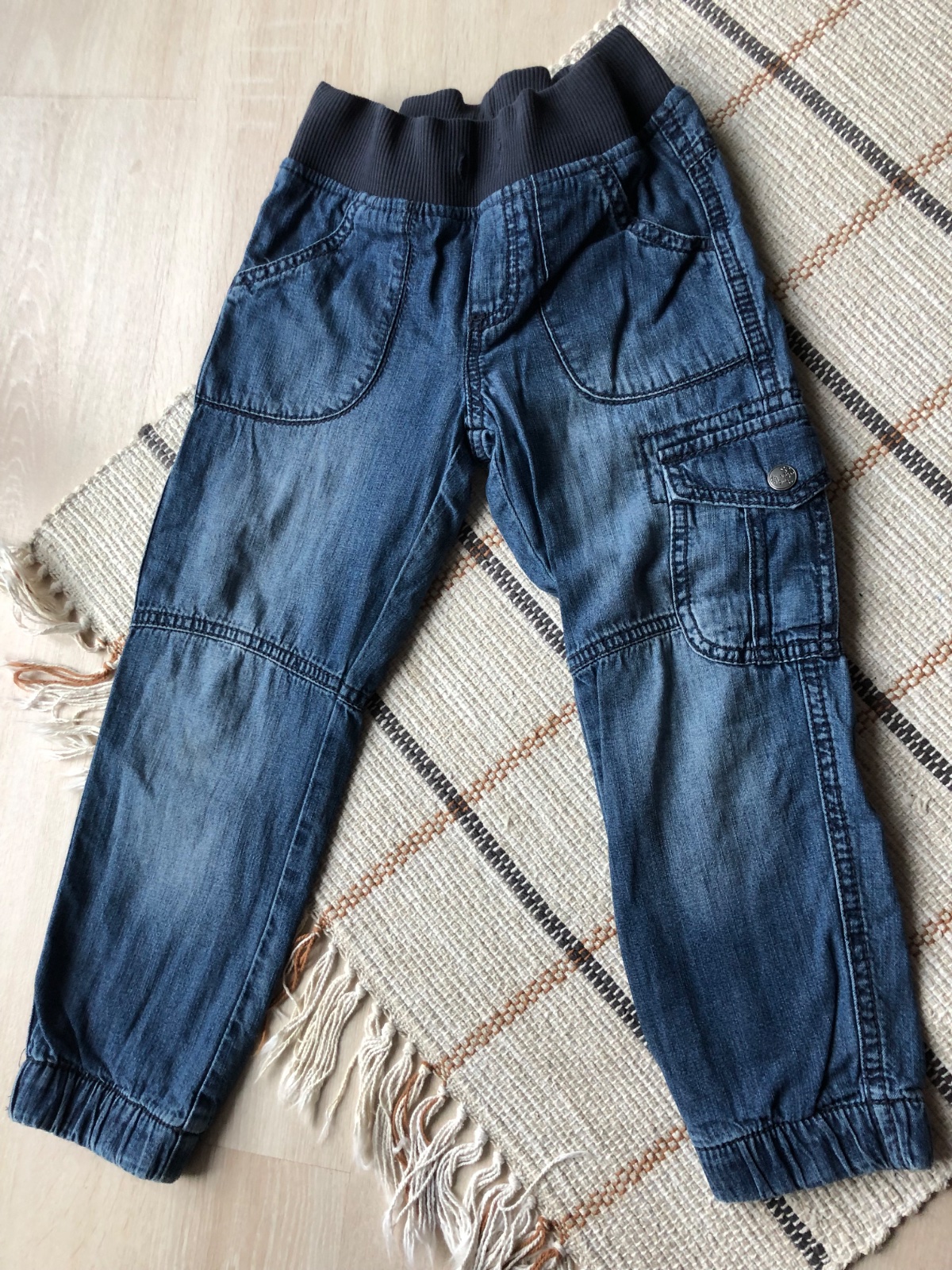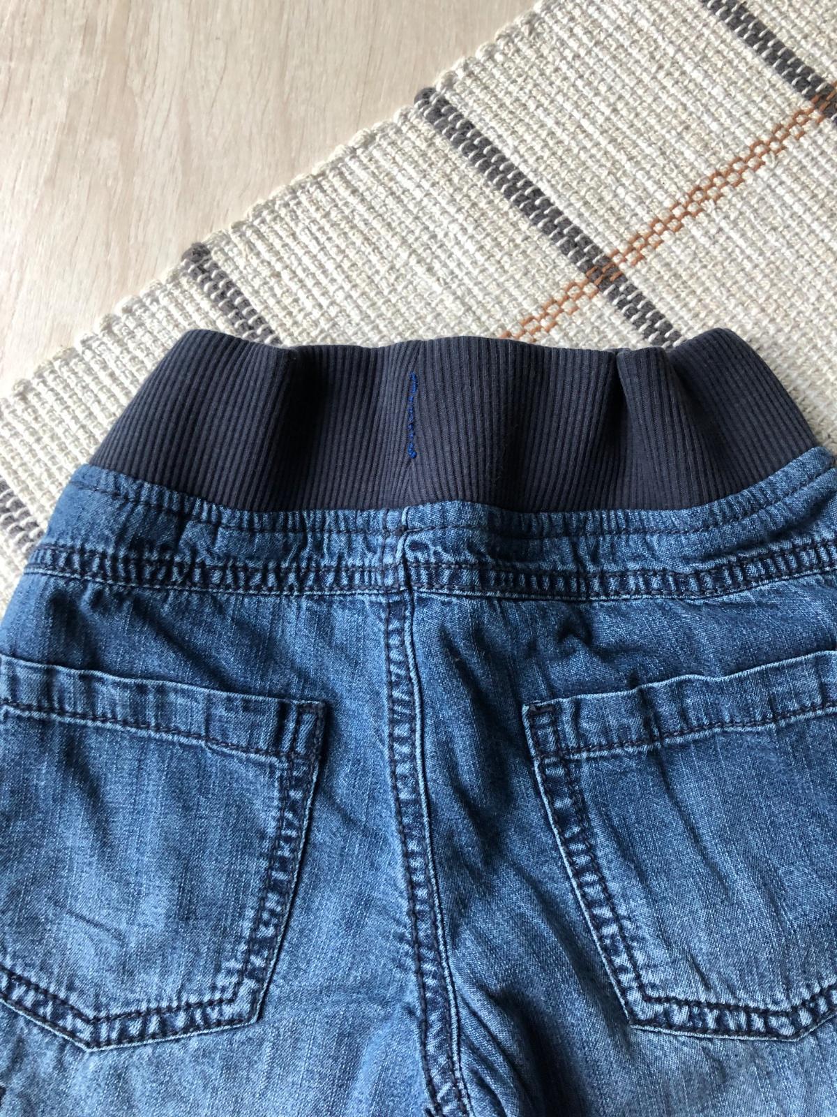 z vnutornej strany som prestrihla dierku, aby som mohla nastavit malemu na gume pas, lebo vonkajsia snurka bola nefunkcna a nohavice nedrzali na pase (vid foto)