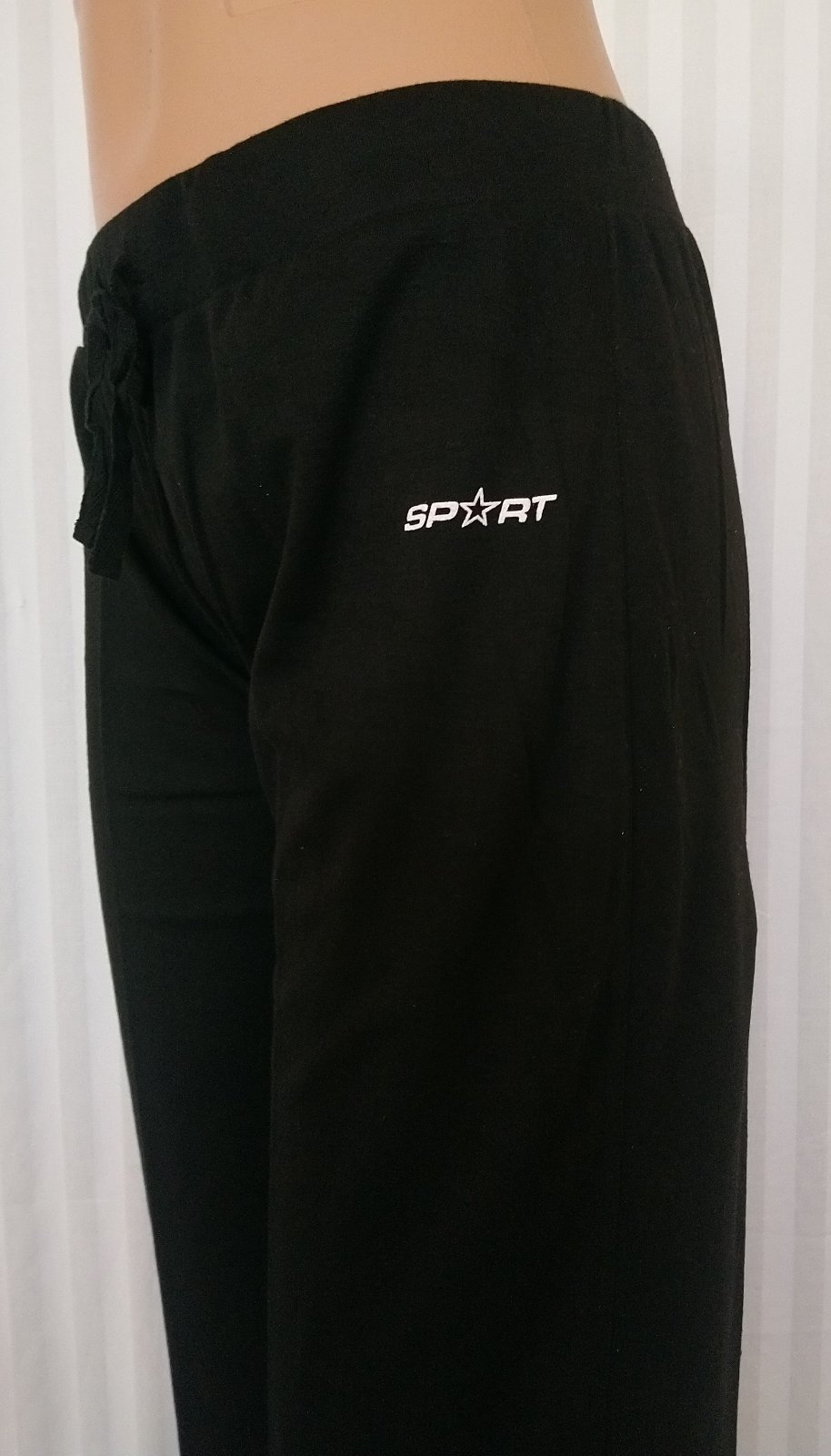 nové, dámske čierne tepláky, v páse širšia guma + zvonka šnúrka na uväzovanie, na ľavej nohavici hore malý nápis, bez vreciek,