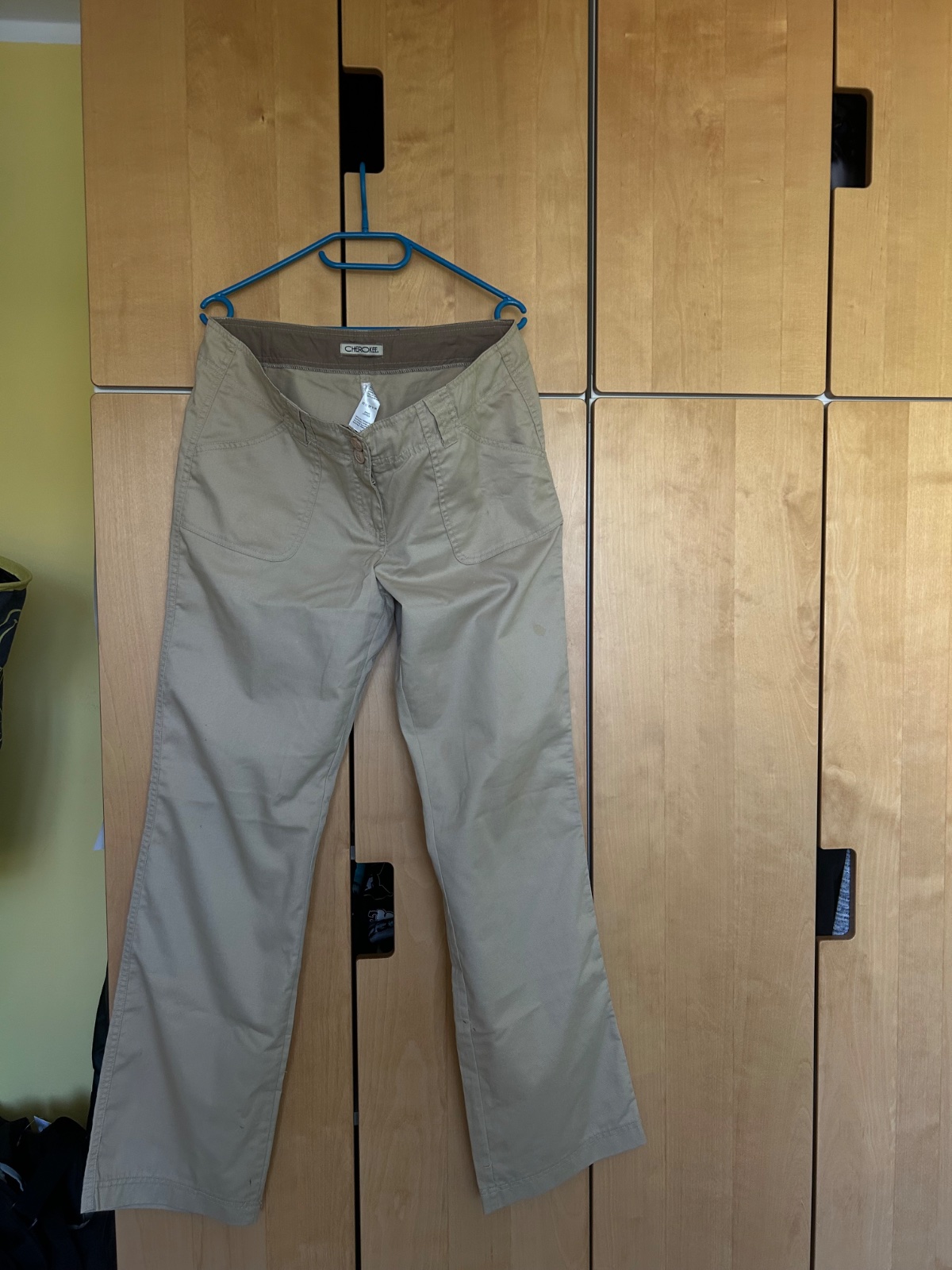 Bledohnedé menžestrové nohavice, nosené, nepoškodené.