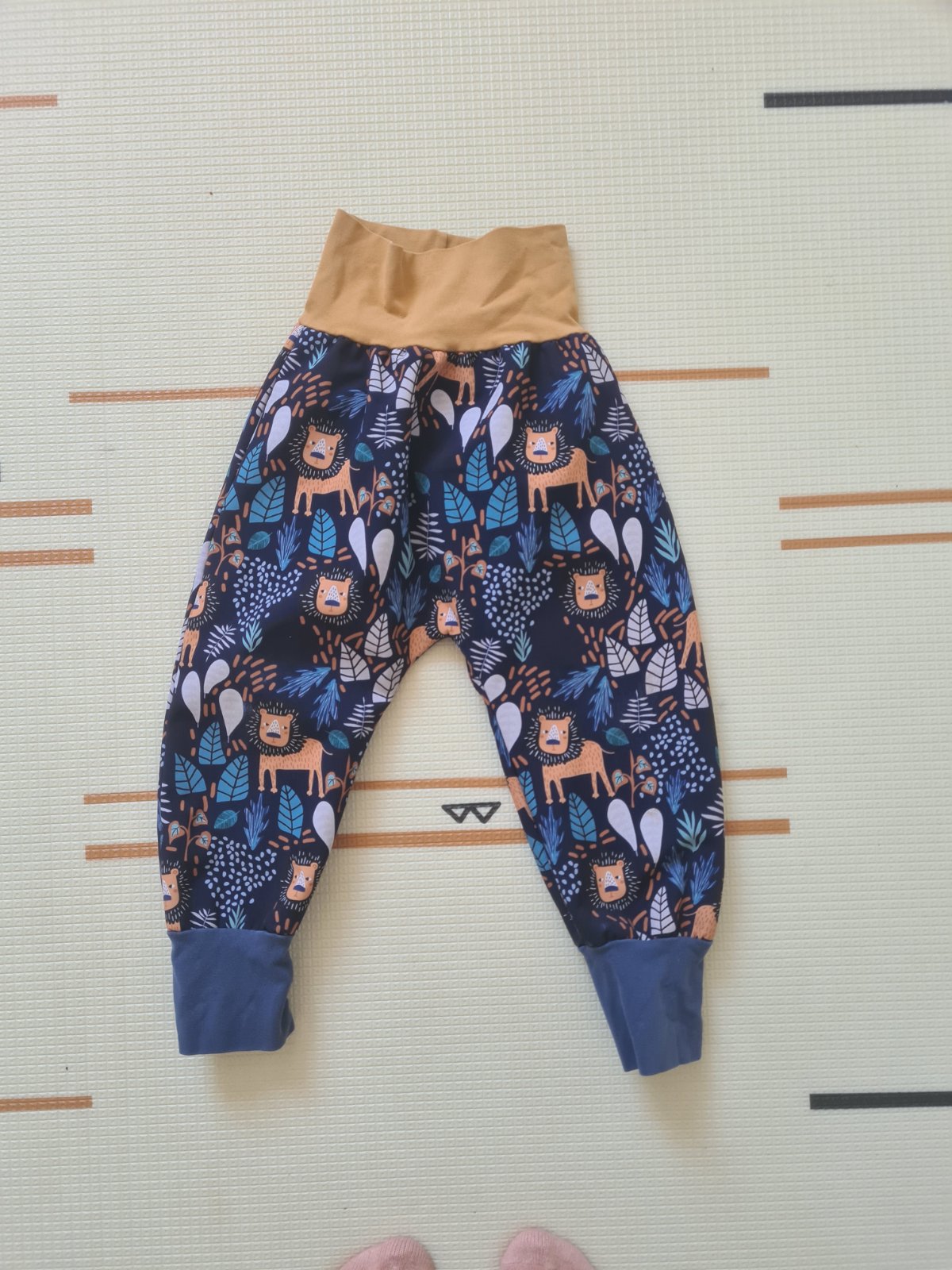 Pohodlné hrubšie nohavice, s vreckami vpredu, vzadu falošné vrecká, materiál bavlna, dĺžka 104cm. Bez poškodenia.