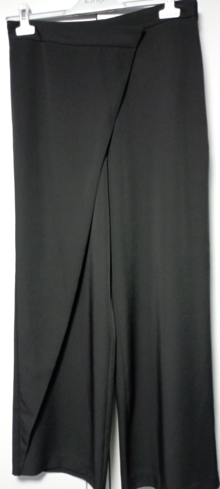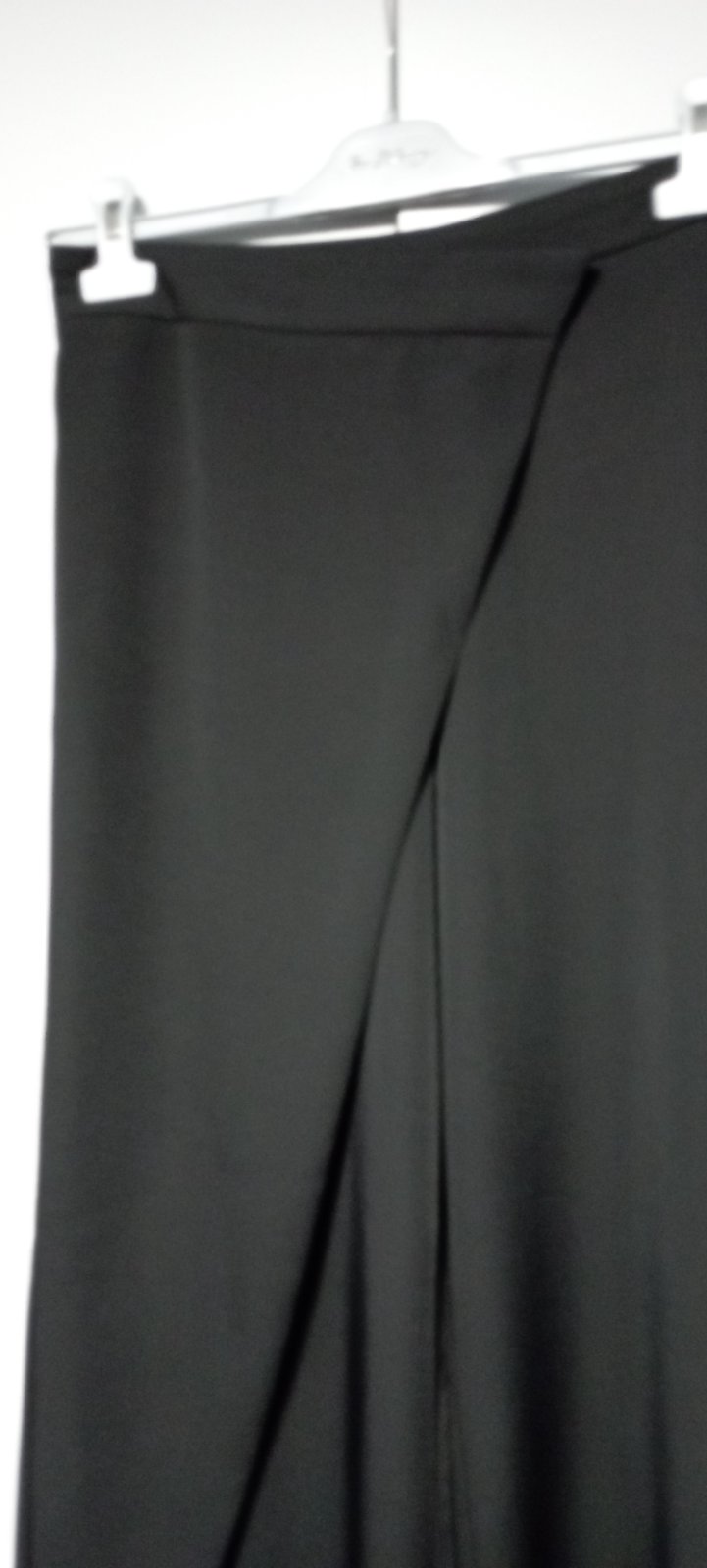 elegantné nohavice, raz oblečené, v bezchybnou stave, so širokým strihom a stredne vysokým pásom, detaily prekrývania z rovnakej látky typu pareo, zapínanie na bočnej strane na zips a vpredu na patent