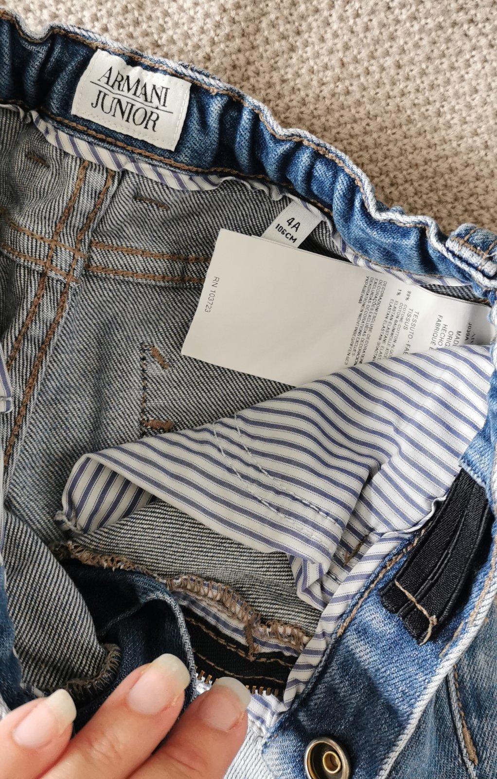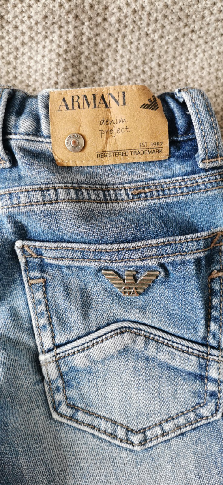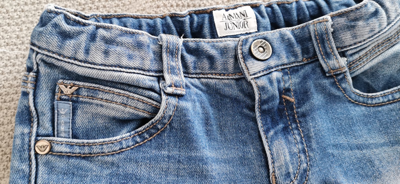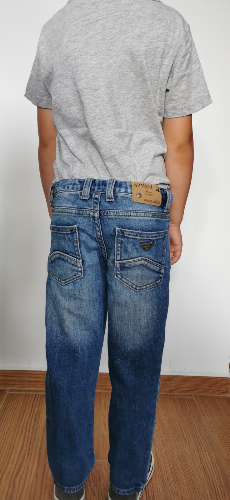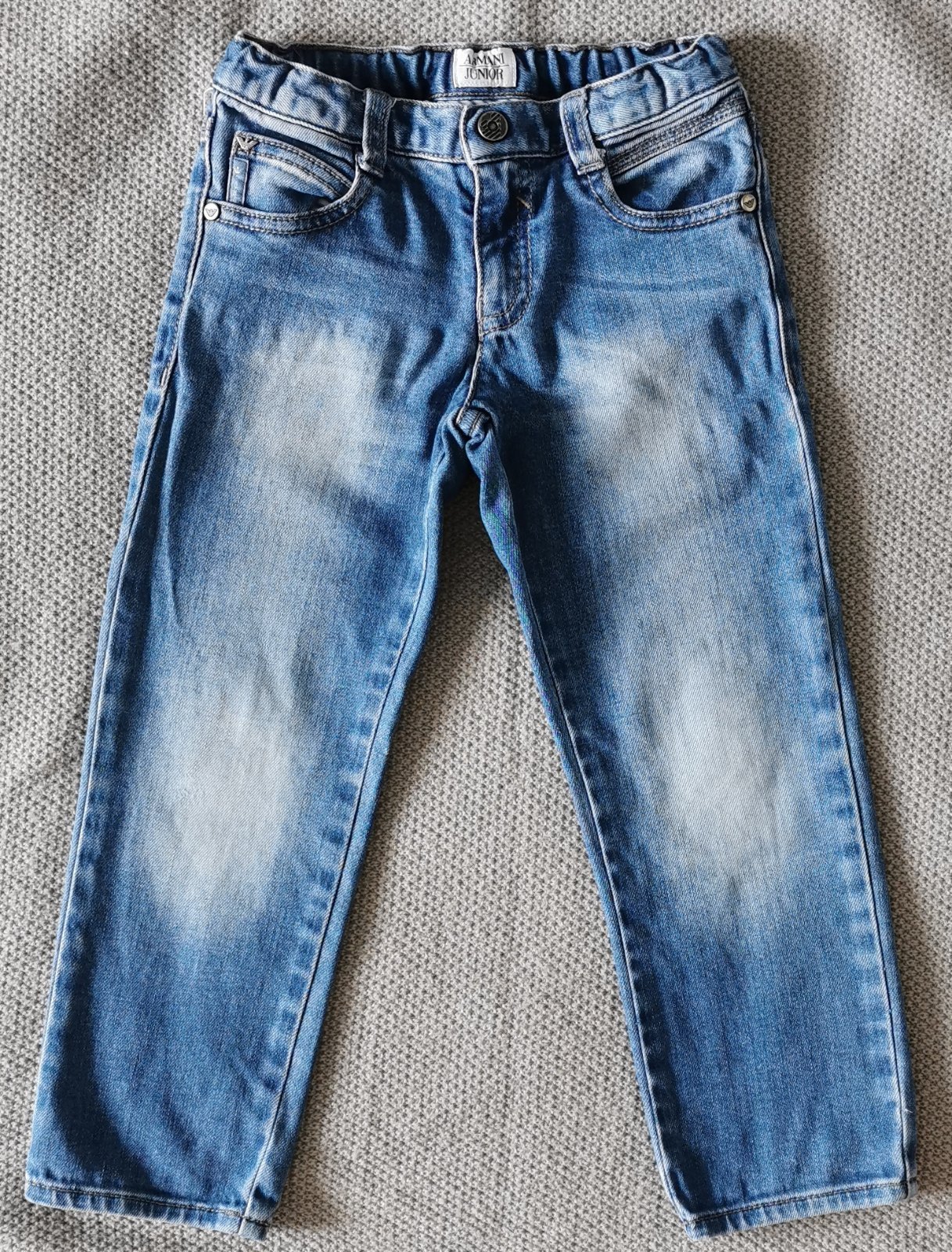 Predám originál rifličky Armani Junior. Zapínanie na cvok, nastaviteľný pás. Rovný strih. Veľkosť 104-110. Cena 5€.