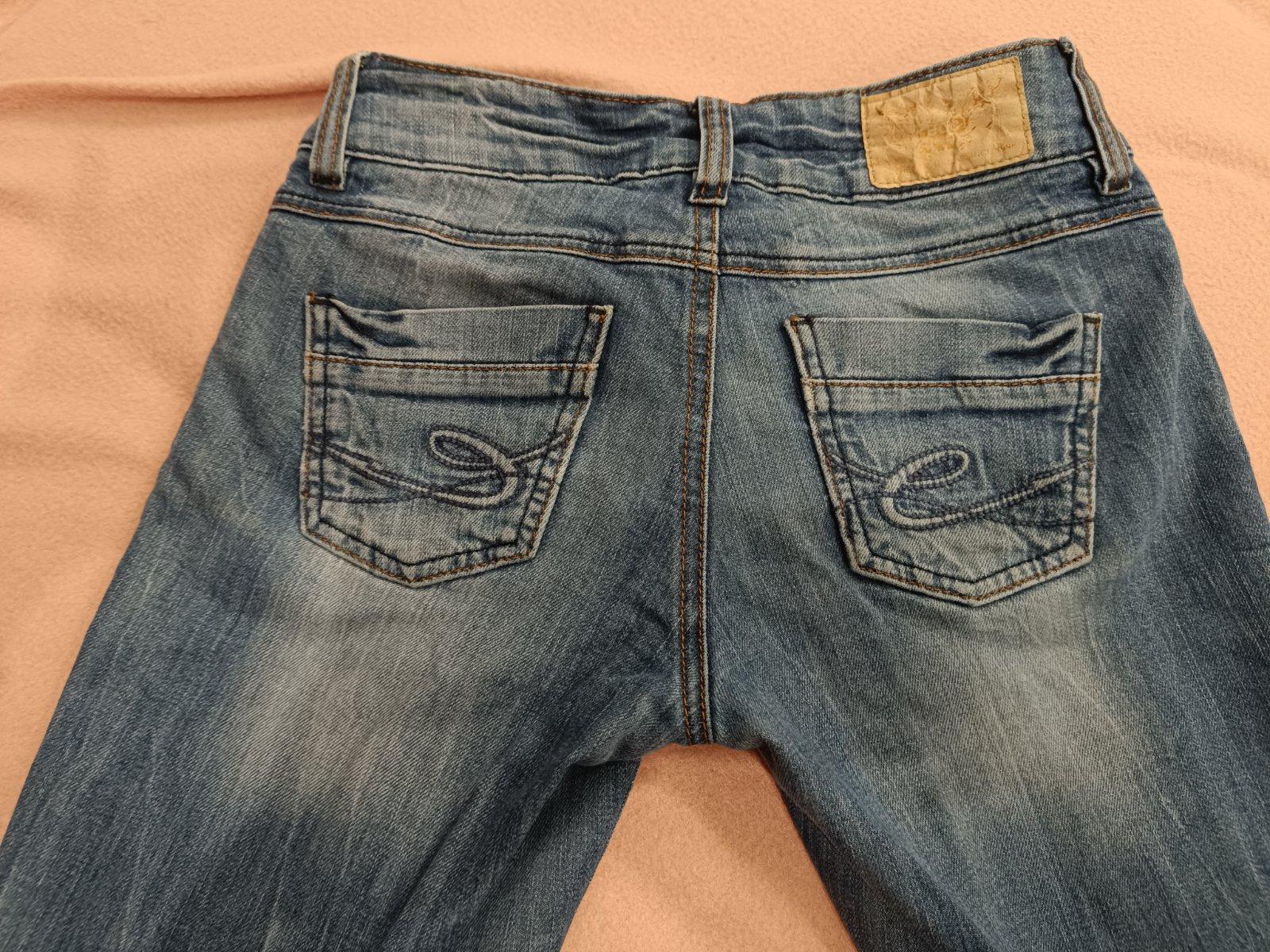 Dvoje znackove rifliky, v dobrom nosenom stave, len tm. modre maju trochu suchnute spodky. Cena spolu.