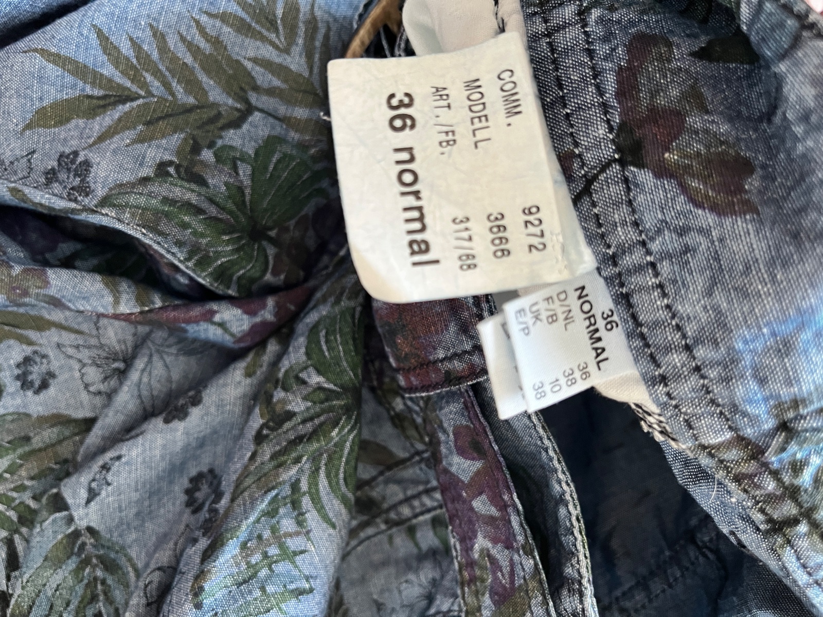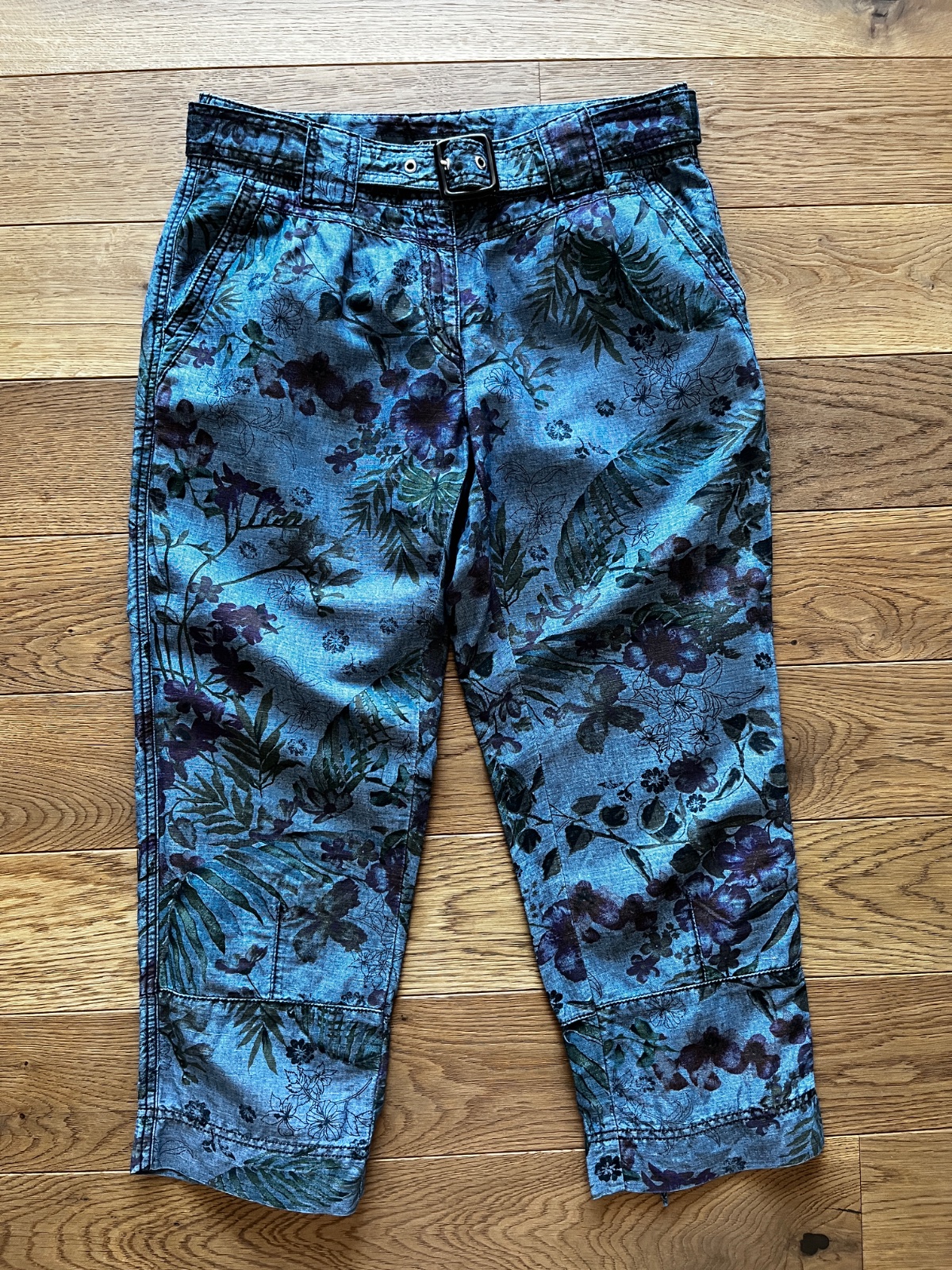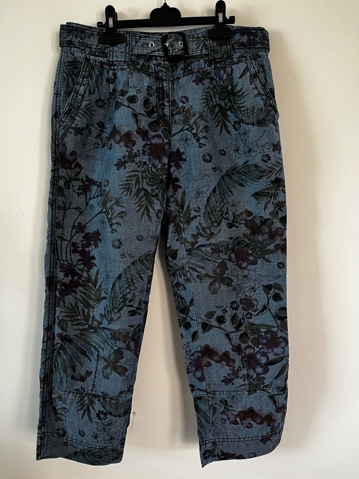 ,,Dámske nohavice Zerres, veľ. 36 (normal). Krásny kvetinový vzor v tlmených modro-fialových tónoch. Ľahký letný materiál – kombinácia bavlny a ľanu, veľmi príjemné na nosenie. Pekný stav.“