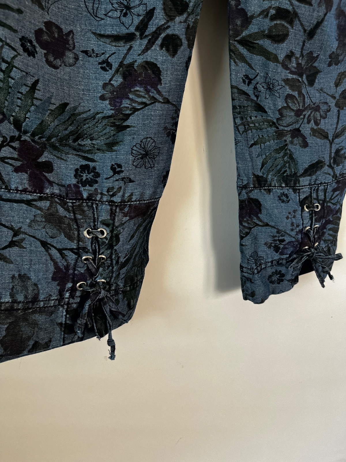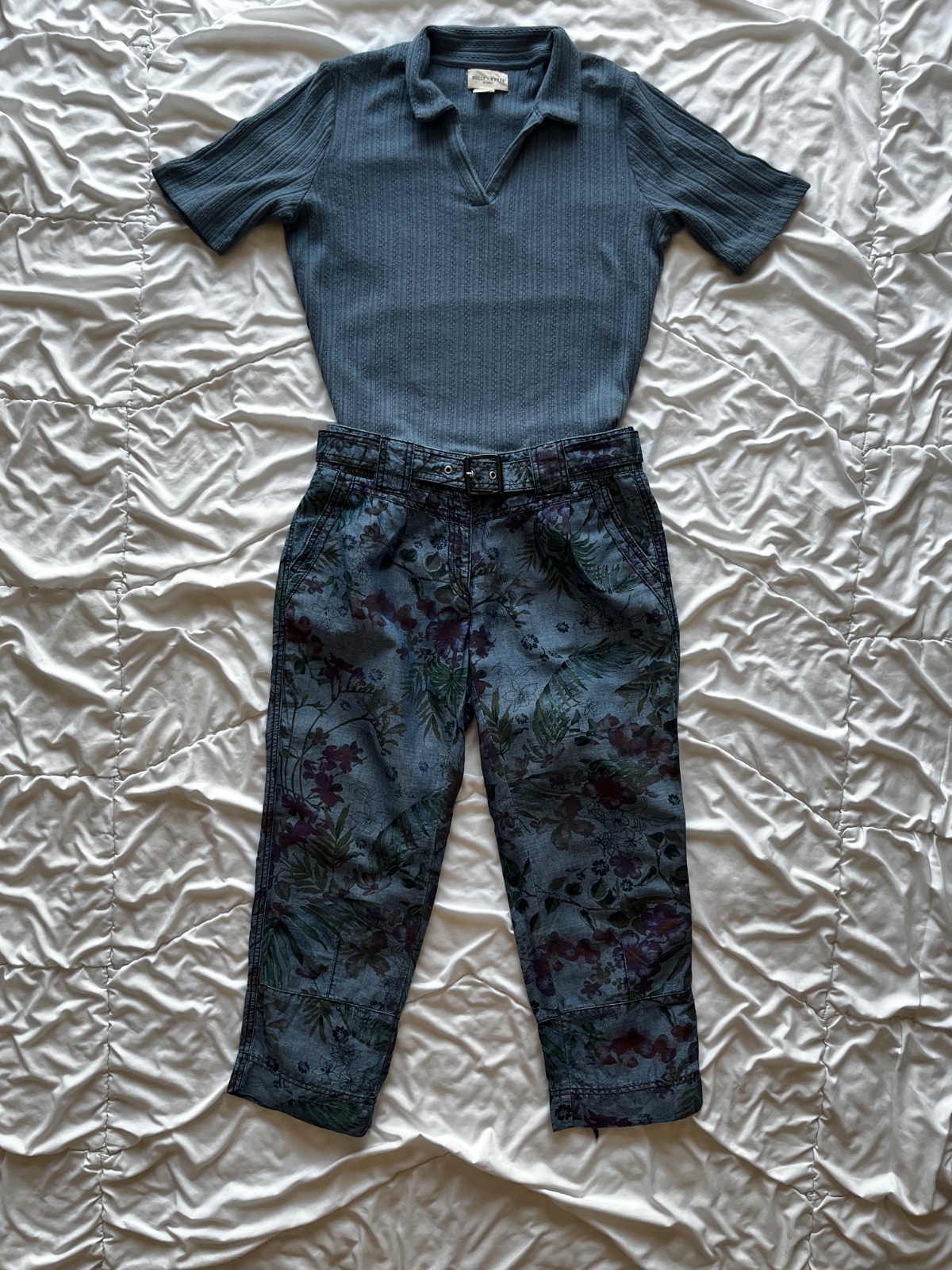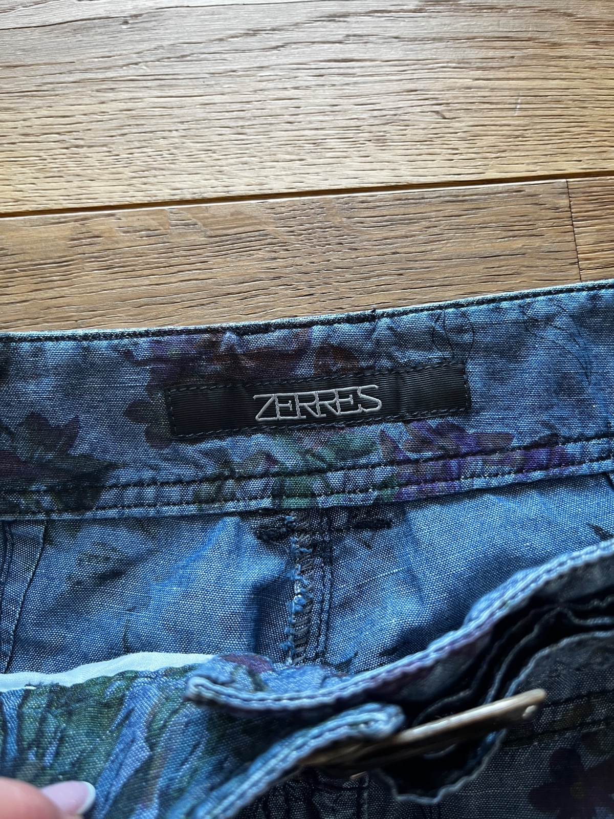 ,,Dámske nohavice Zerres, veľ. 36 (normal). Krásny kvetinový vzor v tlmených modro-fialových tónoch. Ľahký letný materiál – kombinácia bavlny a ľanu, veľmi príjemné na nosenie. Pekný stav.“