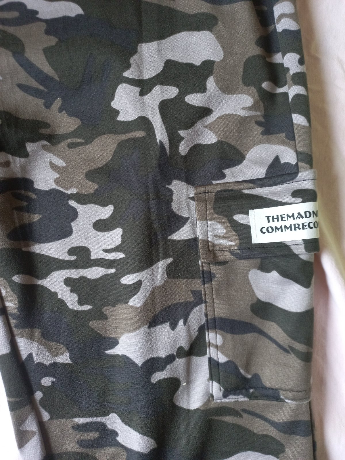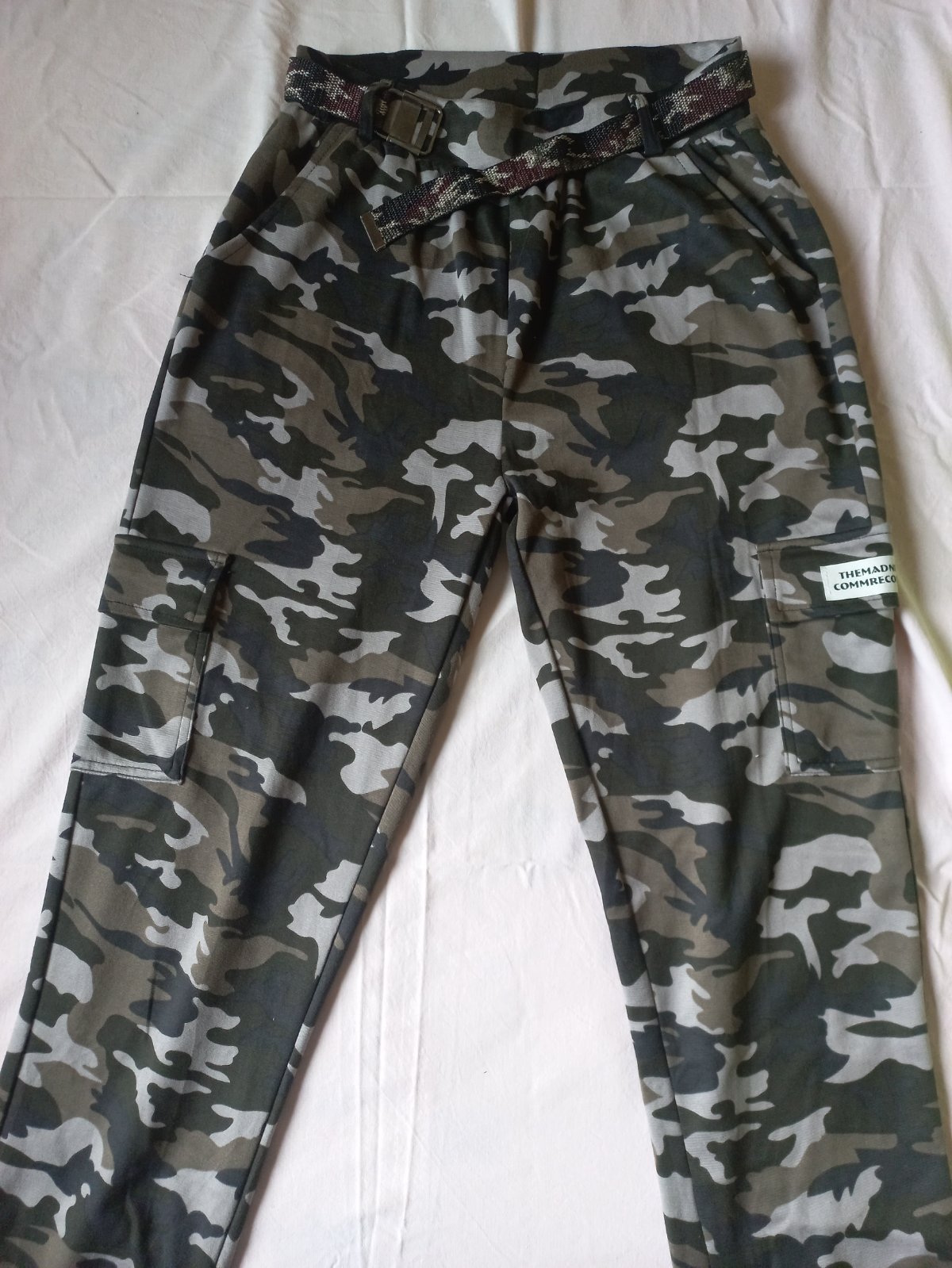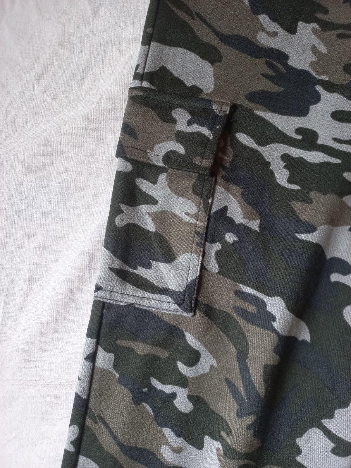Pohodlný kúsok s maskáčovým vzorom. V páse opasok. Vrecká vpredu a jedno na boku. V dolnej časti gumička. Materiál je ani látka ani teplákovina. Niečo medzi tým. Voľnočasový kúsok. Veľkosť M/38, no strihovo, tým že je guma v páse aj v dolnej časti aj pre S veľkosť. Premeriam niečo, ak treba.