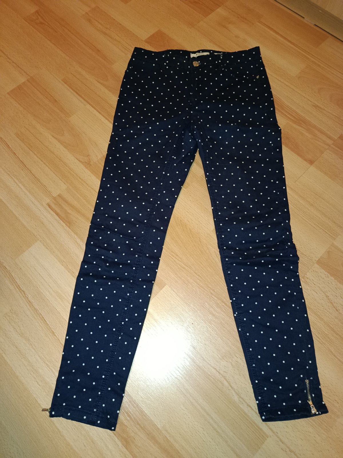 predám nohavice vo výbornom stave, príjemný materiál ,strečové bodky sú oranžovo-tehlovej farby pás - 38cm, boky - 45 cm, dĺžka - 99cm, zadný sed - 34cm, predný - 22cm, spodok nohavice - 16cm,