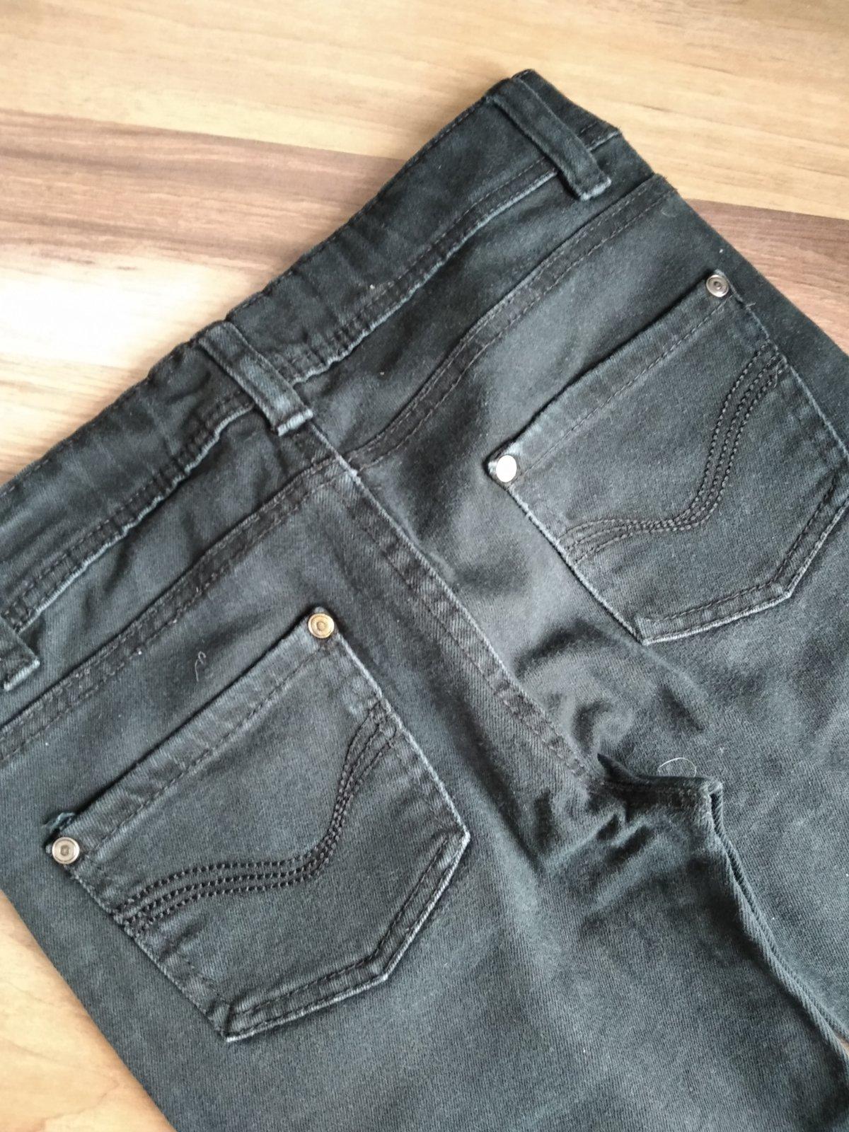 Krásne čierne rifle na gumičku s krásnymi detailami, dvakrát oblečené