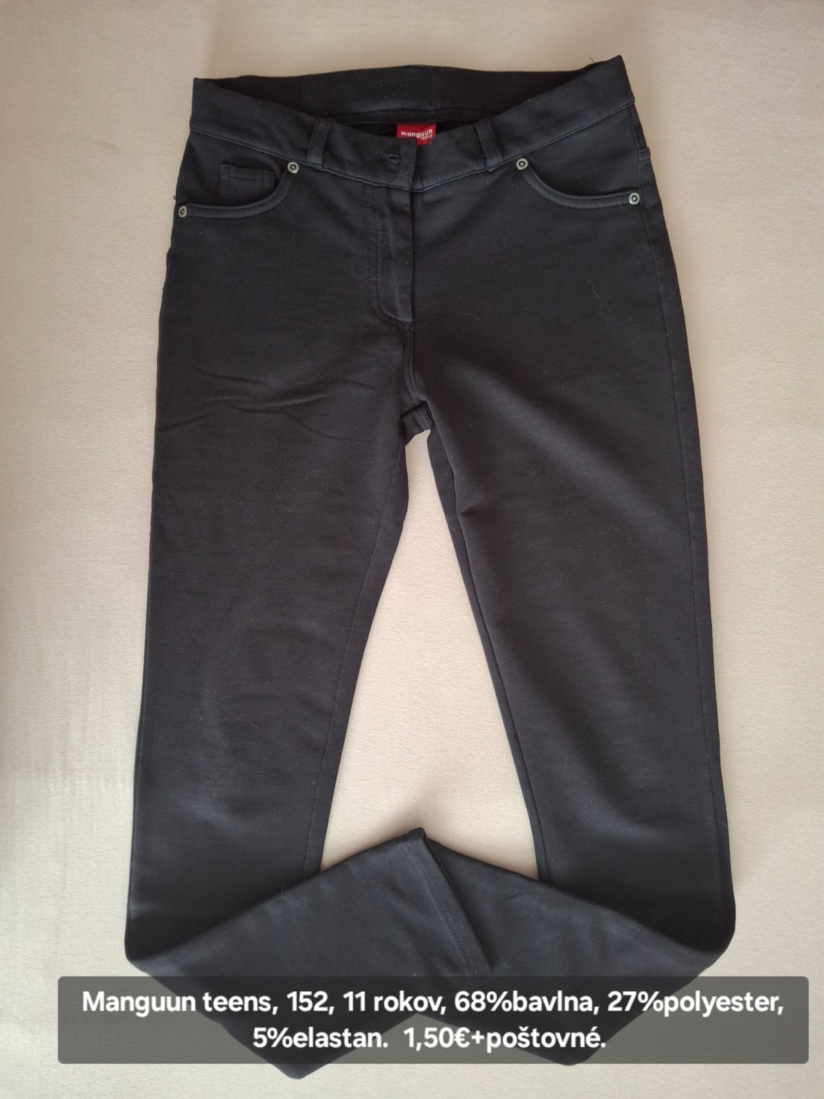 Predám nosené elastické nohavice, MANGUUN, 152, 11 rokov, bežné známky nosenia, 68%bavlna, 27%polyester, 5%elastan.
