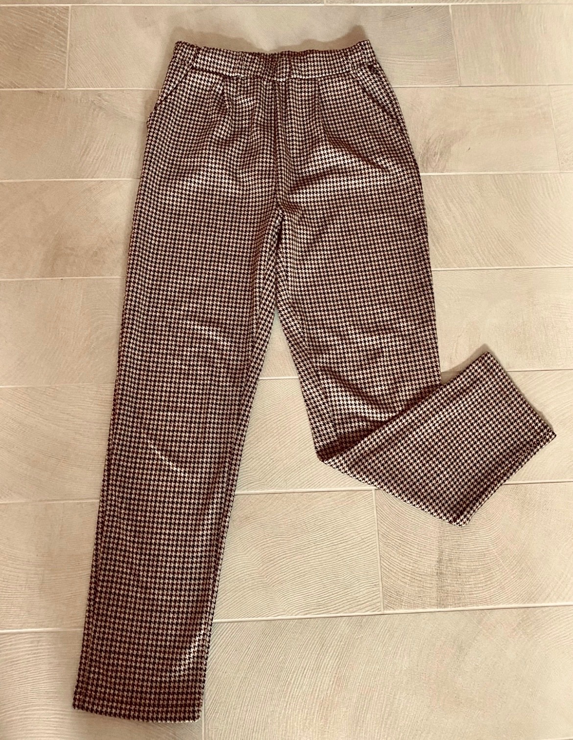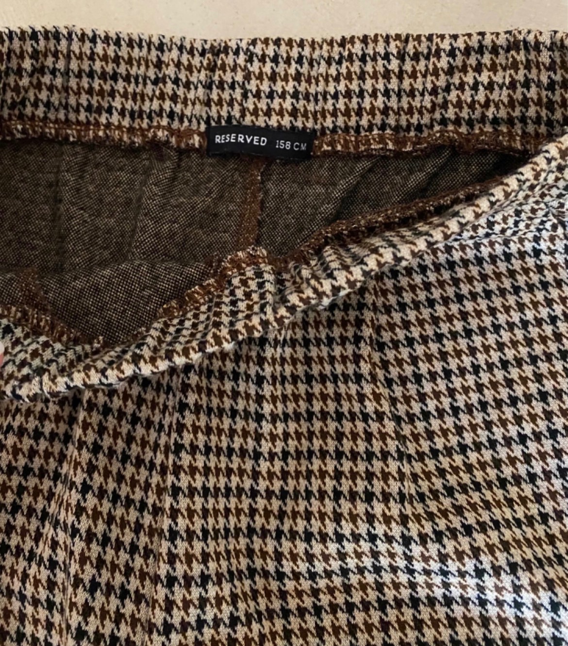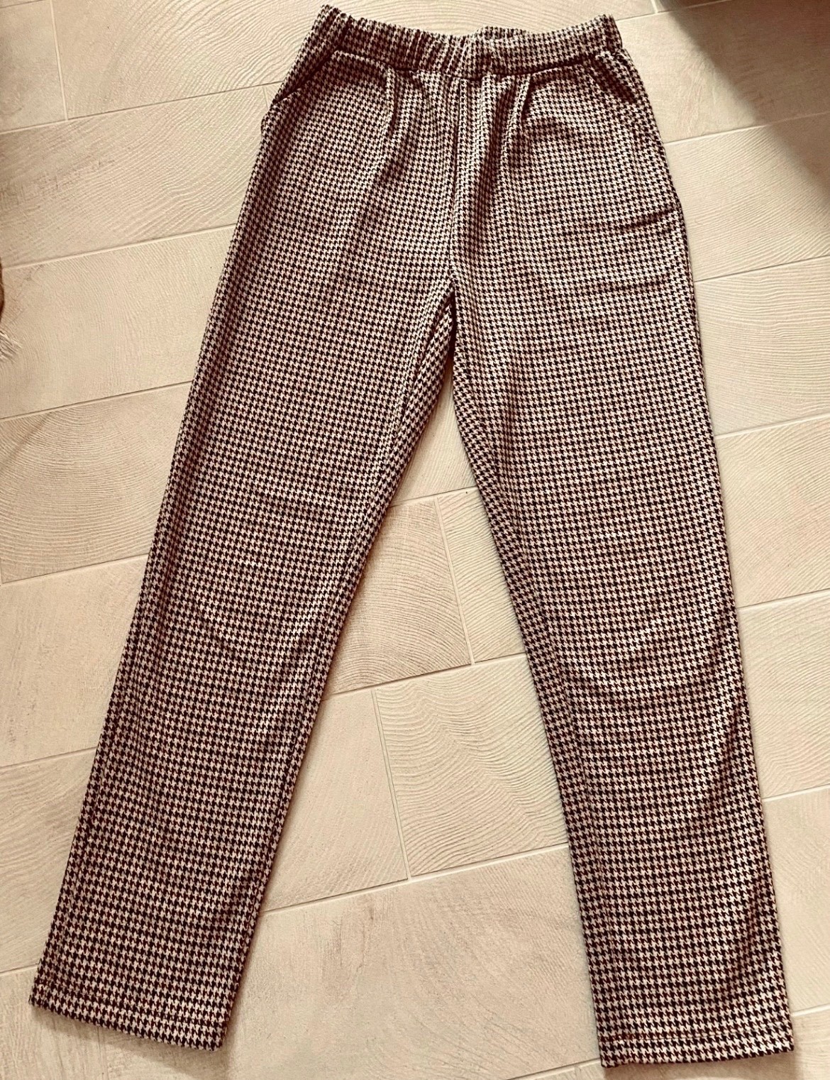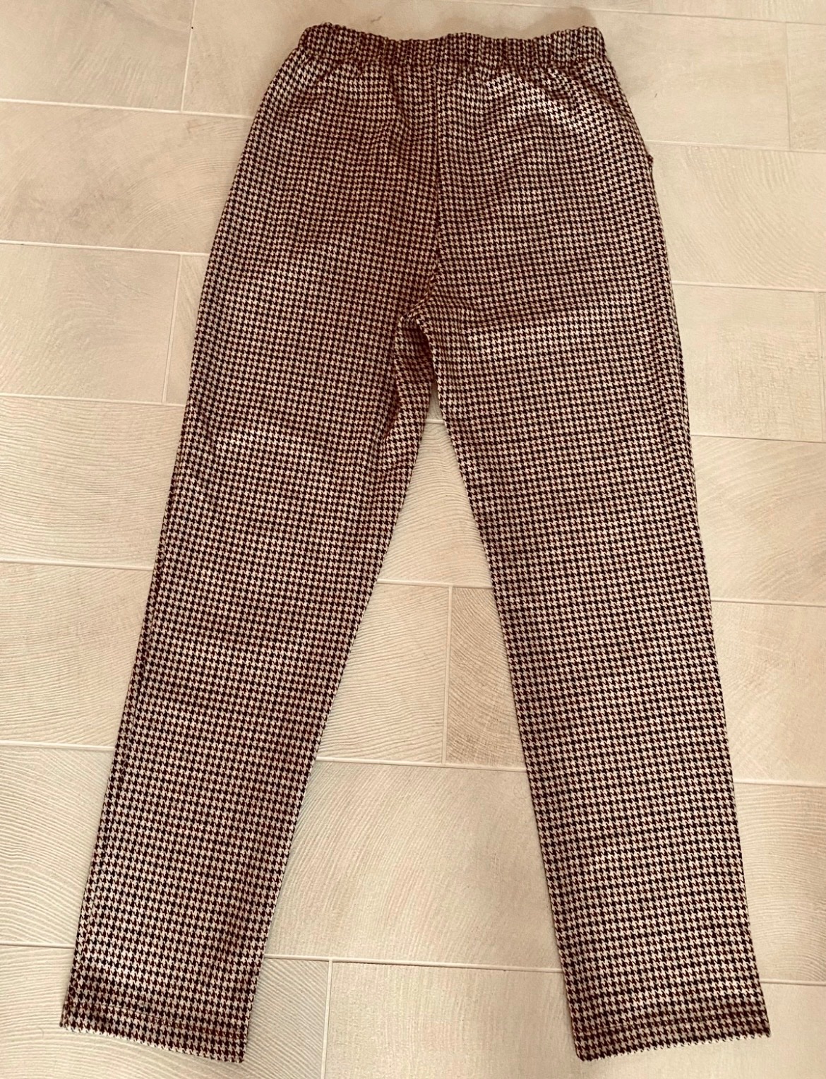 Pohodlné teplejšie nohavice, v páse gumka, po bokoch vrecká; sedia na 158 ako je uvedené; nosené, ale v peknom stave, vzor vidieť v detail fotke