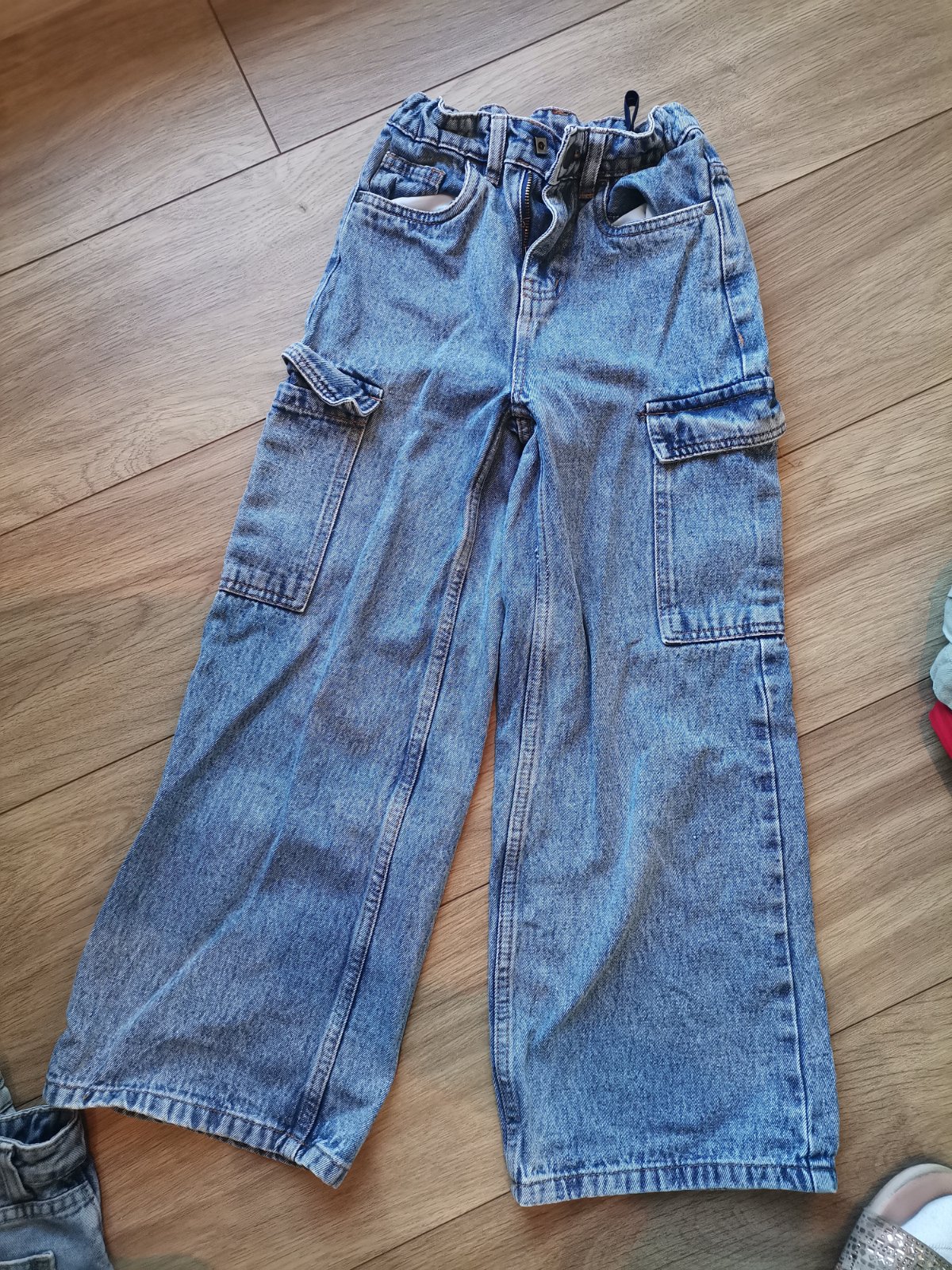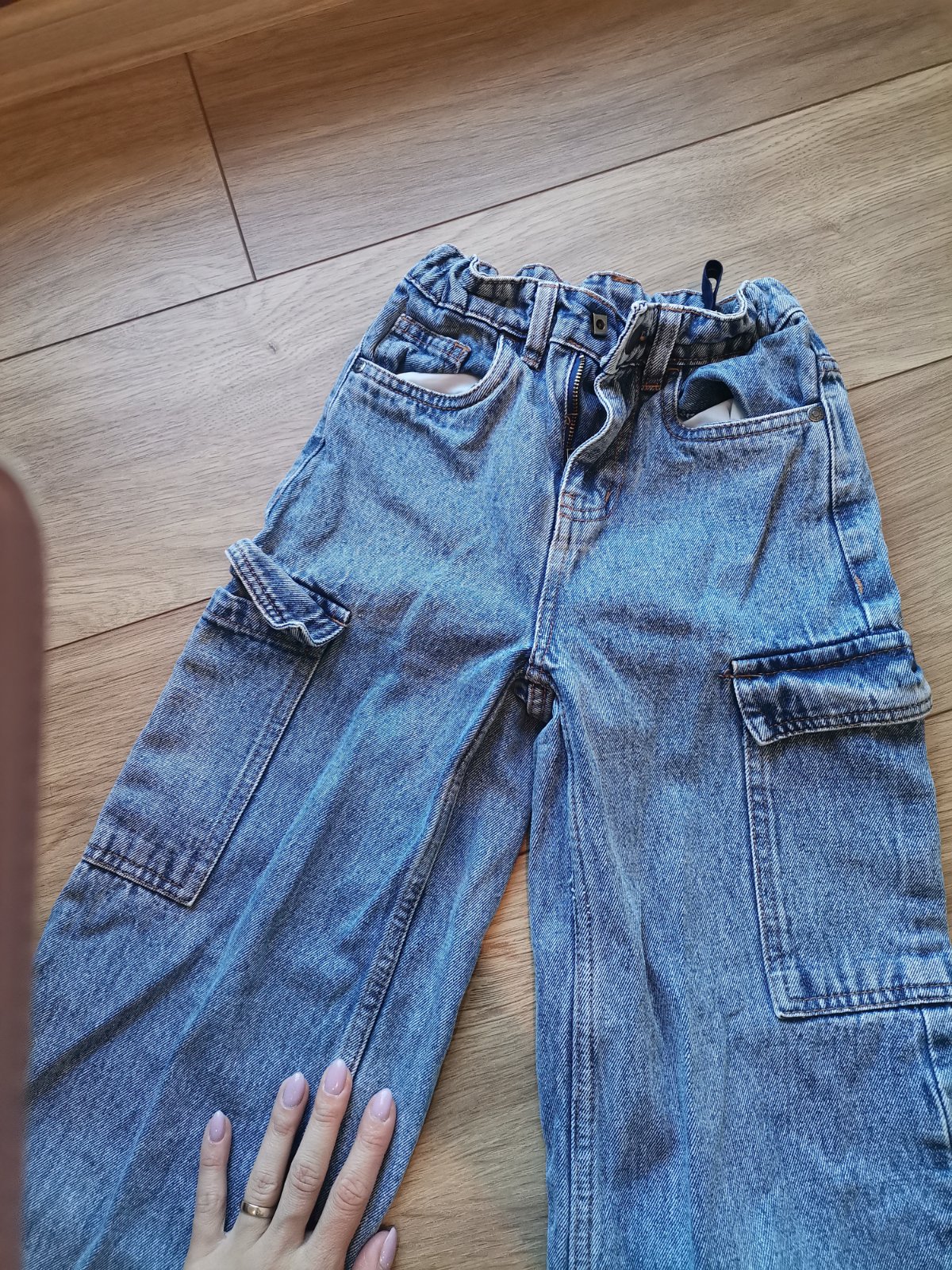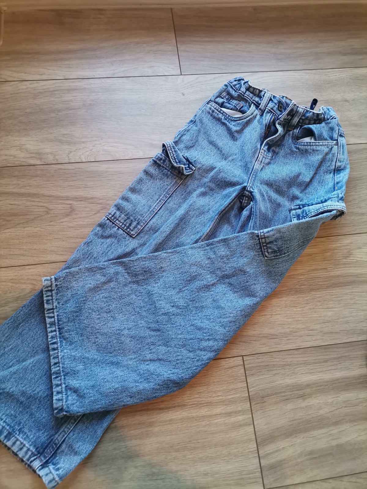 Nosené rifliky, hrubšie, pevnejšie, bez zjavných poškodení. Jediný faulik je zlomená gombička na nastaviteľnom páse, ale je to zlomené tak, že to zázrakom stále drží 😜 ..mám k nim vo veľkosti 134-...