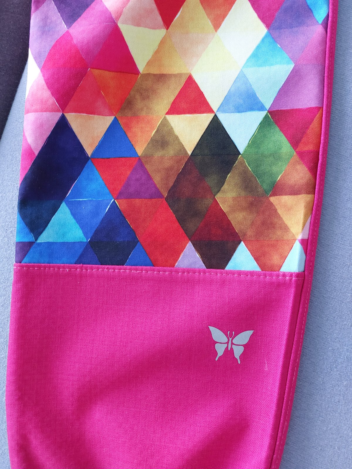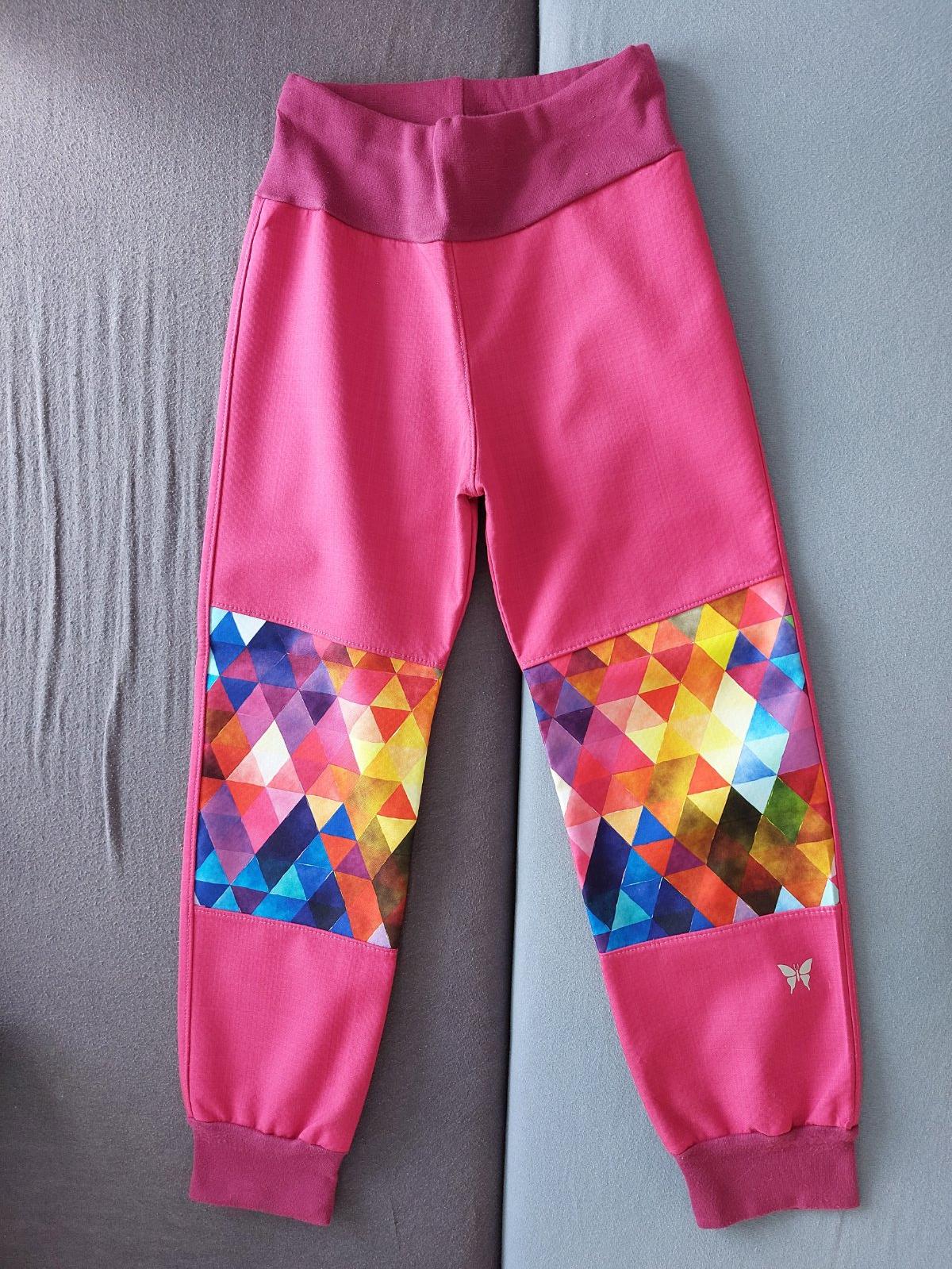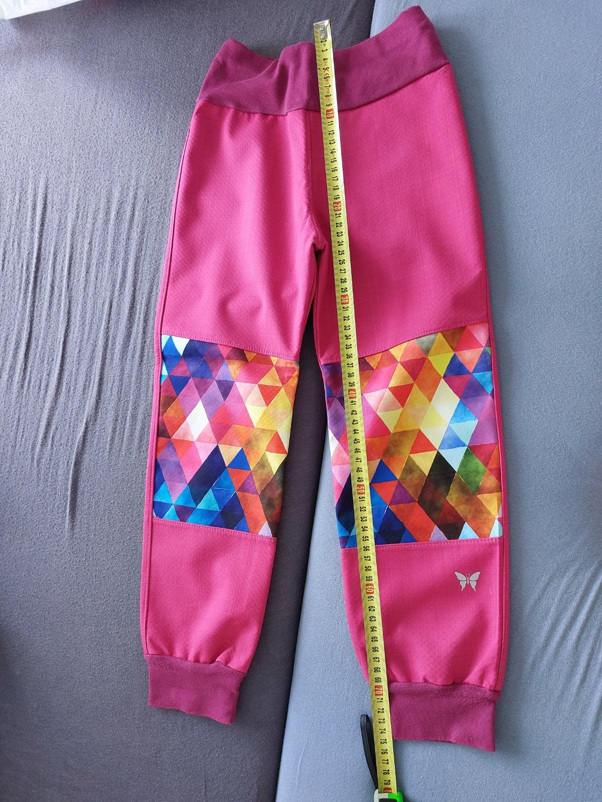 Krásne nohavice z letného softshellu, šité, s odrazkami vpredu i vzadu - motiv motyl, zvyseny pas, vyssi sed.
