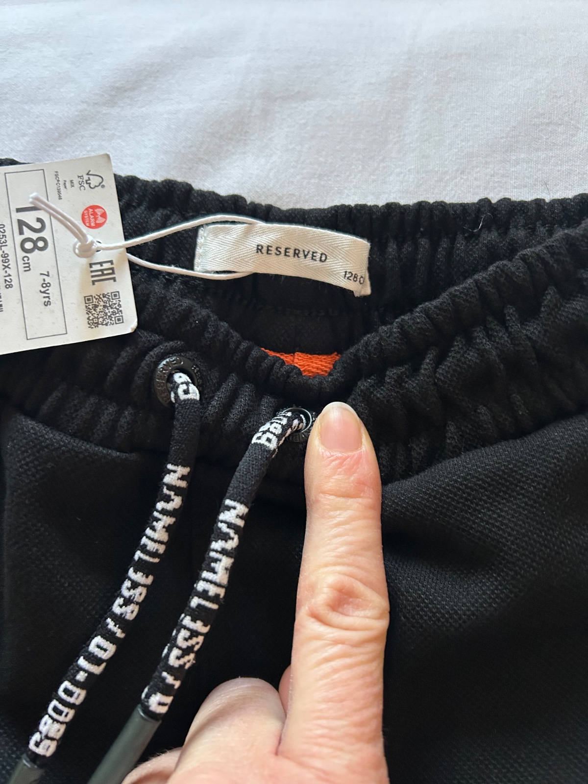 Ponúkam na predaj tepláky značky Reserved, veľkosť 128, bez poškodenia, elastický lem, sťahovanie na šnúrky, vrecká, dve kapsové vrecká. Cena 3,50 EUR.