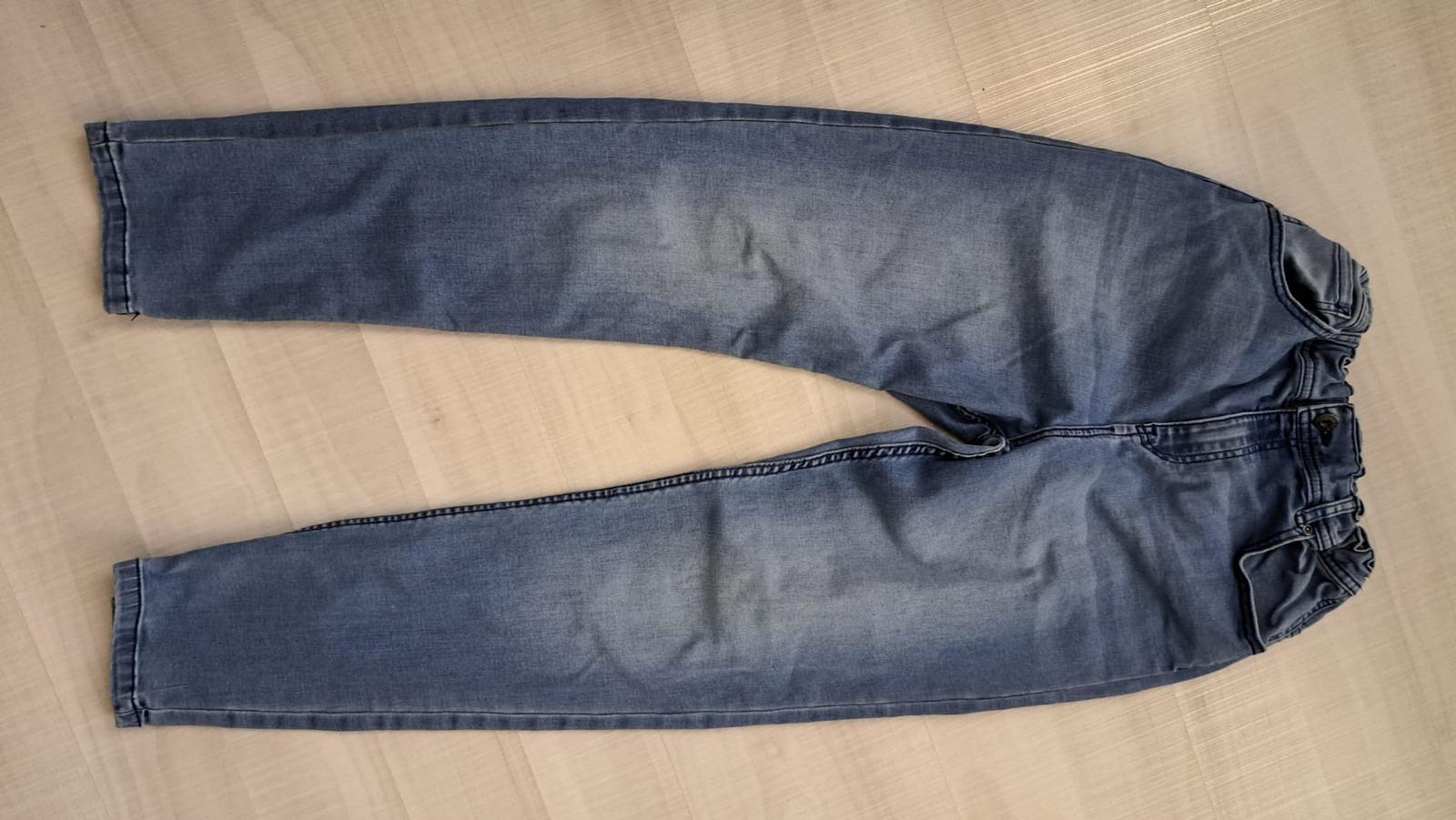 Predám rifle po synovi, nosené jednu sezónu. Dobrý stav, kolená nevyšúchane, v páse sa dajú nastaviť gumičkou a gombíkom. Veľkosť 158. Rozmery: Dĺžka 90 cm, dĺžka od rozkroku 65 cm. Pás sa dá nati...