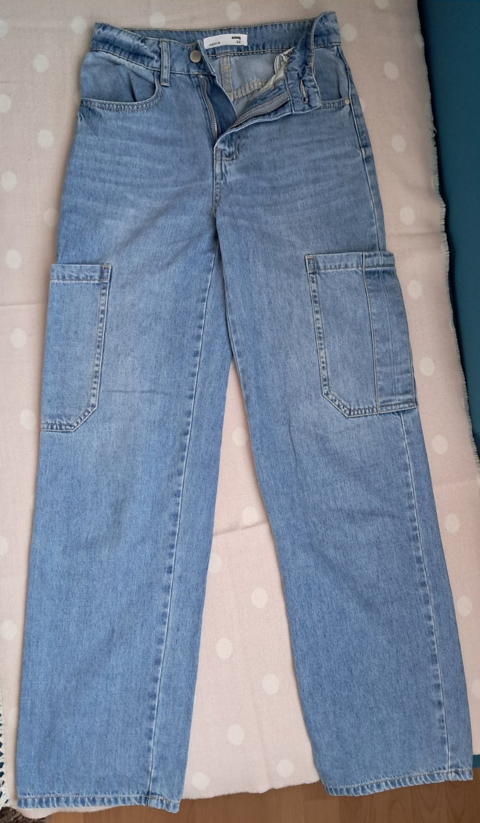 Pekne moderne pohodlne siroke rifle pre baby, 32, dlzka na vysku cca 160-170 cm, vrecka vzadu aj po bokoch. Velmi šik. Bez poskodenia.