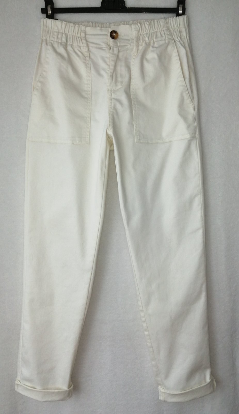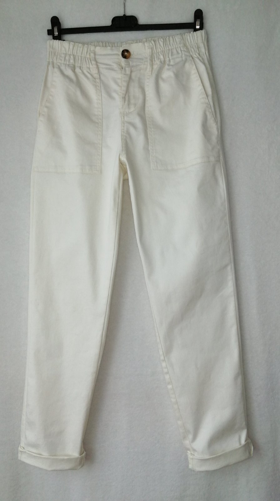 Pohodlné nohavice zn. Reserved, veľkosť 38 alebo M. Príjemný veľmi pohodlný strih v páse na gumičku, možnosť medzi pútka vložiť opasok. Materiál Bavlna s elasténom - čiže sa veľmi pohodlné nosia. Farba je krémovoá s nádychom vanilky. Spodok nohavíc som nosila vykasané, ale je možno to klasicky spustiť . Nohavice sú vo výbornom stave, pár-krát oblečené. Cena 9 eur +poštovné