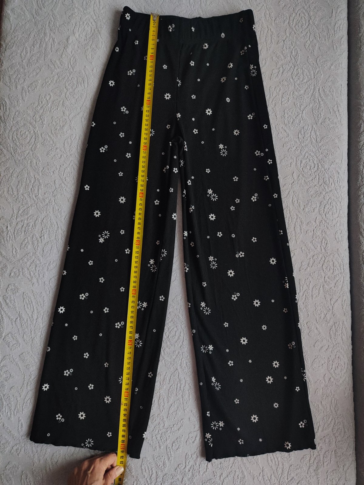 Predám krásne slávnostné tenké letné nohavice, ktoré vďaka širokej nohe vyzerajú ako sukňa. Na spodnej časti je noha rozstrihnutá a zaoblená.