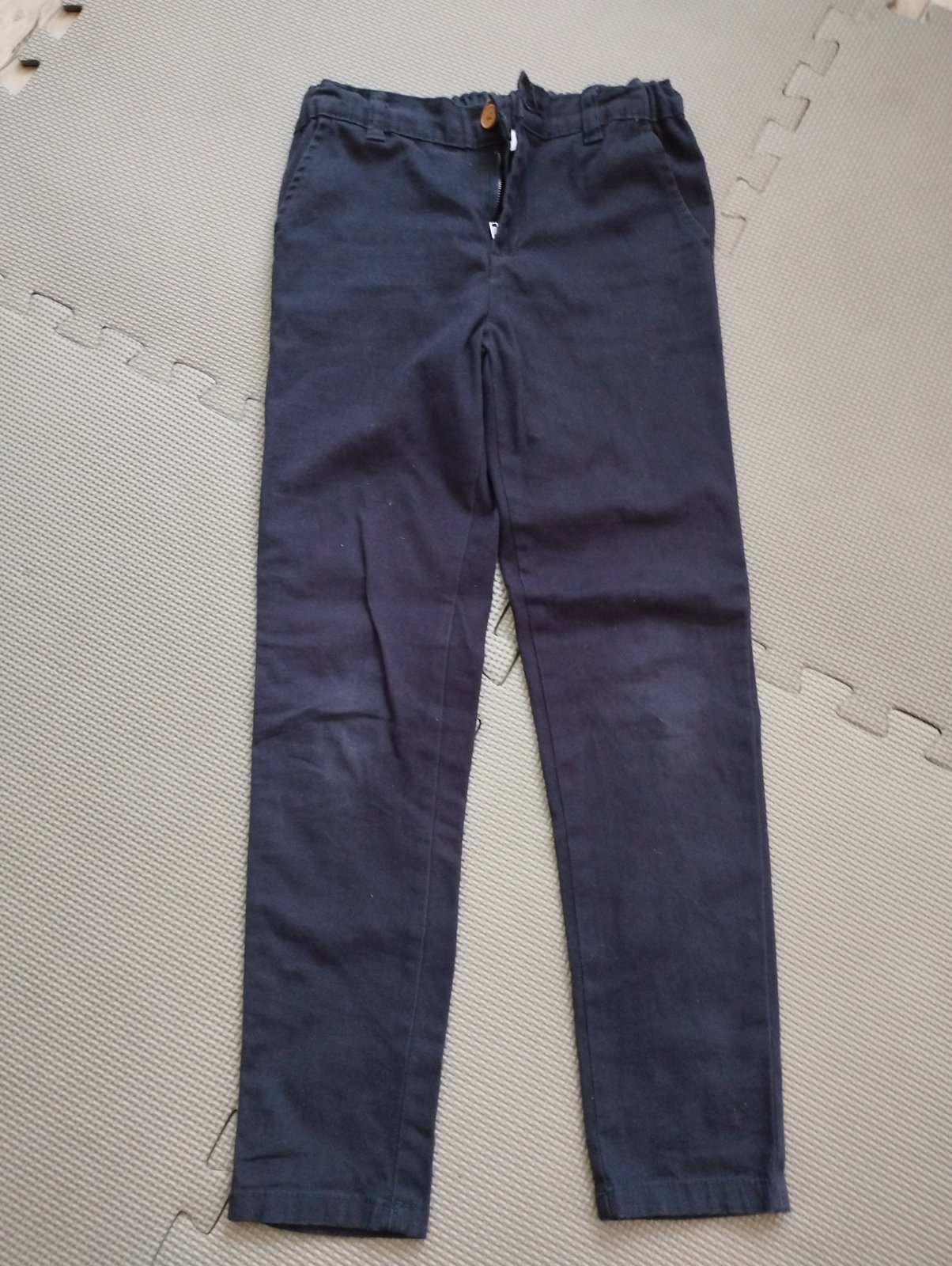 Tmavomodré nohavice v páse na gumu a šnúrky , guma nie je nastaviteľná,,, Nosené málo, ako nové Šírka v páse 31 cm, bočná dĺžka 78 cm, dĺžka od rozkroku dolu 56 cm