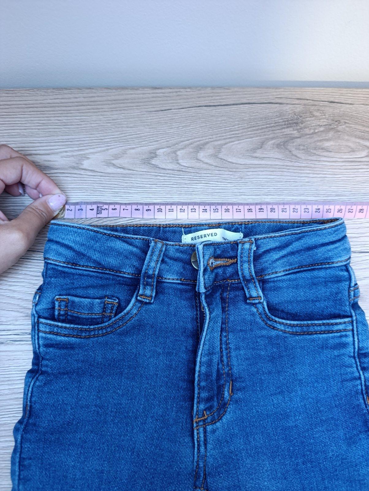 Pekné rifle zn. Reserved, nosené výnimočne v 100% stave. Šírka v páse max. 2x27cm, nastaviteľná gumičkou, celková dĺžka 66cm, dĺžka od rozkroku dole 50cm. Poštovné podľa TP.