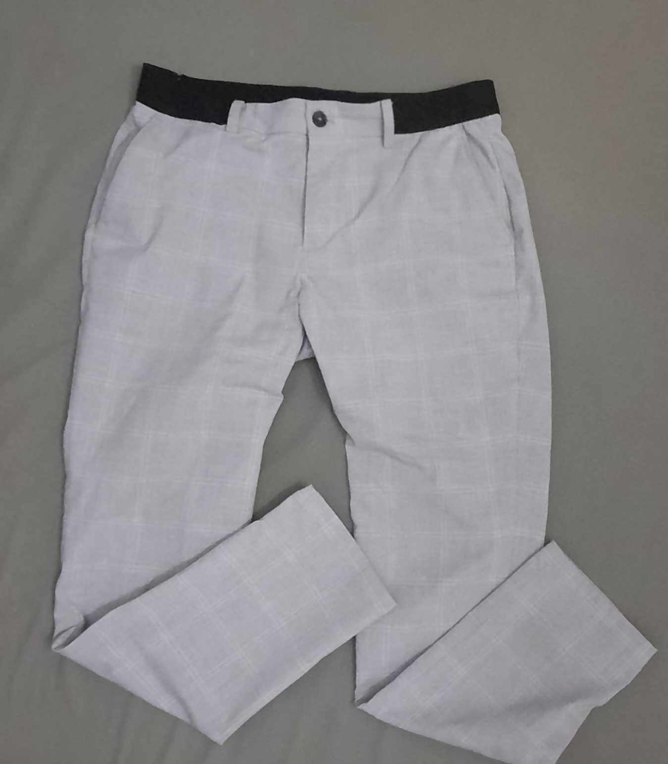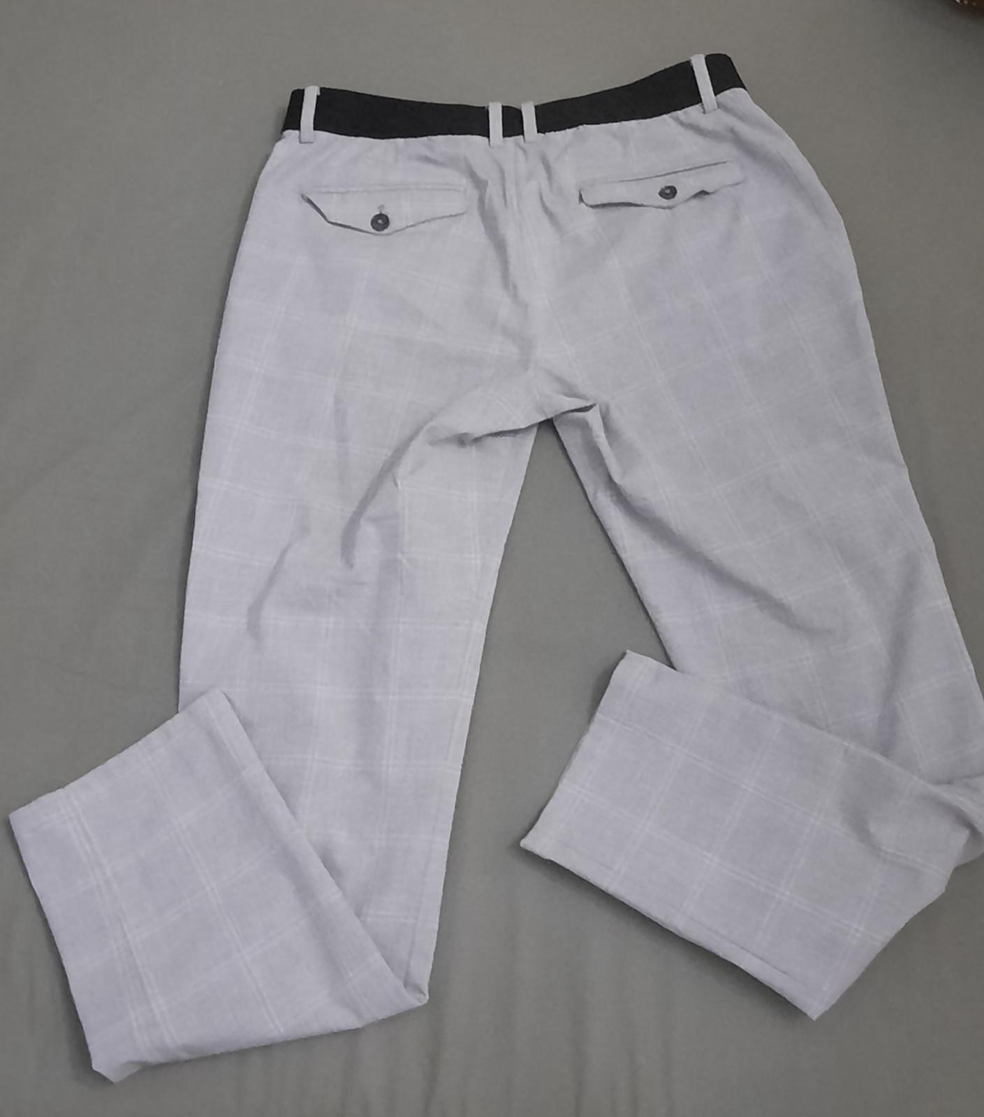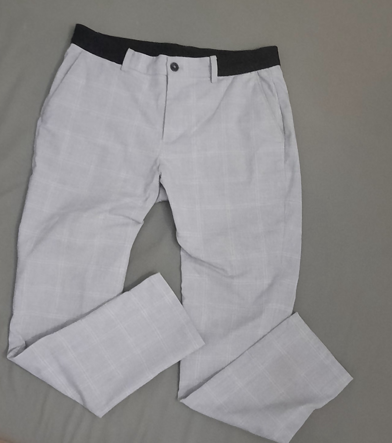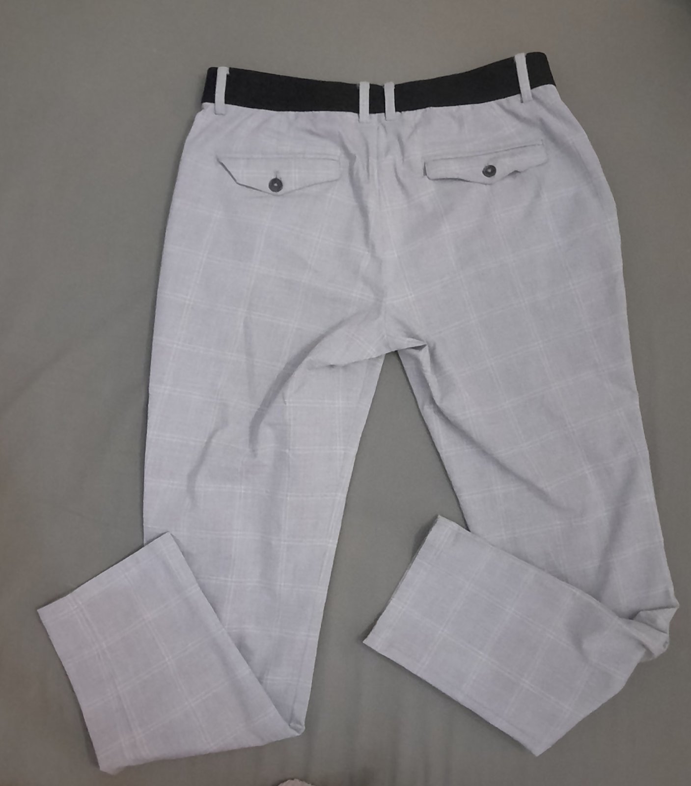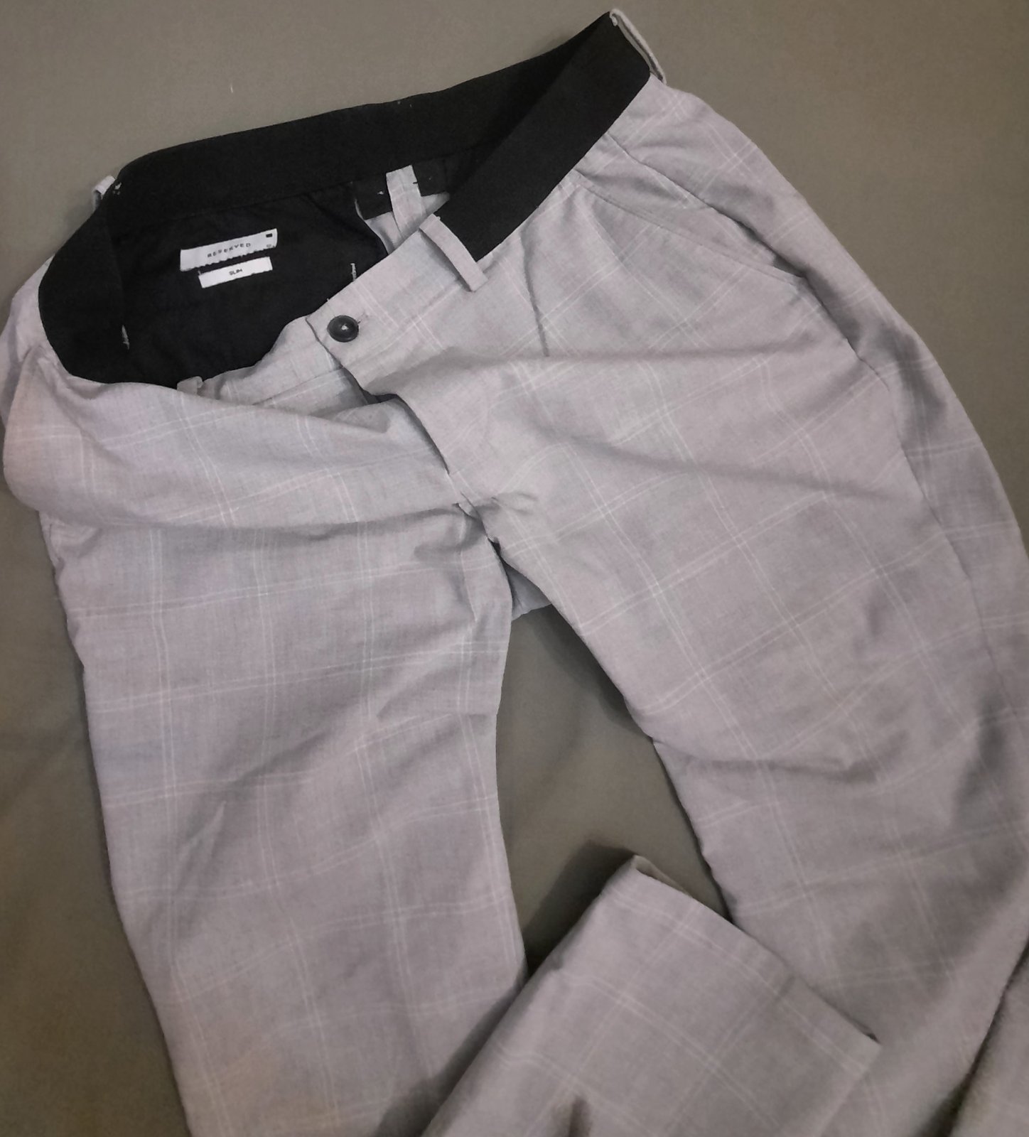 min.nosené, bez poškodenia, rovný strih, jemne strečove, pohodlné, šedá farba károvane