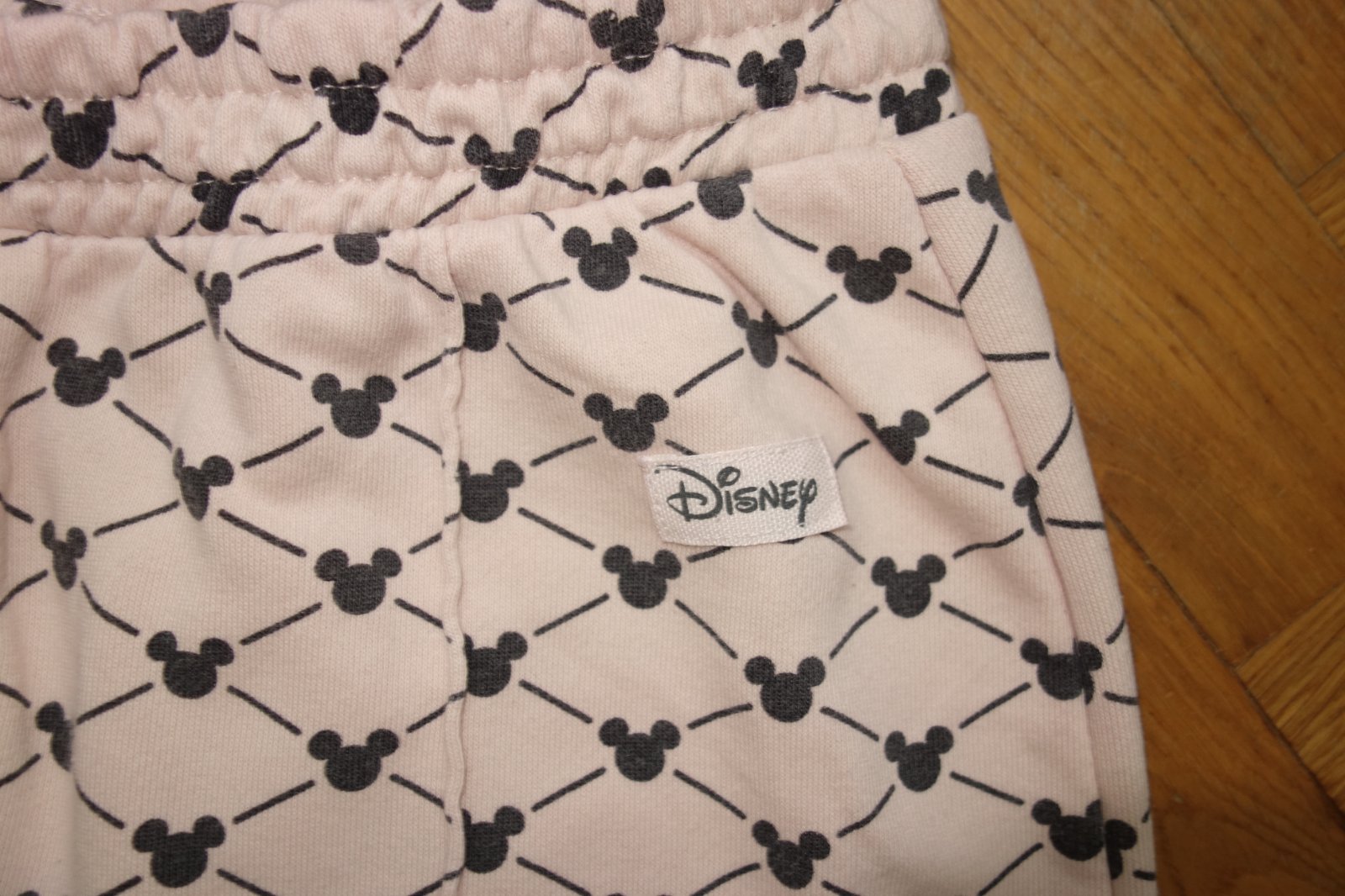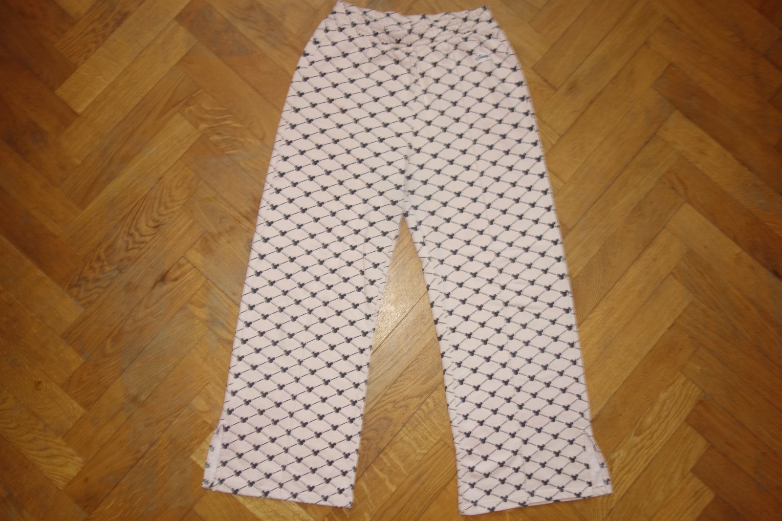 Veľmi dobrý stav. H&M spolupráca s Disney. Široké tepláky, guma v páse, preštepované, potlač Mickey Mousa, tenké, dole rozparky. 62% bavlna, 38% polyester.