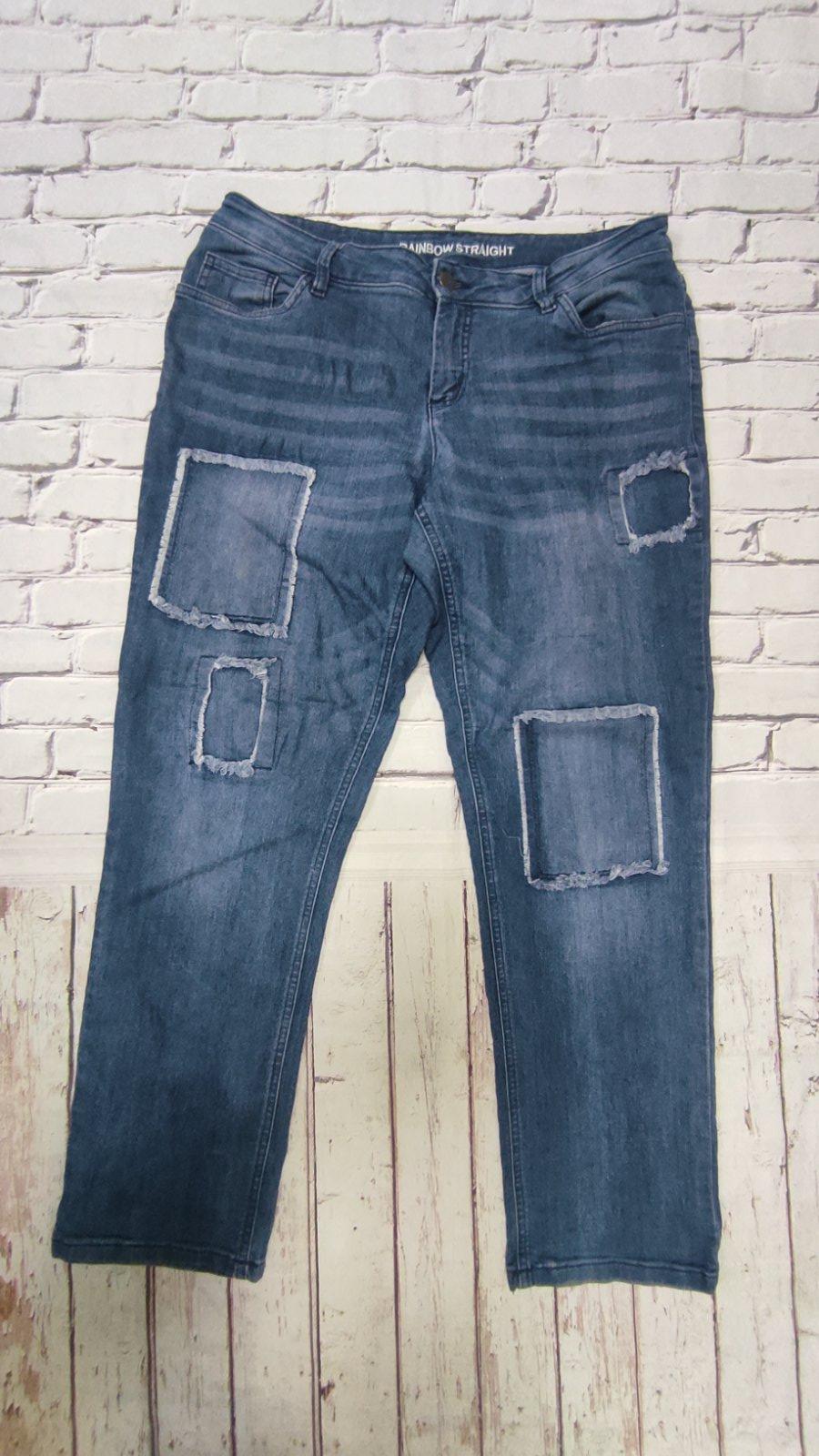 Perfektné pudlové rifle! Veľkosť L, ale kľudne aj do veľk. 44/XXL, sú elastické, treba sa riadiť mierami! Dĺžka - 89 cm, pás - 2x 43/52 cm, boky - 2x 57/65 cm, predný sed - 41 cm, zadný sed - 43 cm.