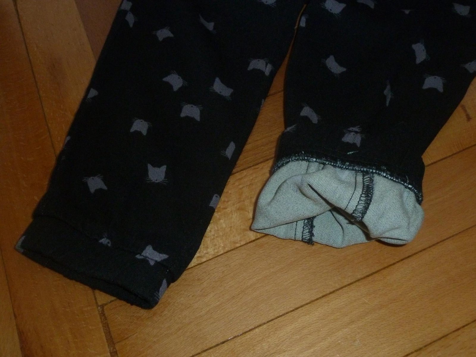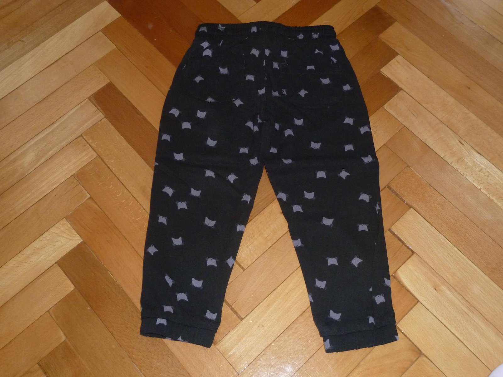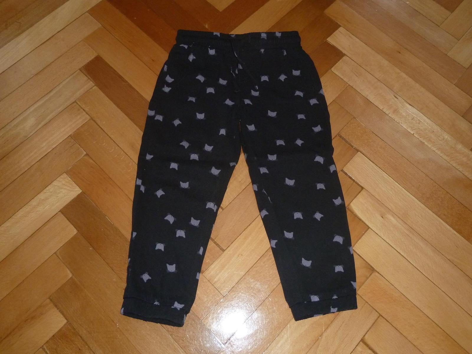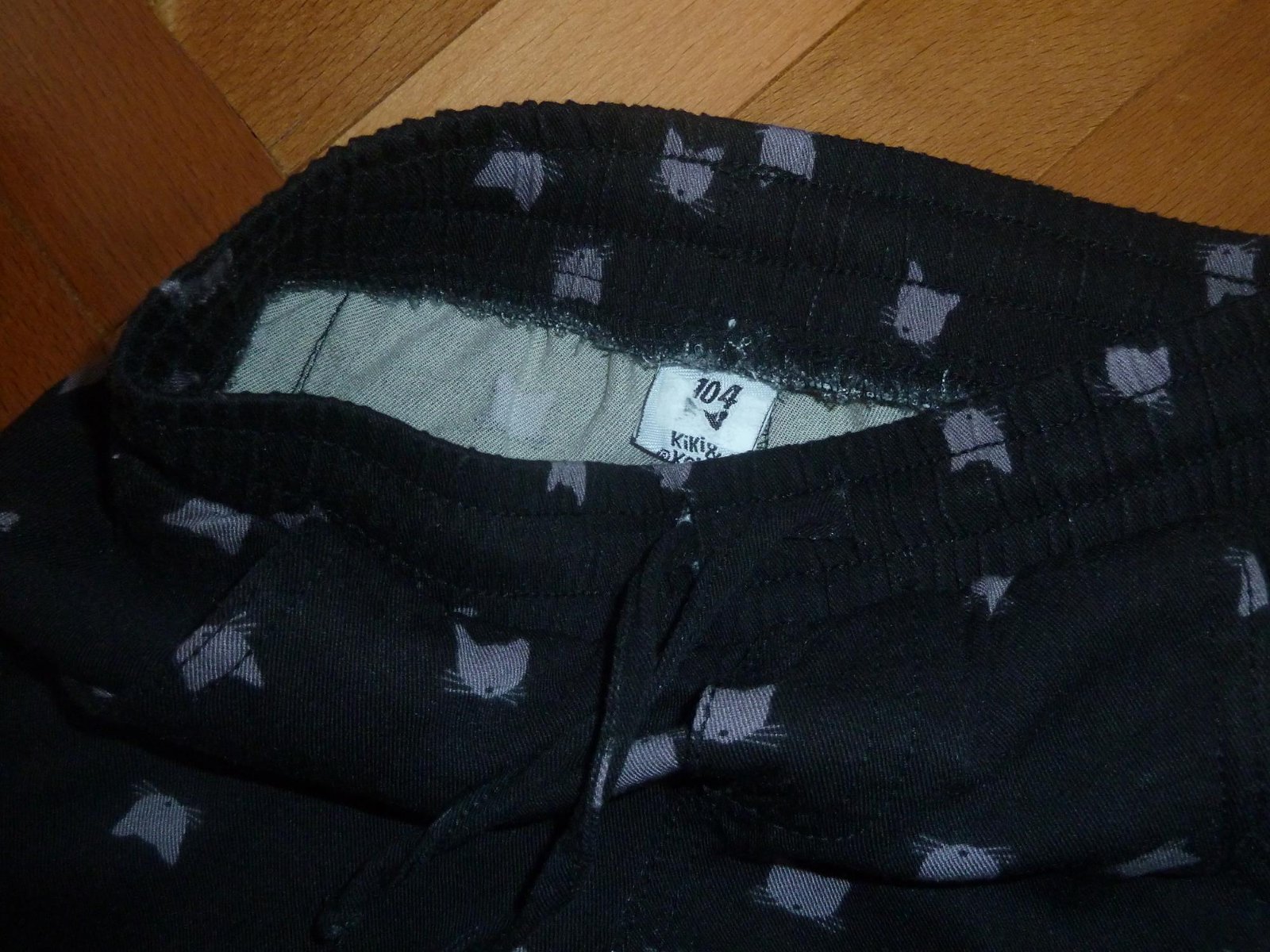 Tenke nohavice s macickami v top stave, par krat oblecene, bez poskodeni, kupovane nove v KIK, v pase guma a snurka na zatiahnutie, vpredu aj vzadu vrecka.