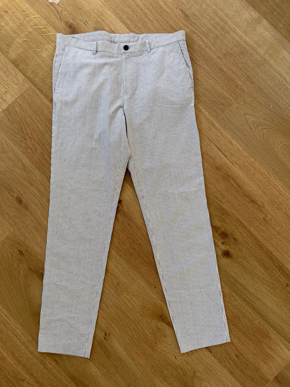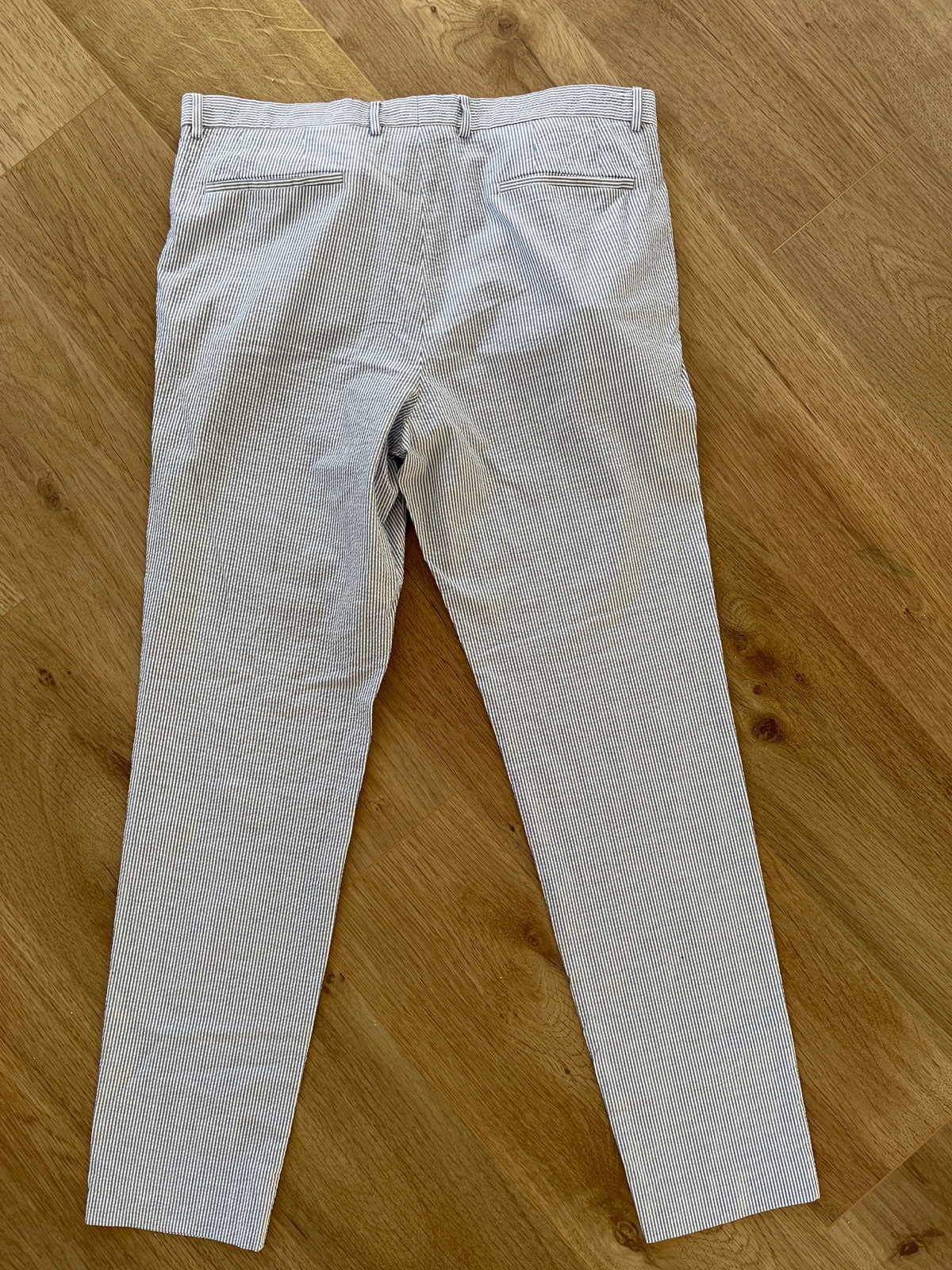 Pánske letné nohavice HB. Veľkosť viď na foto. Farba biela-svetlo modrá pásikavá.