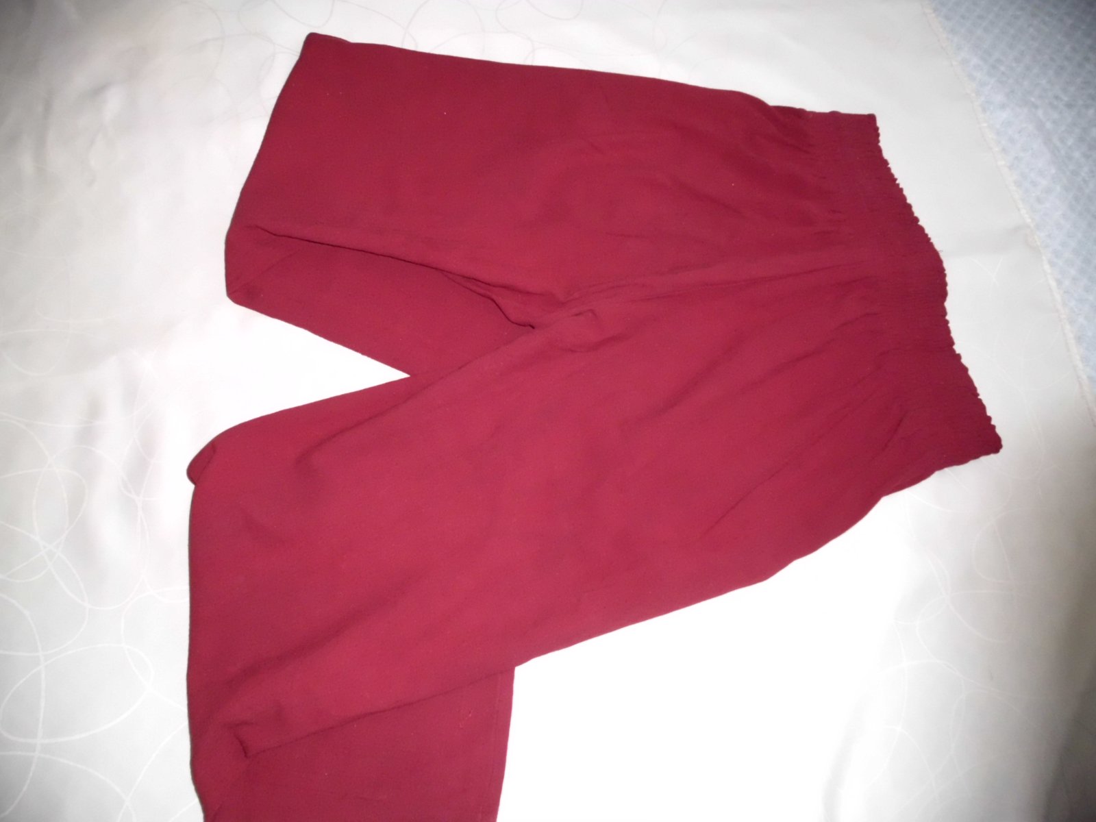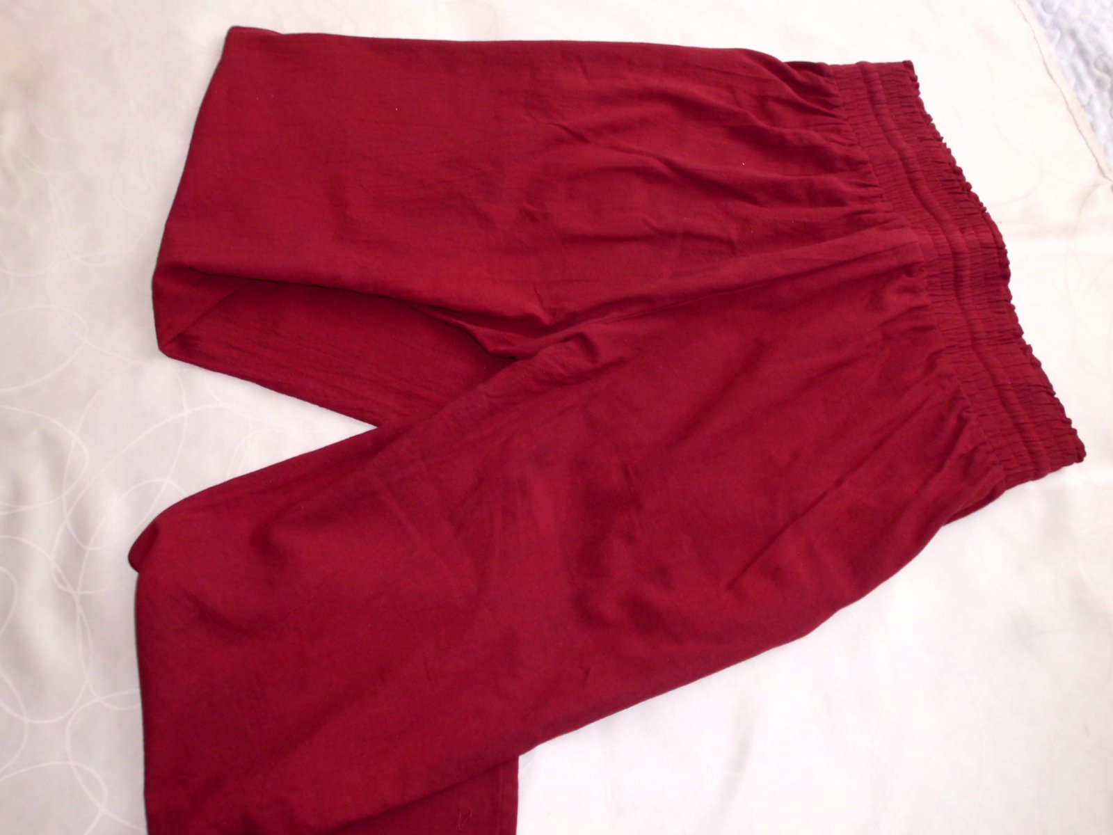 Predám dámske široké letné nohavice , velkosť L-XL , pás širka 42 cm guma natiahne sa , bočná dlžka 104 cm , výška predného sedu 35 cm ,zadný sed 44 cm, spodok š. 29 cm, stehno 32 cm, 2 predné vrecká , príjemná látka 20% ľan, bordová farba , raz prané, top 100% stav