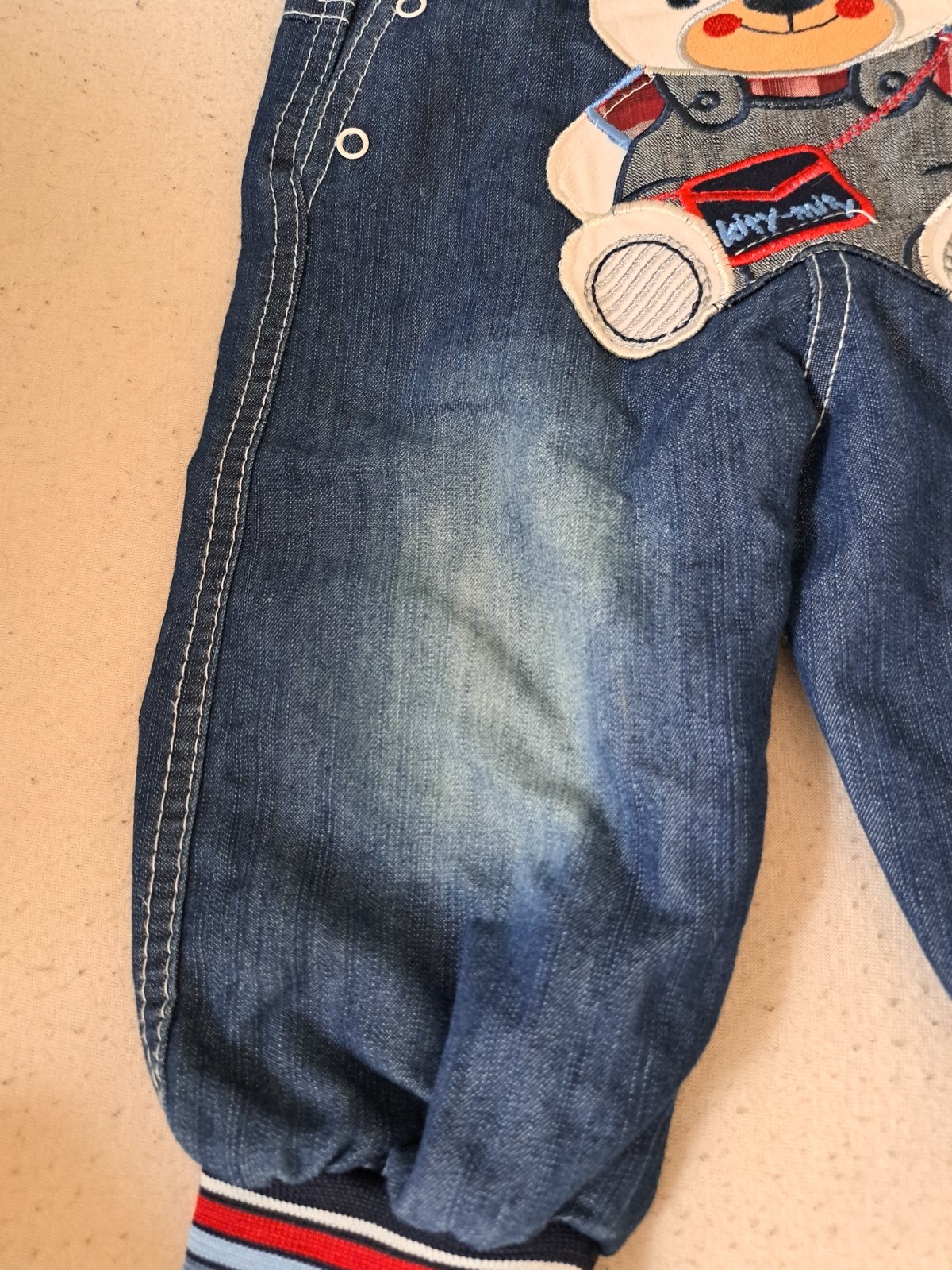 Modré nohavice na traky s medvedíkom